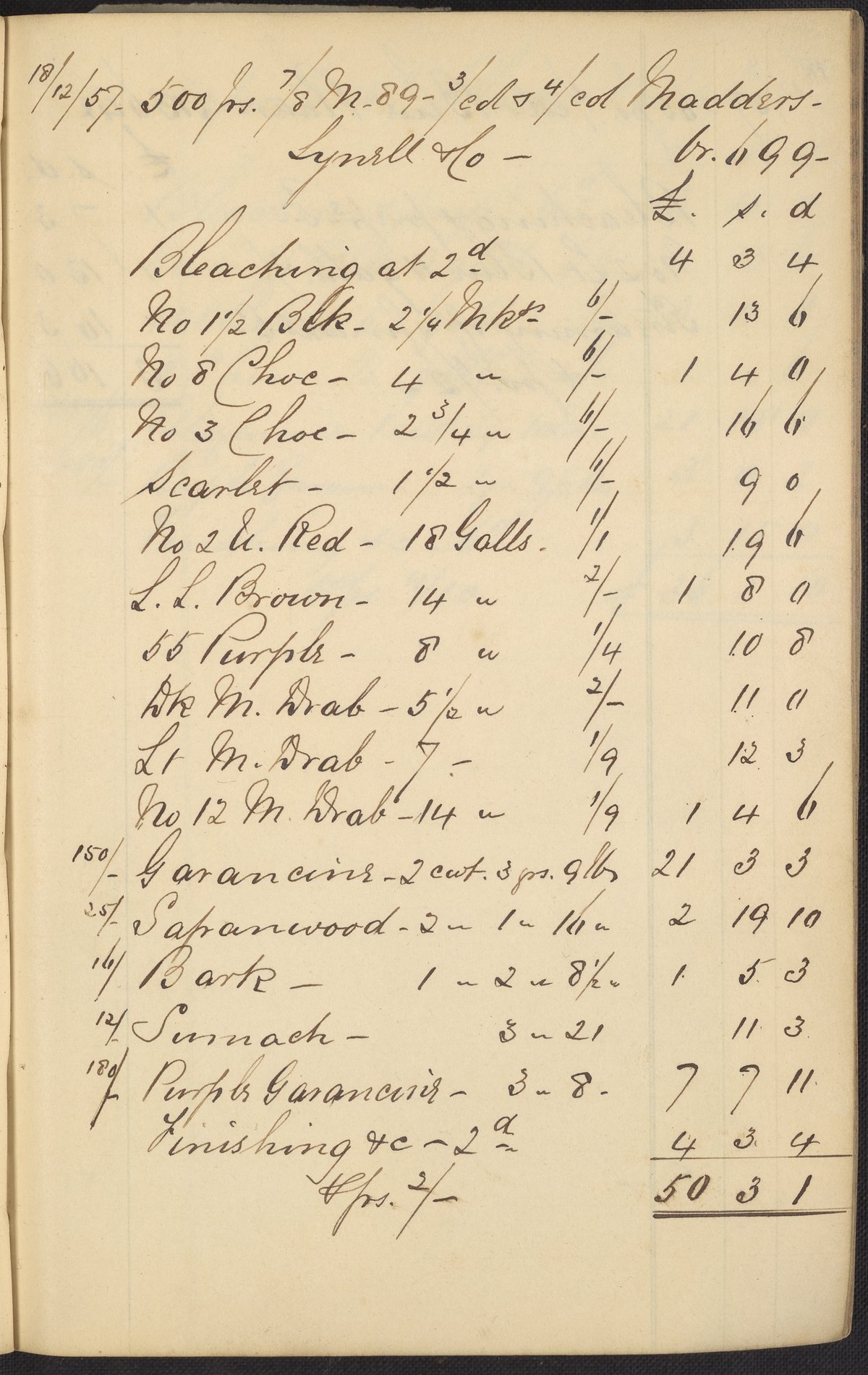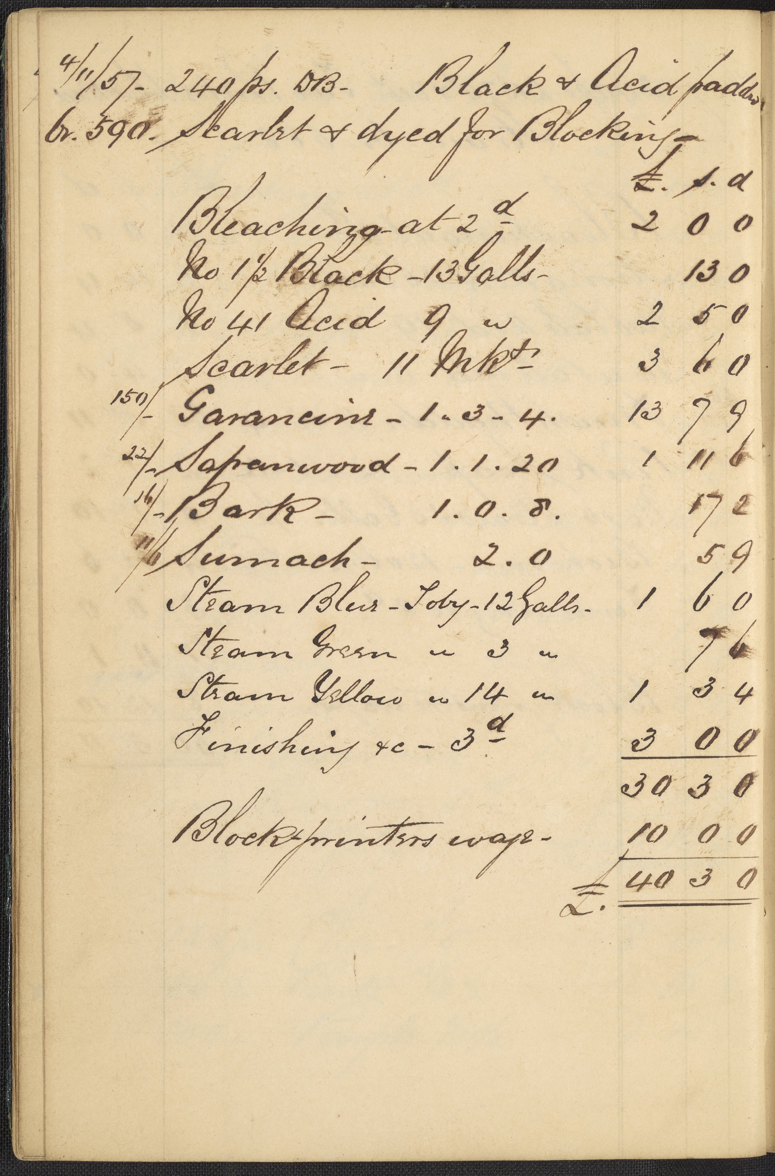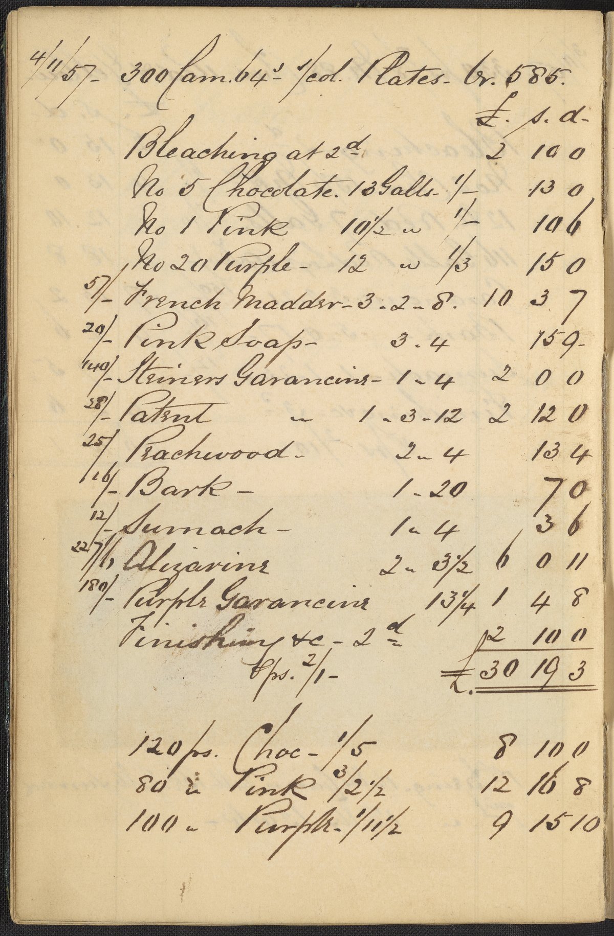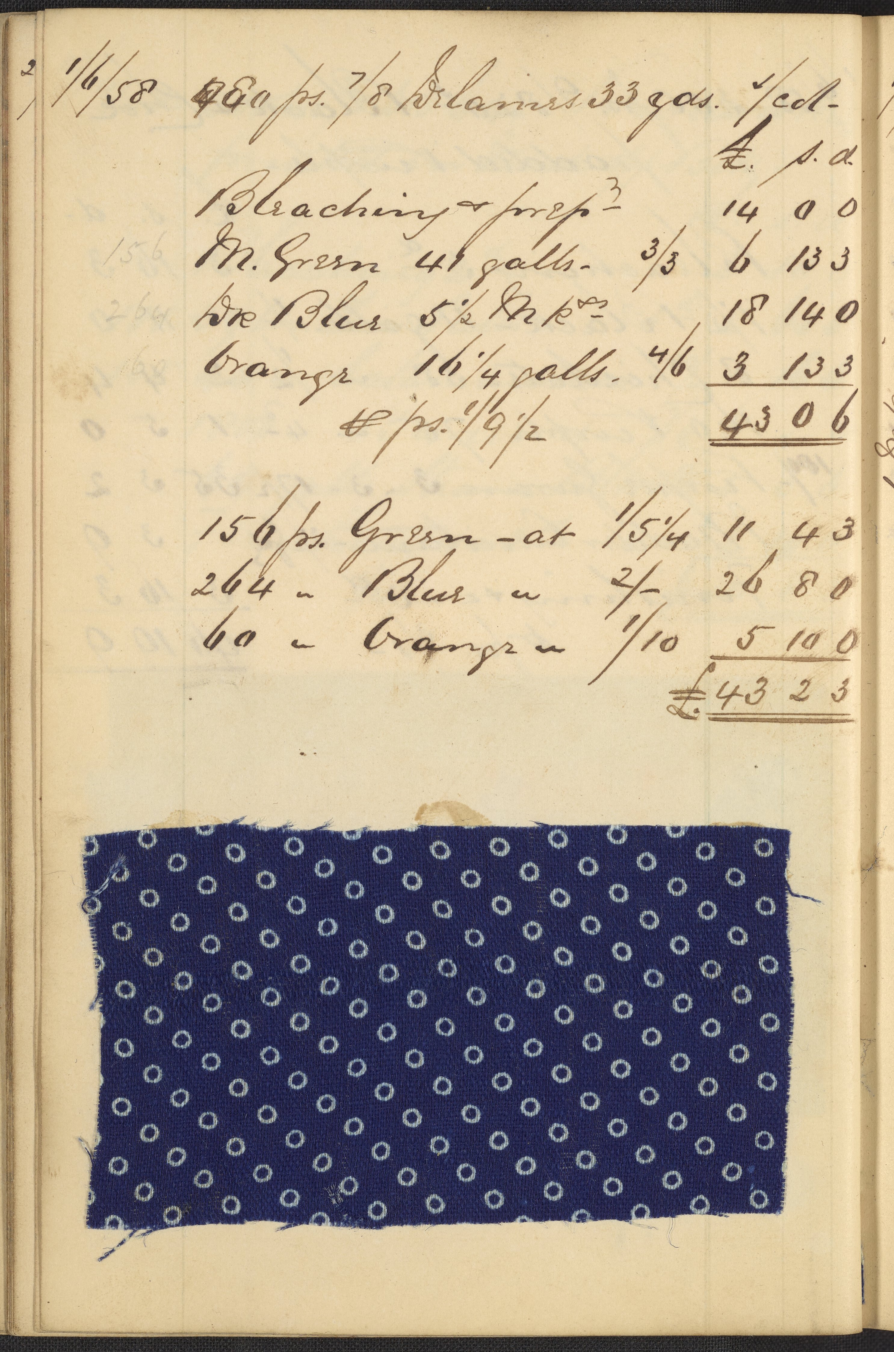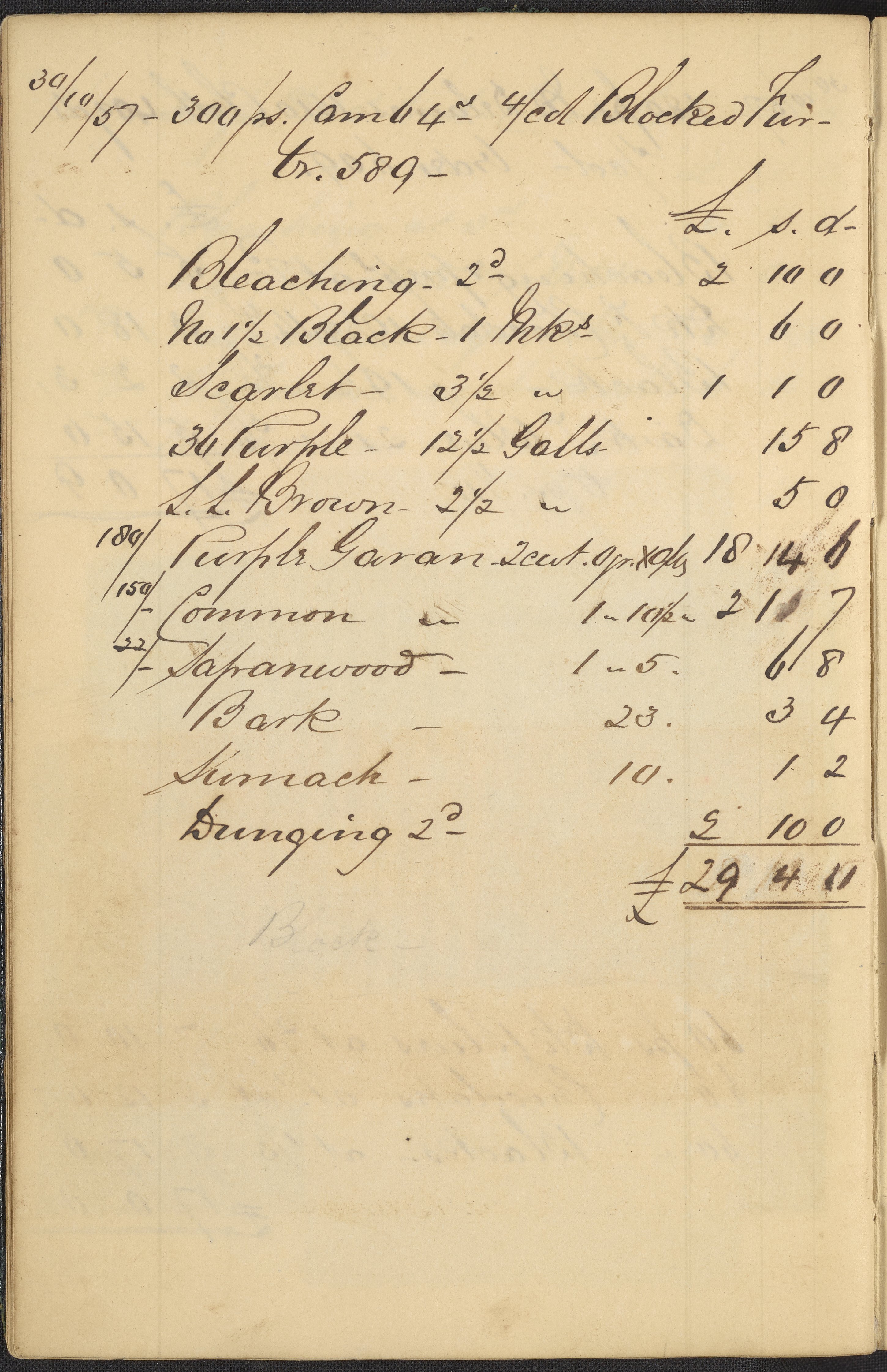 Small JPG1200 x 1808px — 672 KBLarge JPG2880 x 4339px — 3.2 MBFull-sized JPG2946 x 4438px — 3.4 MBOriginal fileTIFF — 2946 x 4438px — 37.5 MBThe first of two highly legible British dyer's account journals. The journal lists recipes and the costs for materials used in the process of dyeing many kinds of cloth, "gum china blue," "sumac," "peachwood," etc. These works were compiled before and during the introduction of aniline dye; most of the recipes include only dyestuffs originating from vegetable or insect matter, however, select recipes in this volume include mauve, the first synthetic dye.