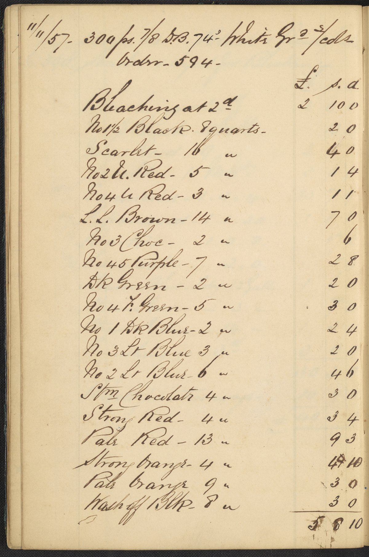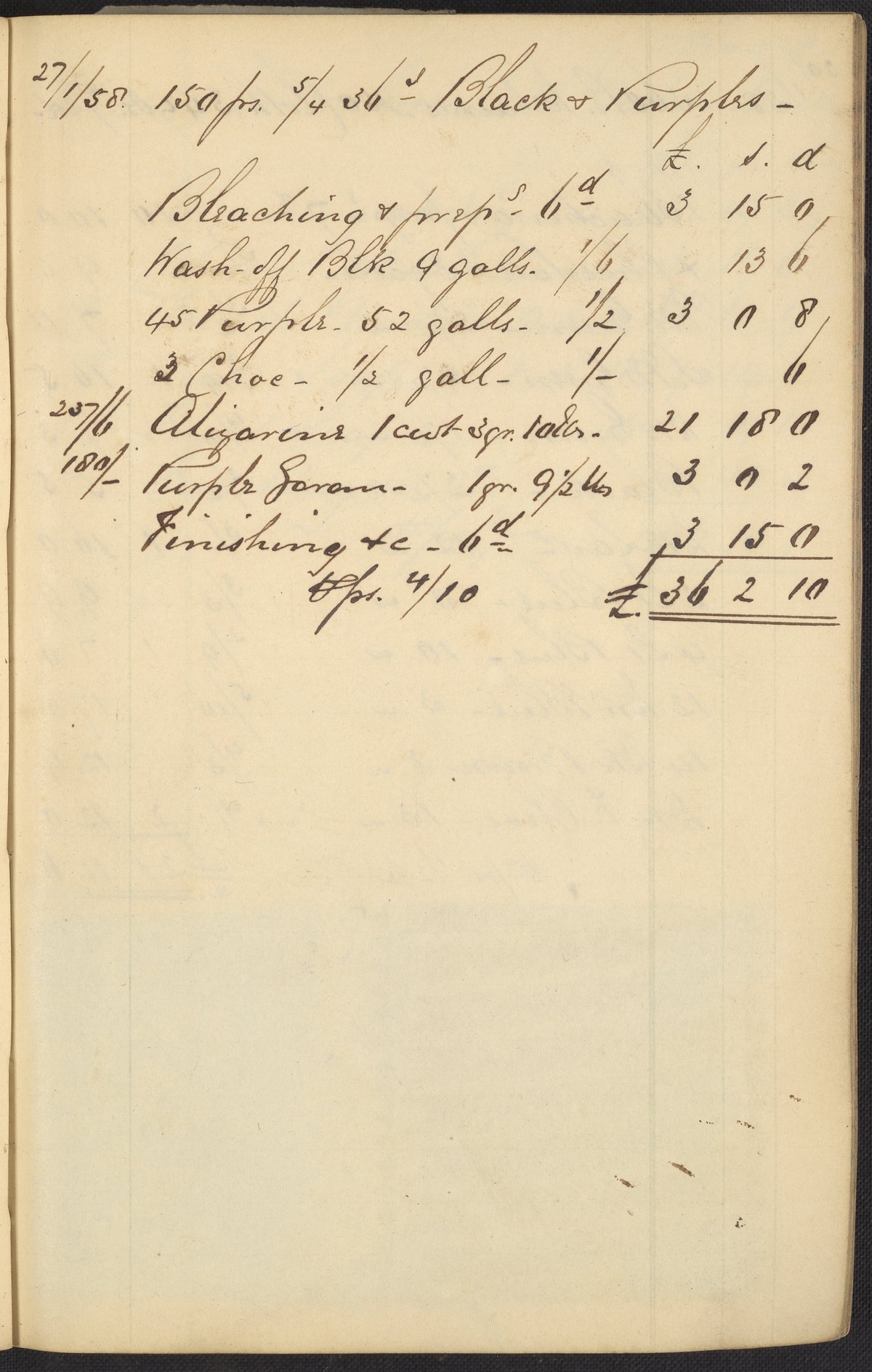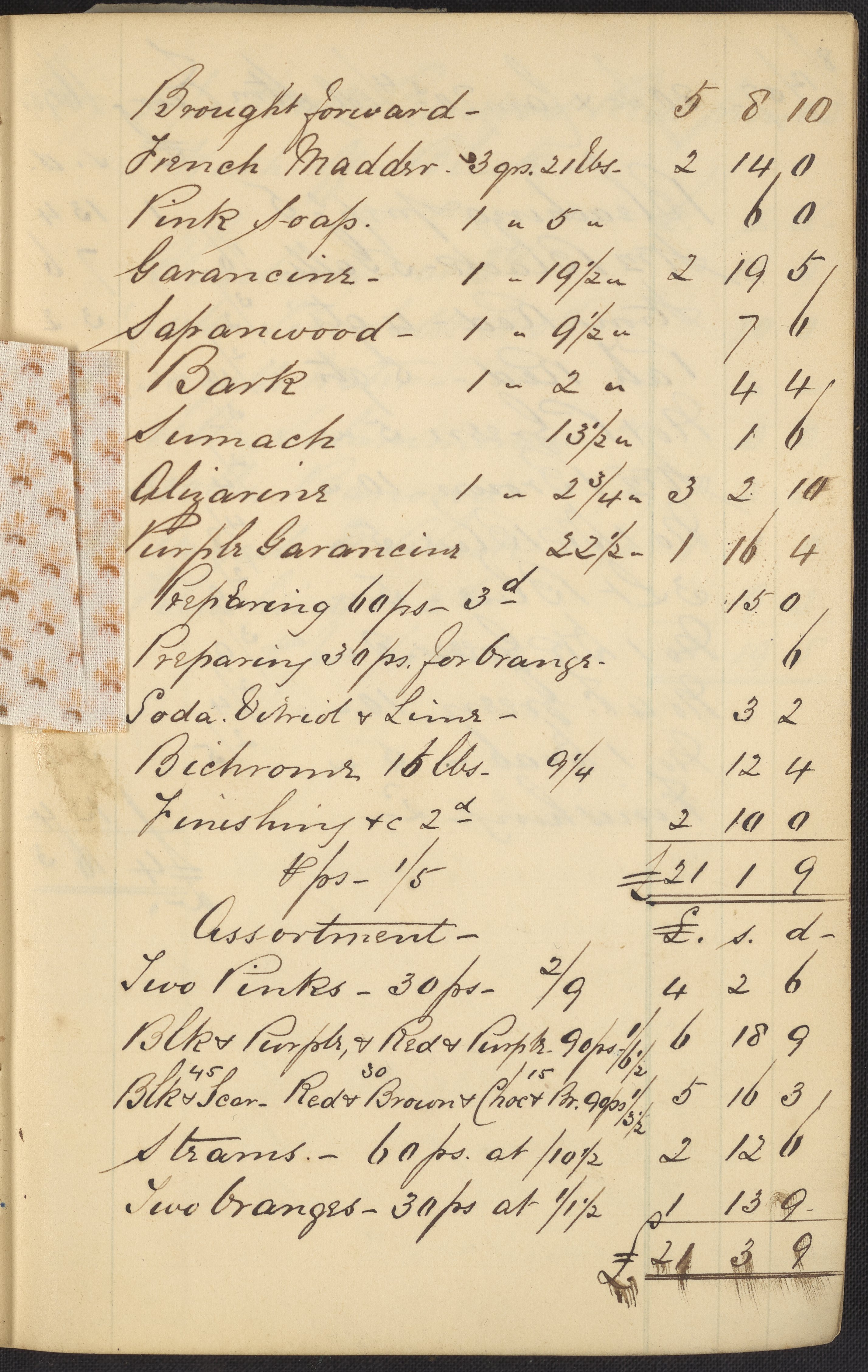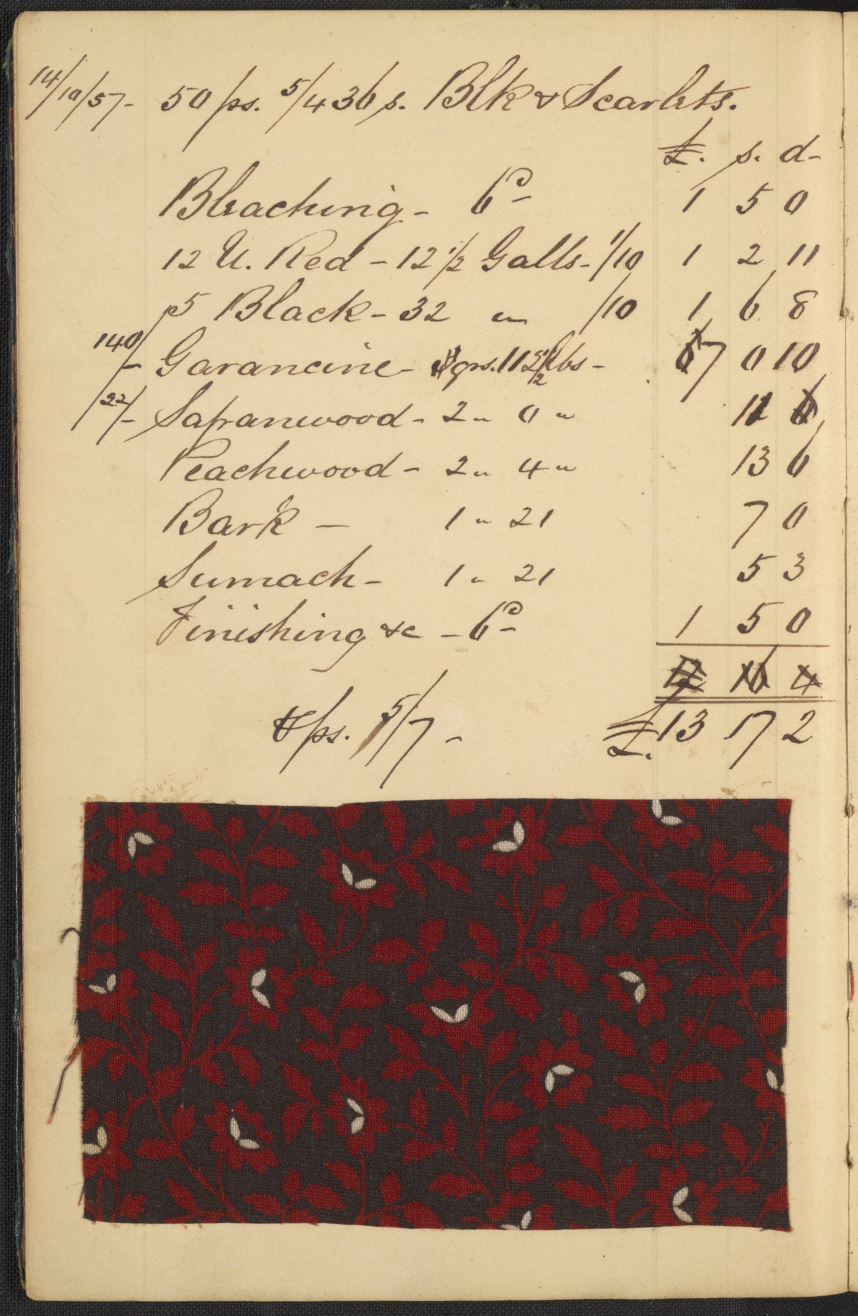 Small JPG1200 x 1808px — 672 KBLarge JPG2880 x 4339px — 3.2 MBFull-sized JPG2946 x 4438px — 3.4 MBOriginal fileTIFF — 2946 x 4438px — 37.5 MBThe first of two highly legible British dyer's account journals. The journal lists recipes and the costs for materials used in the process of dyeing many kinds of cloth, "gum china blue," "sumac," "peachwood," etc. These works were compiled before and during the introduction of aniline dye; most of the recipes include only dyestuffs originating from vegetable or insect matter, however, select recipes in this volume include mauve, the first synthetic dye.