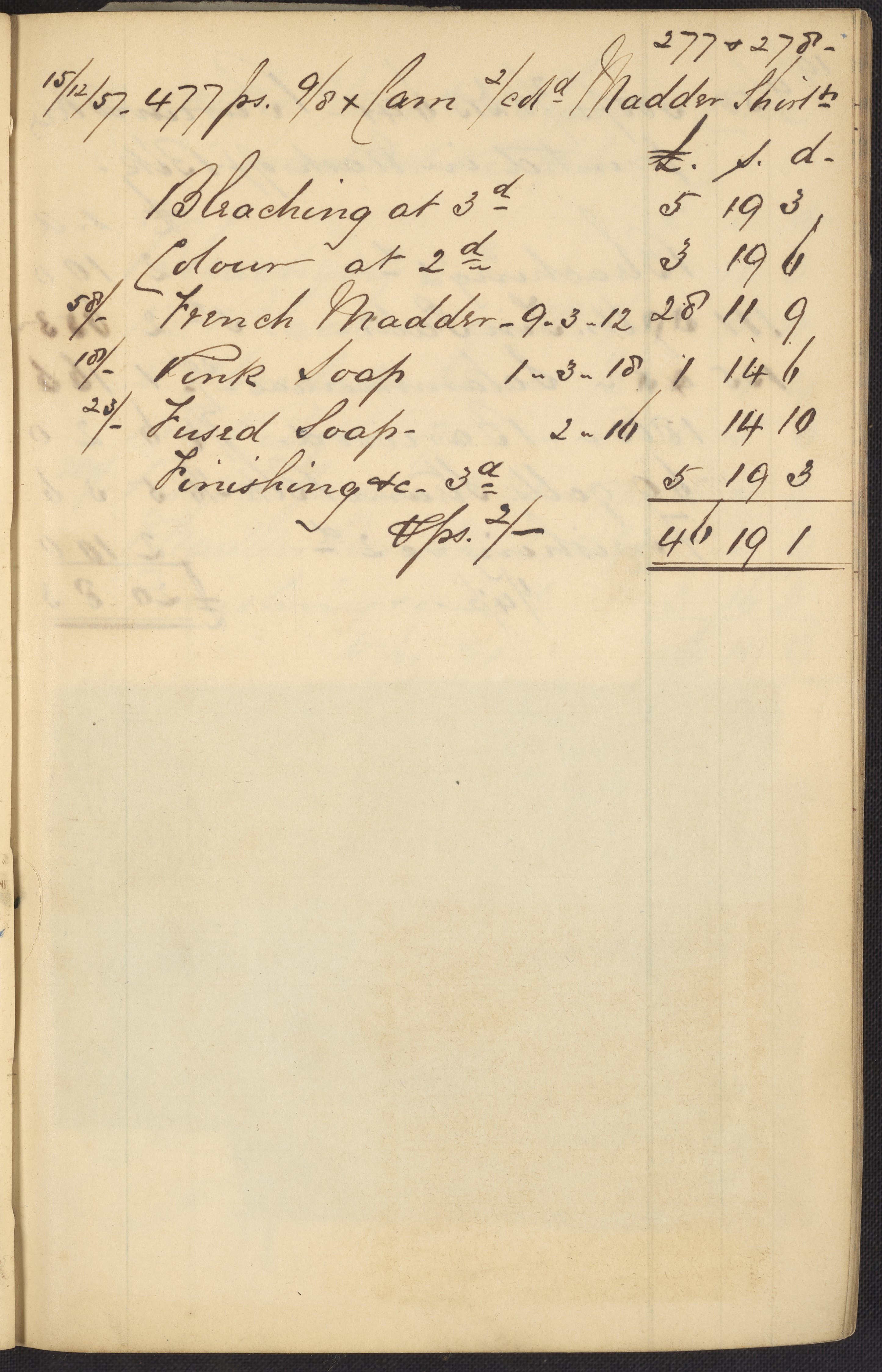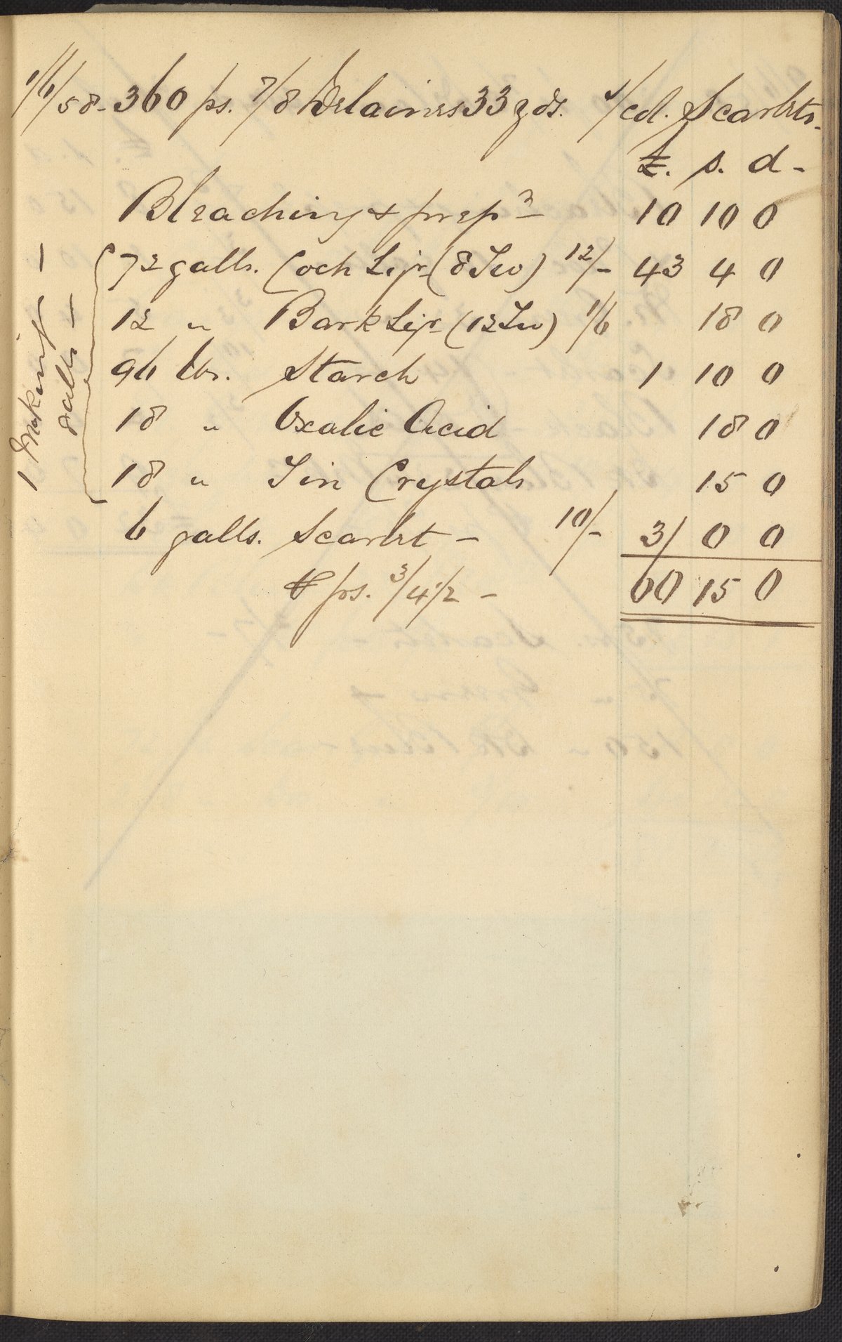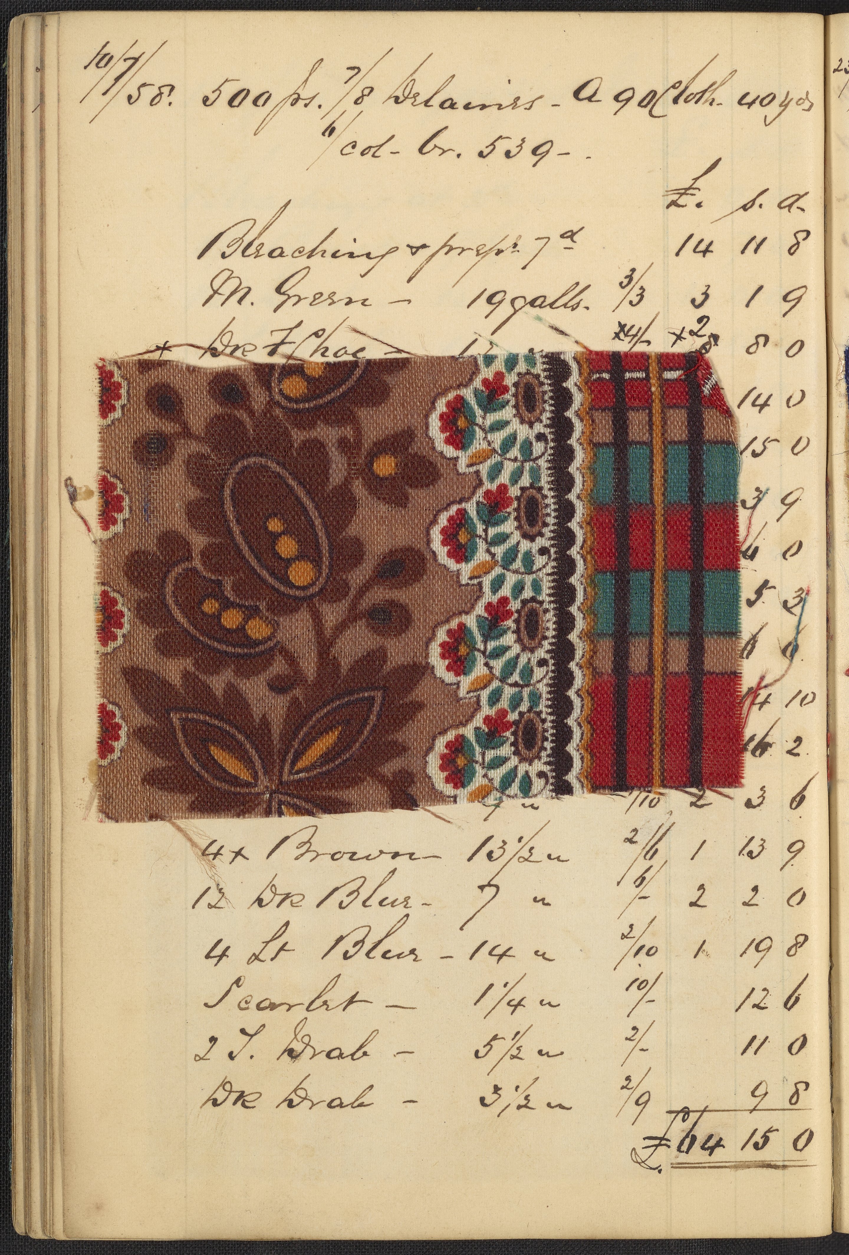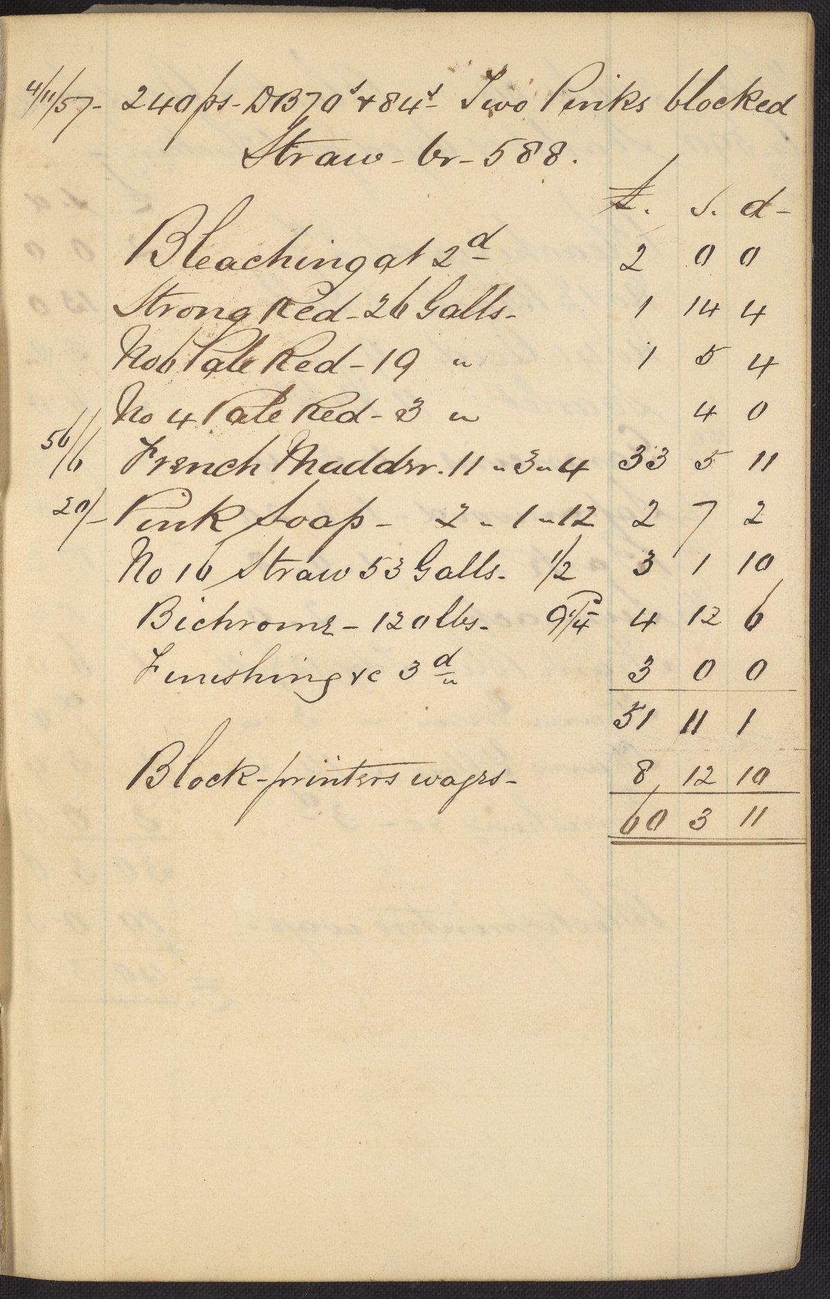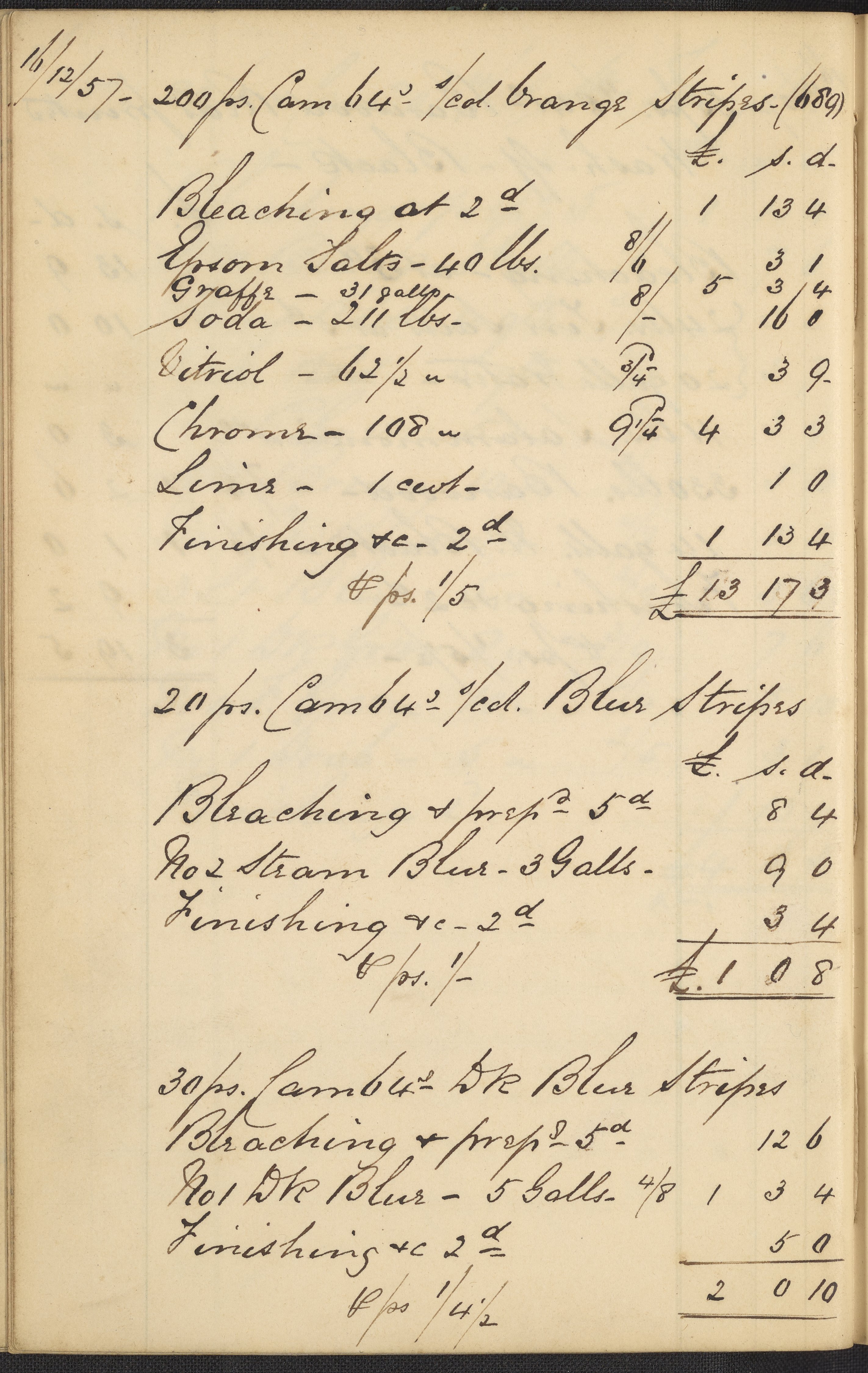 Small JPG1200 x 1808px — 672 KBLarge JPG2880 x 4339px — 3.2 MBFull-sized JPG2946 x 4438px — 3.4 MBOriginal fileTIFF — 2946 x 4438px — 37.5 MBThe first of two highly legible British dyer's account journals. The journal lists recipes and the costs for materials used in the process of dyeing many kinds of cloth, "gum china blue," "sumac," "peachwood," etc. These works were compiled before and during the introduction of aniline dye; most of the recipes include only dyestuffs originating from vegetable or insect matter, however, select recipes in this volume include mauve, the first synthetic dye.