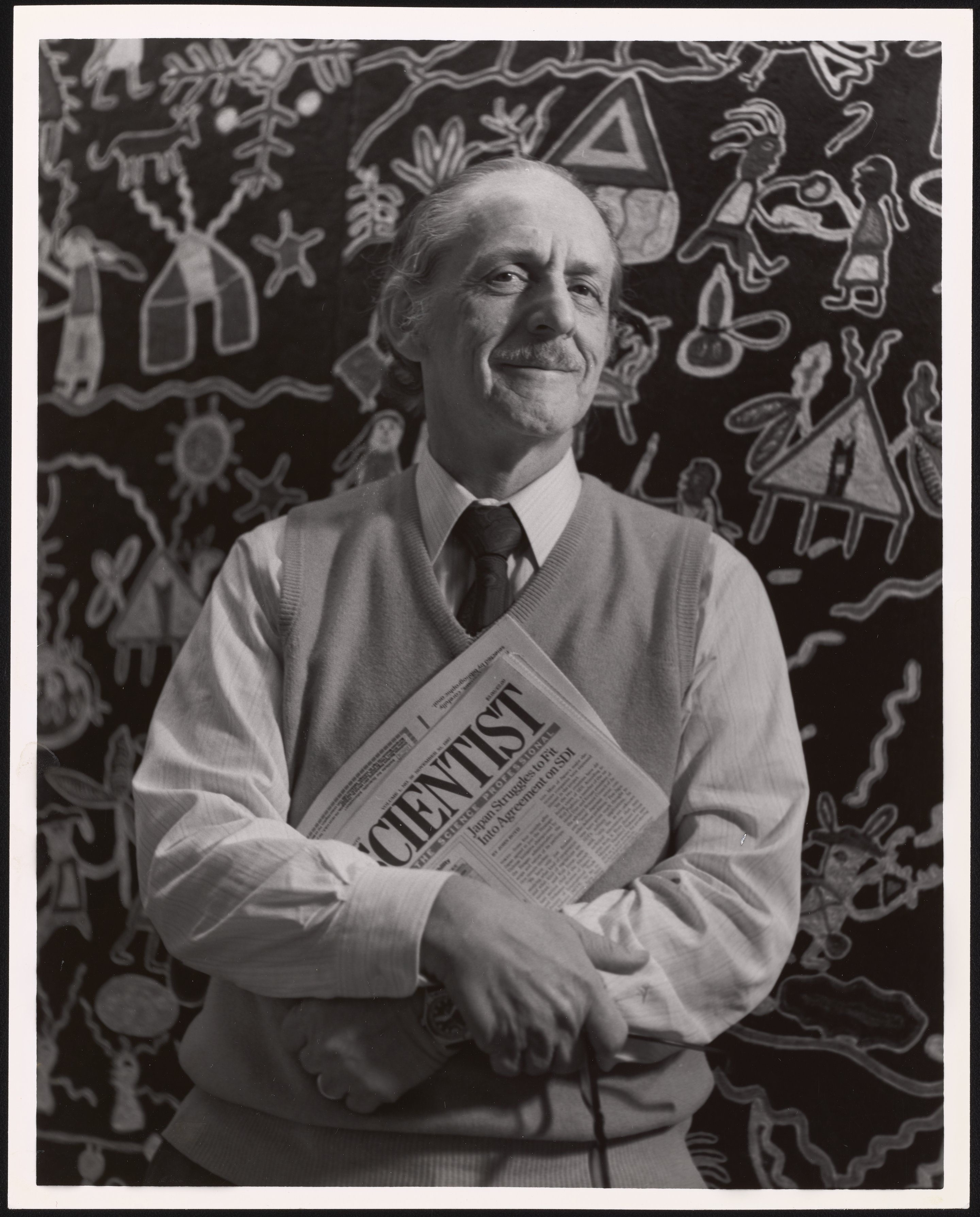 Black and white photograph of Eugene Garfield (1925-2017) standing against a patterned wallpaper and holding an issue of The Scientist, a monthly magazine founded by Garfield in 1986. The monthly publication sought to report news of interest to the scientific community. According to Garfield, “As I see it, there is a need for a publication that supplies news about the economics and financing of science, as well as science policy, regulatory issues, and the ethical debates of science. Also needed is more coverage of personalities, as well as news about research grants, forthcoming meetings, awards, and all the other minutiae that make up the lives of working scientists...” The publication was sold several times since its genesis but is still in publication today. Now, the periodical, which is owned and operated by the LabX Media Group, primarily functions as a professional magazine for life scientists.