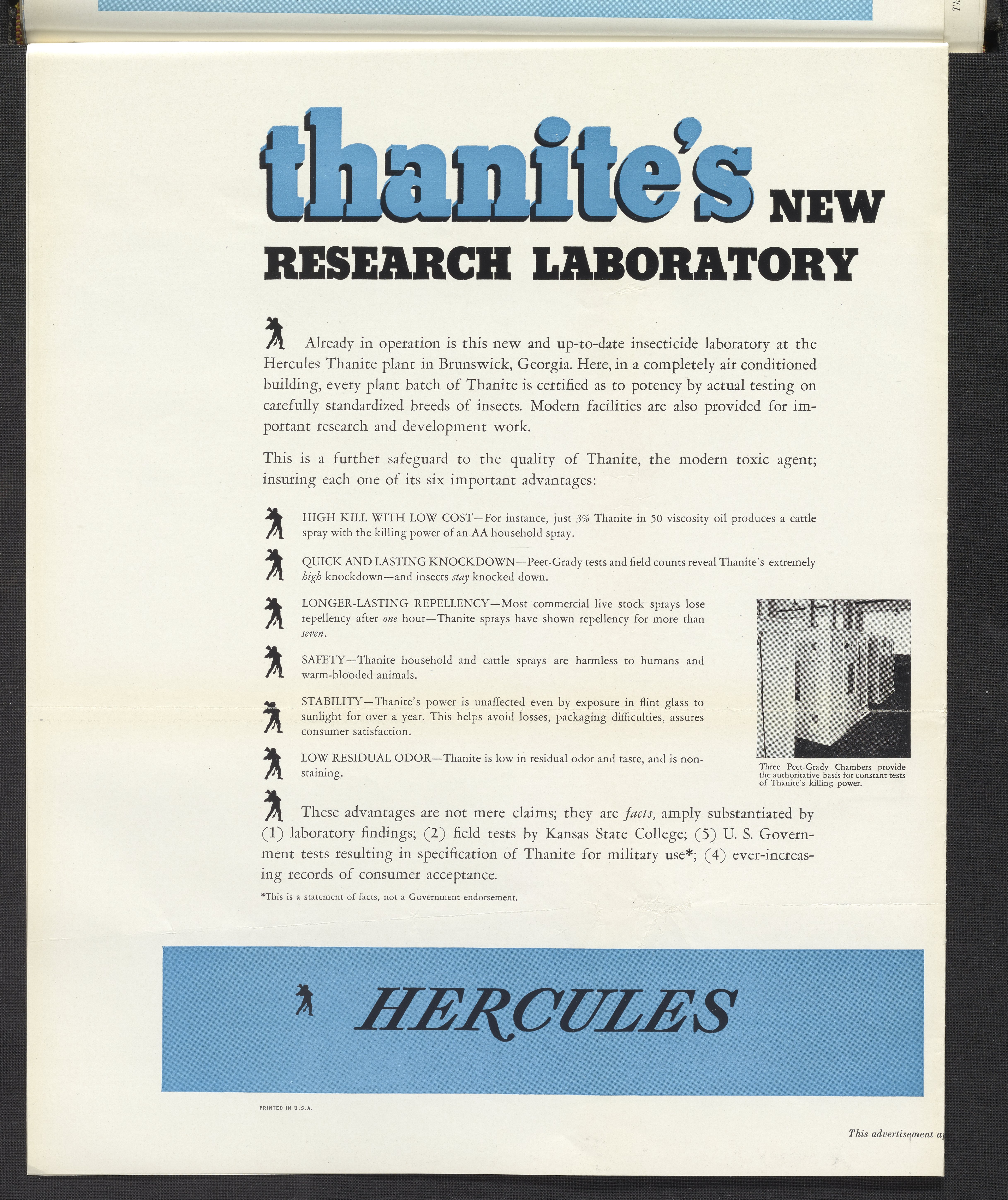 Hercules Incorporated. “Advertisement for Hercules Thanite Insecticide.” 1944 Hercules Advertisements, 1944. Records of Hercules Incorporated, Volume 1944. Science History Institute. Philadelphia. https://digital.sciencehistory.org/works/gb19f667c.