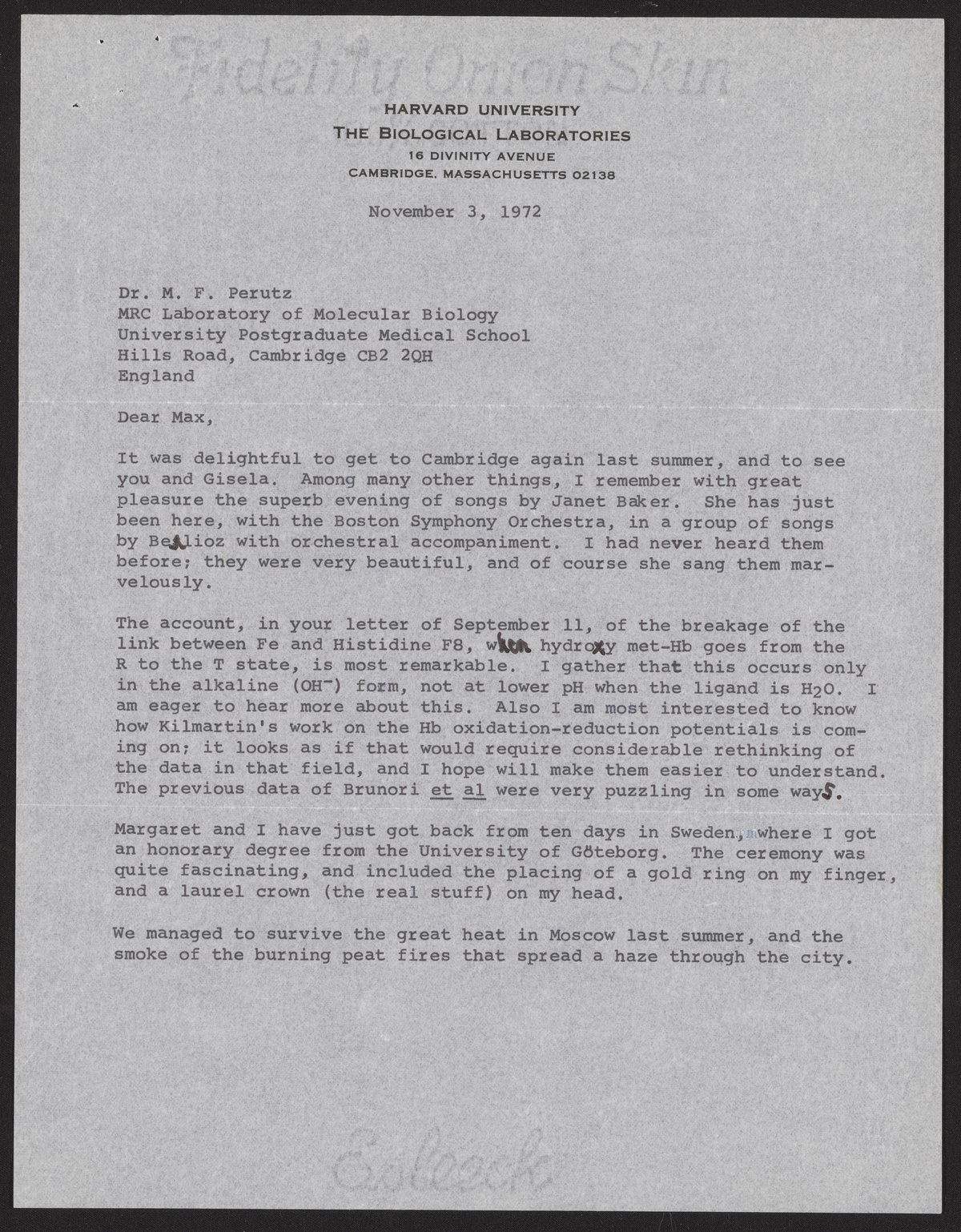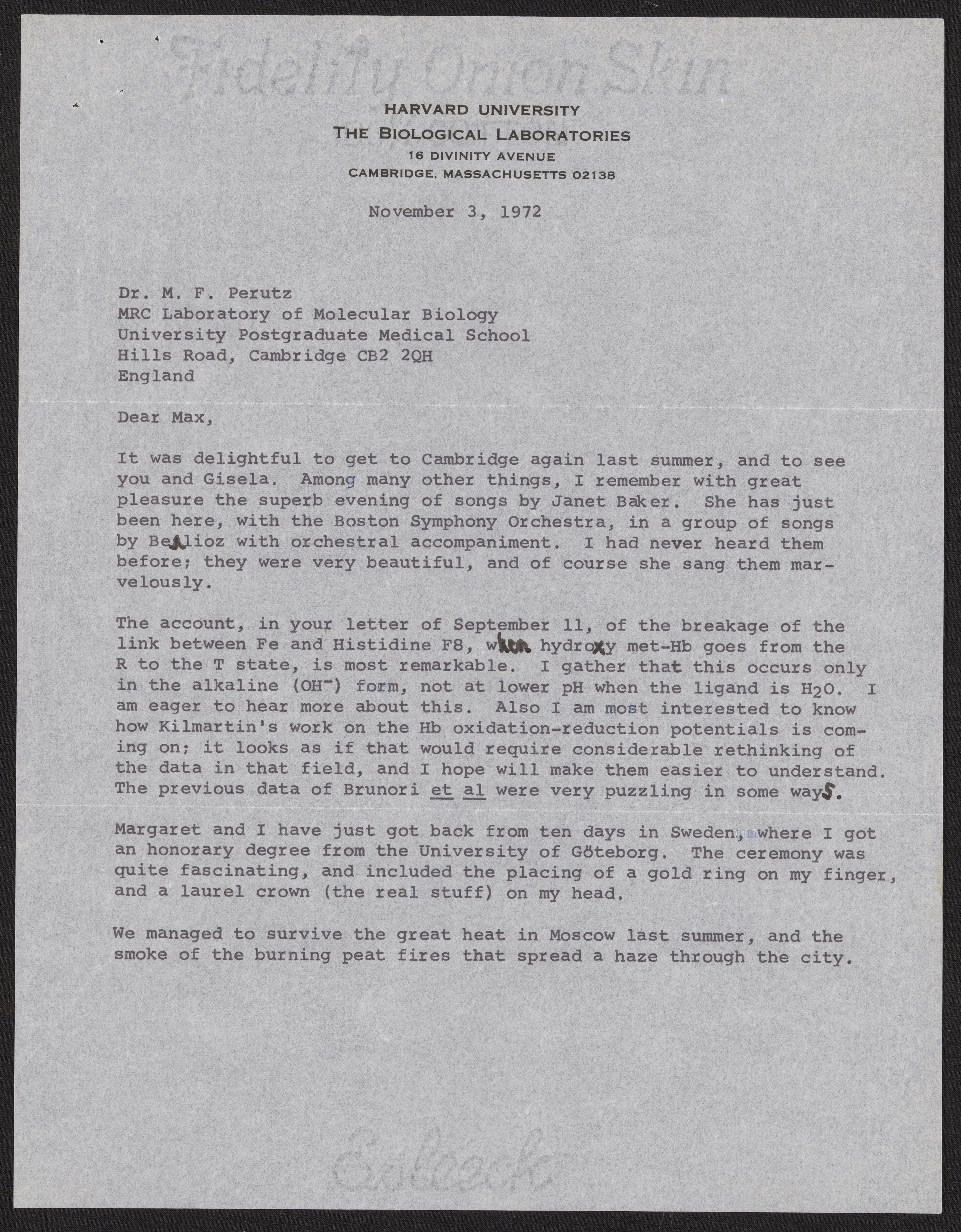 Letter from John T. Edsall to Max Perutz, November 3, 1972