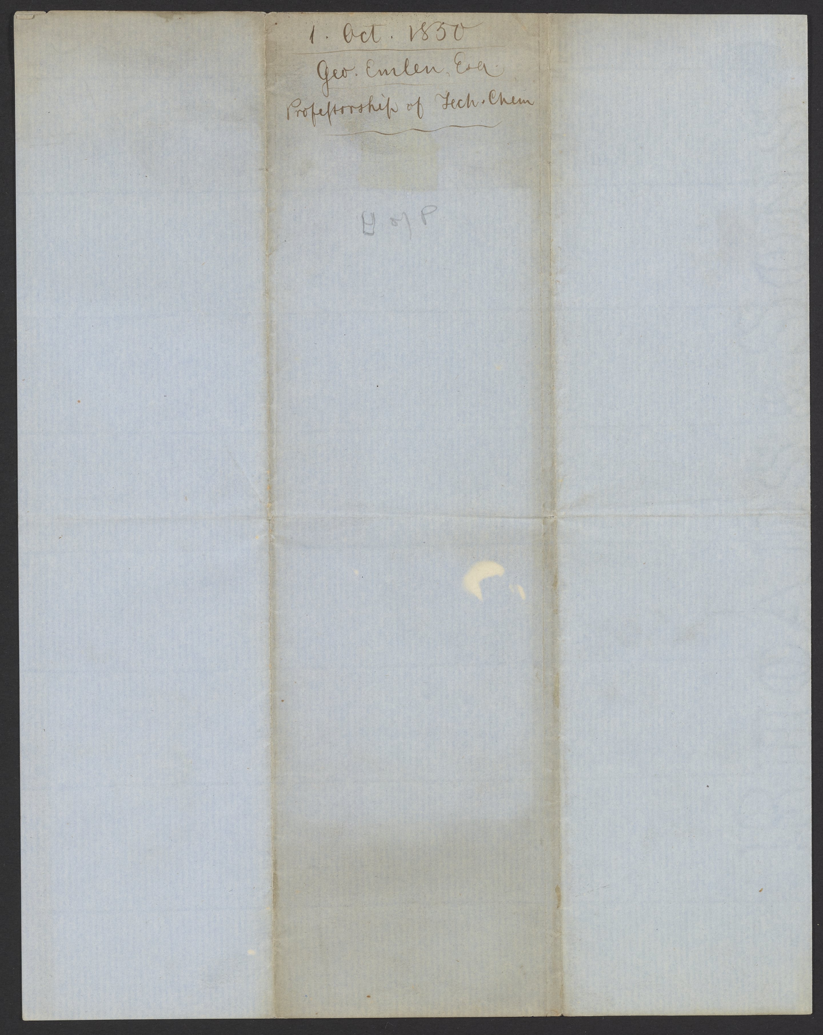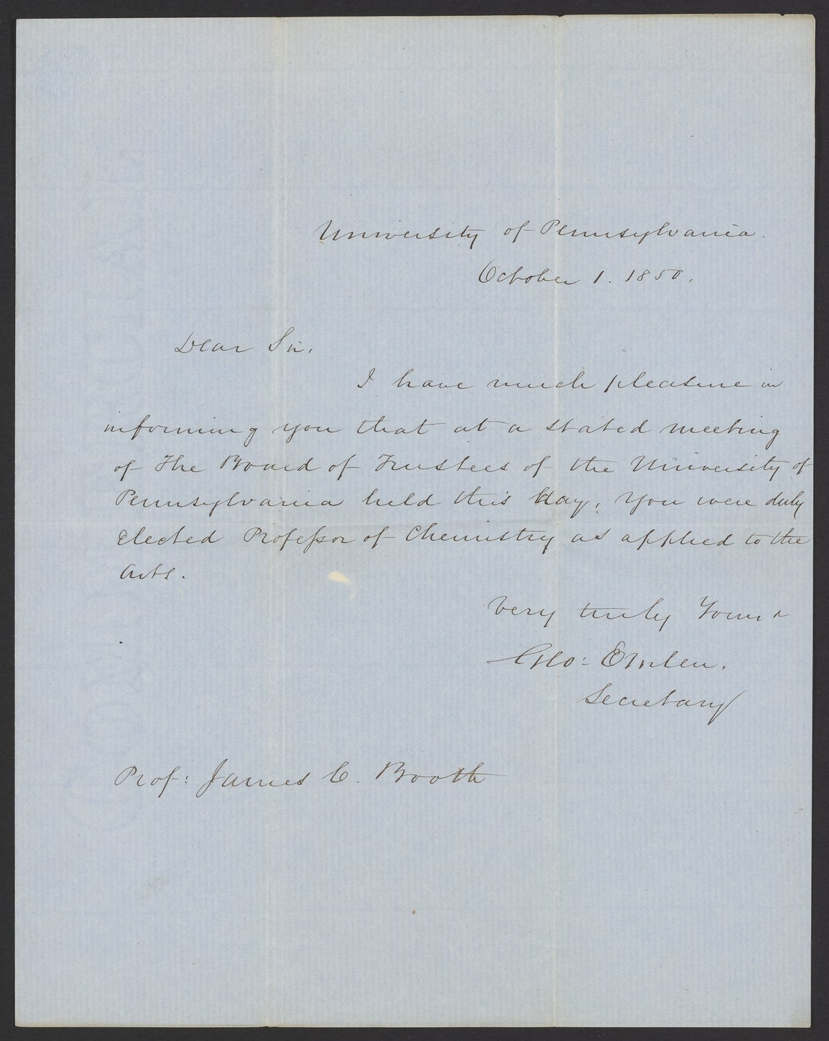Emlen, G. “Letter from G. Emlen, Secretary of the University of Pennsylvania, to James Curtis Booth,” October 1, 1850. Papers of James Curtis Booth, Box 1, Folder 6. Science History Institute. Philadelphia. https://digital.sciencehistory.org/works/gcq0vyz.