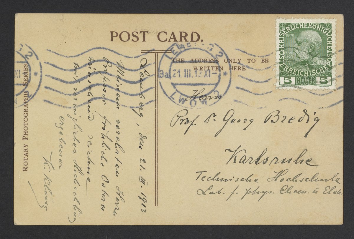“Postcard of William Thomson Sent to Georg Bredig,” March 21, 1913. Papers of Georg and Max Bredig, Box 22. Science History Institute. Philadelphia. https://digital.sciencehistory.org/works/gdylyij.
