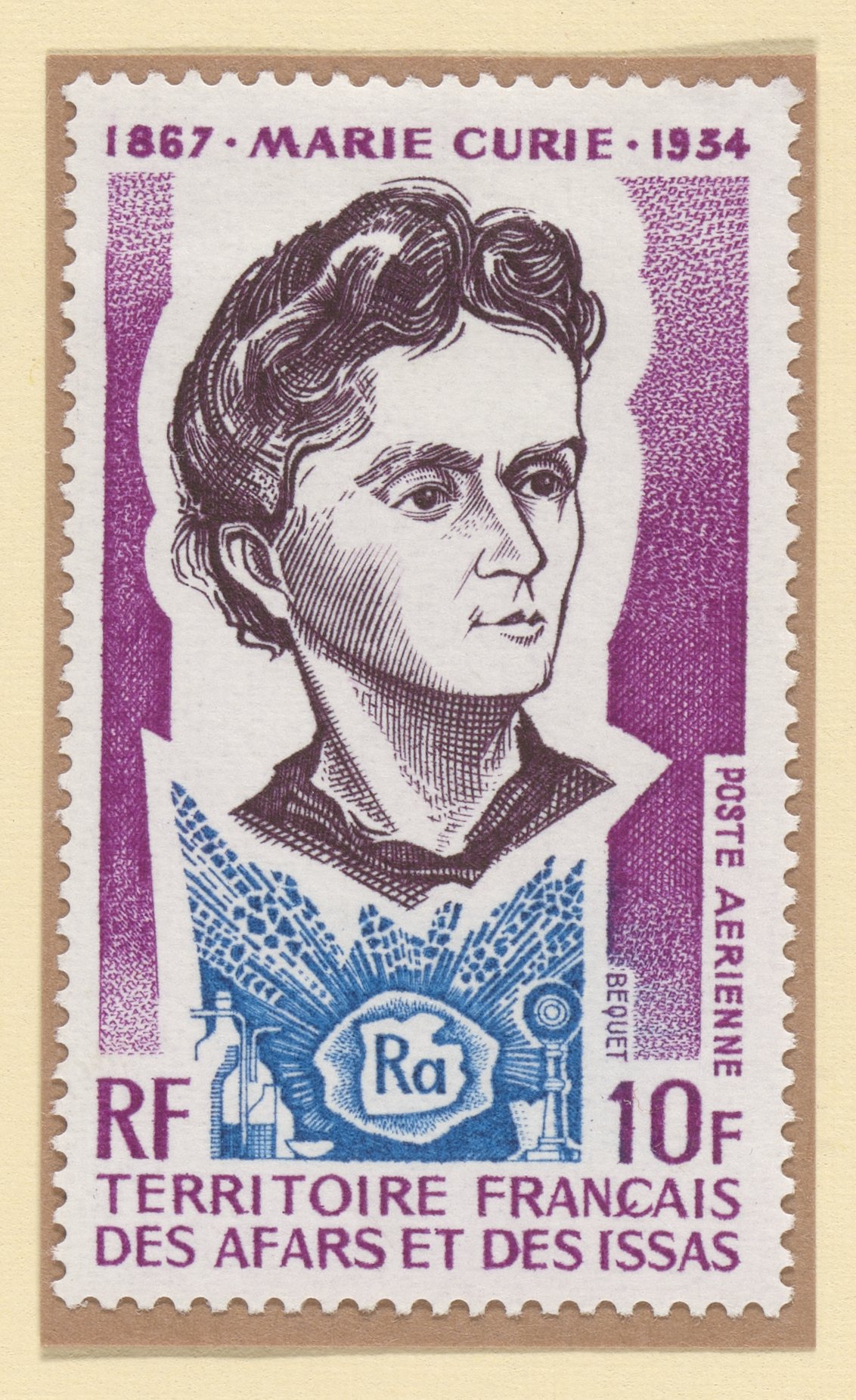 PDFFull-sized JPG1132 x 1852px — 450 KBOriginal fileTIFF — 1132 x 1852px — 6.0 MBStamp from the French Territory of the Afars and the Issas, now present-day Djibouti, commemorating Marie Skłodowska Curie (1867-1934), a Polish-French physicist and chemist who pioneered radioactivity research and who discovered the elements polonium and radium. Curie was the first woman to win a Nobel Prize, the only woman to win two Nobel Prizes, and the only person to win the Nobel Prize in two separate fields.