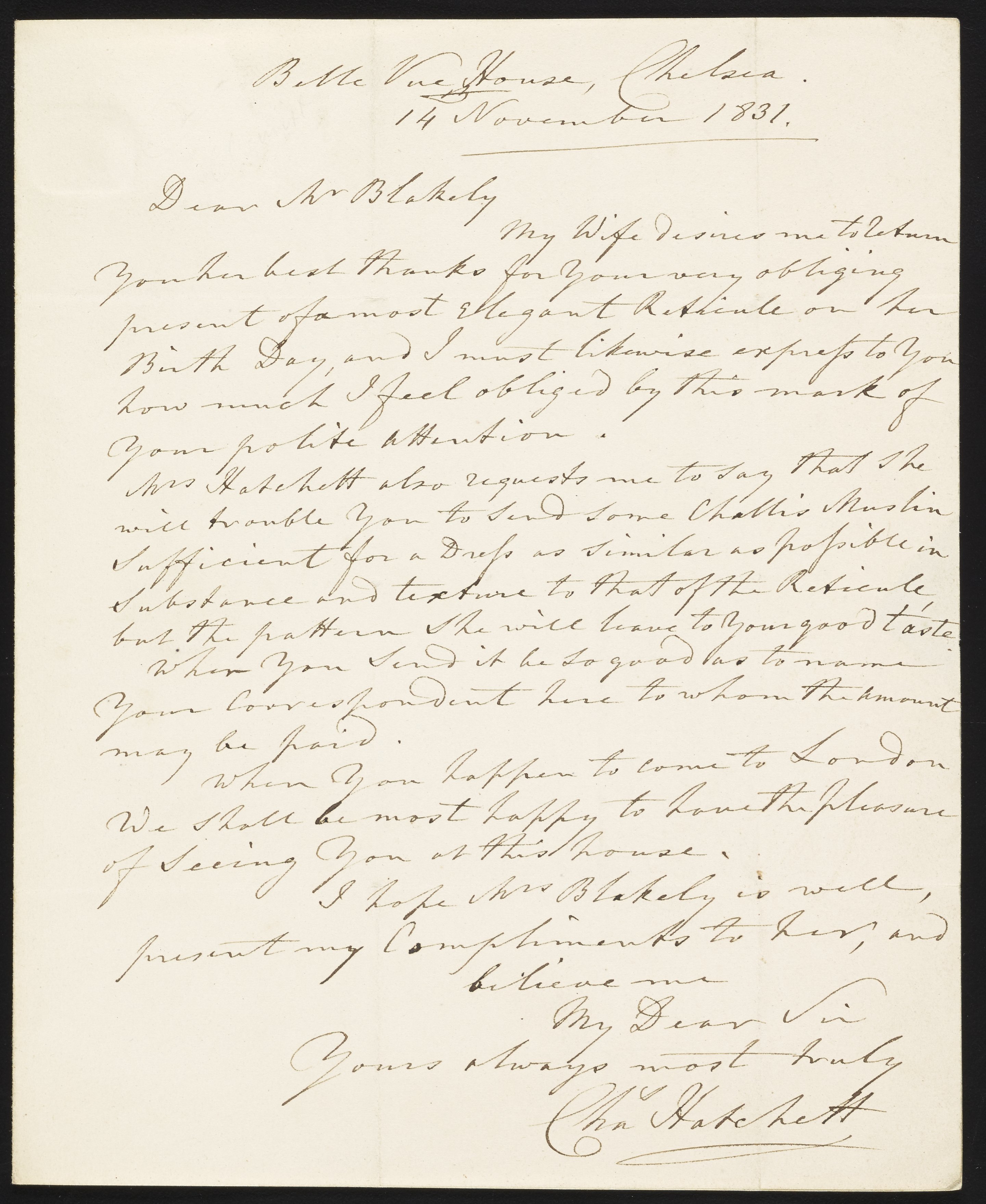 Thank-you note for Blakely's birthday gift of "a most elegant reticule" for Hatchett's wife.
