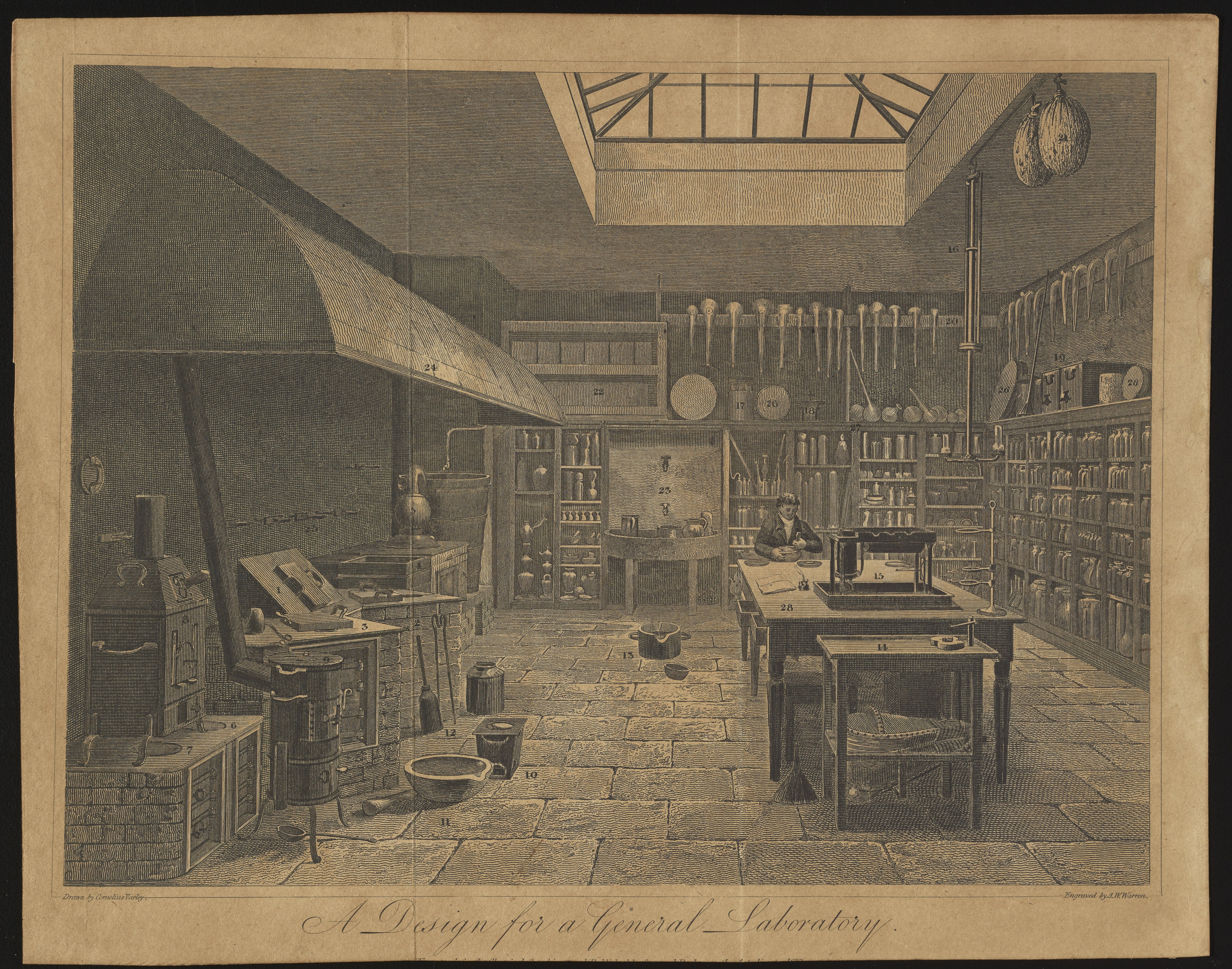 Warren, A. W. (Alfred William). “A Design for a General Laboratory.” Wove paper, paper (fiber product), 1822. Science History Institute. Philadelphia. https://digital.sciencehistory.org/works/gf06g337w.