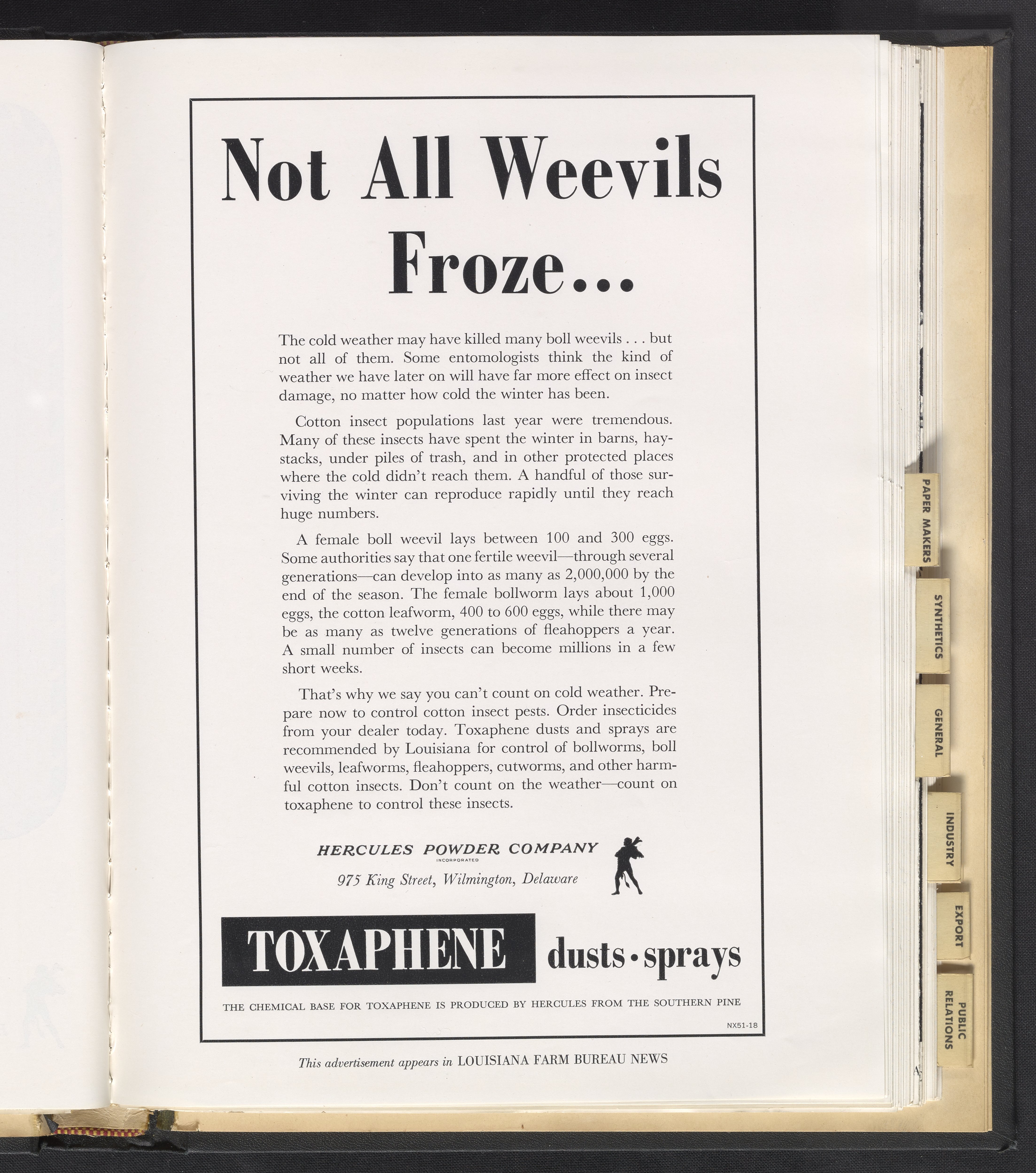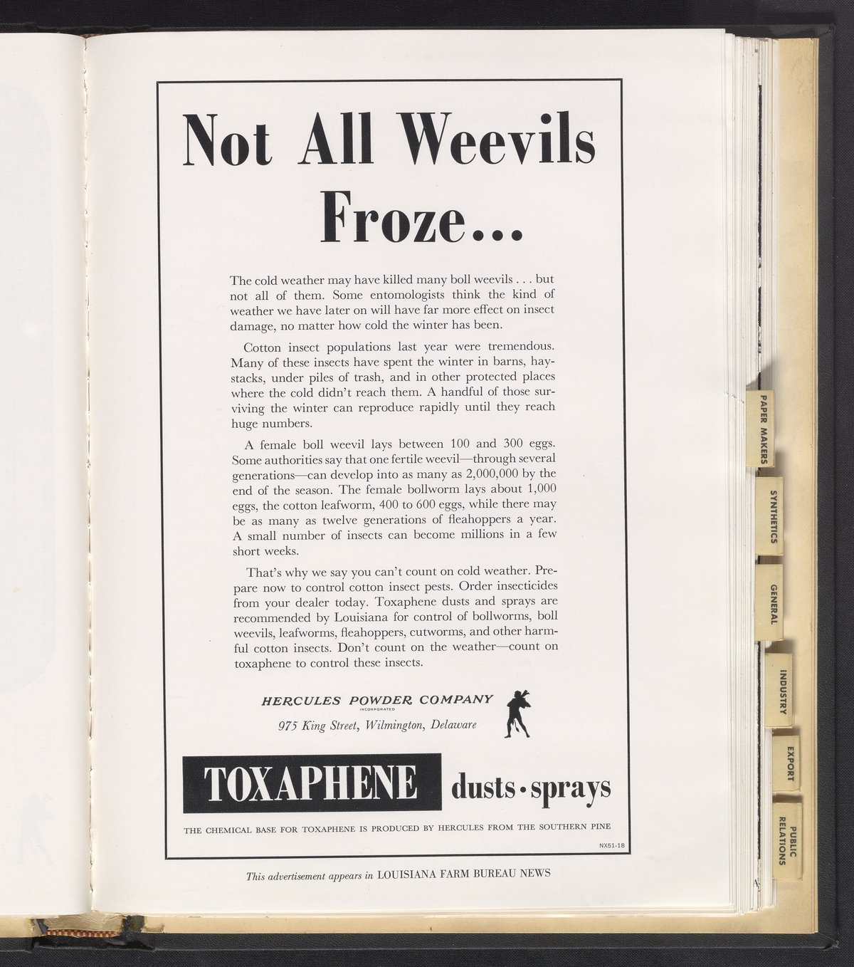 Hercules Incorporated. “Not All Weevils Froze...” 1951 Hercules Advertisements, 1951. Records of Hercules Incorporated, Volume 1951. Science History Institute. Philadelphia. https://digital.sciencehistory.org/works/gf06g351q.