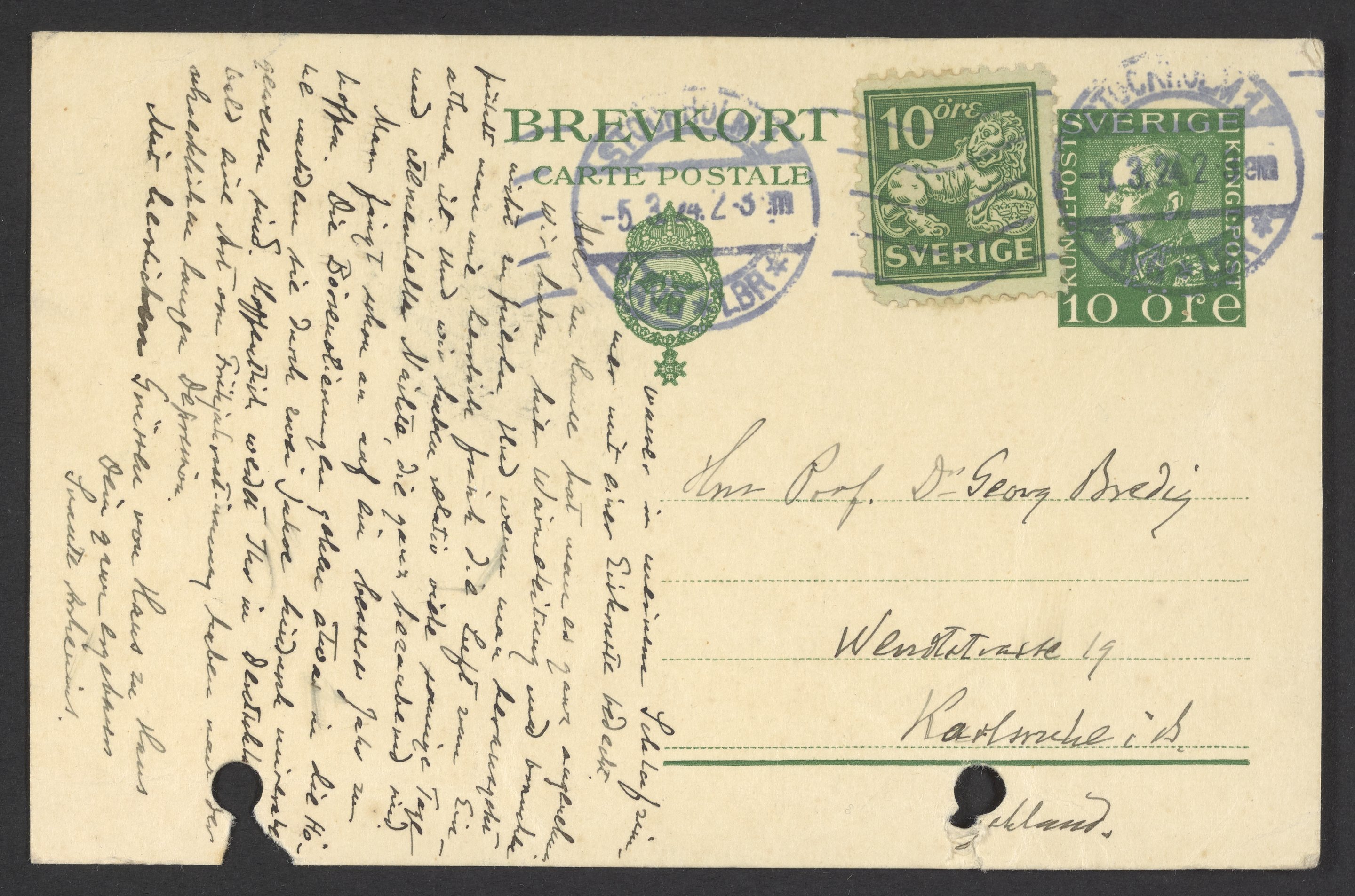 Postcard from Svante Arrhenius to Georg Bredig, March 1924