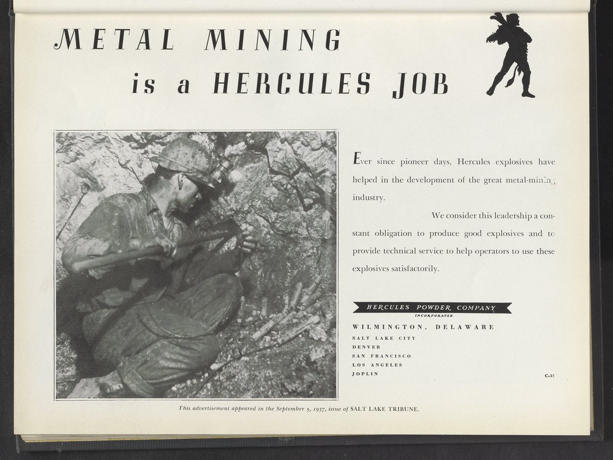 Hercules Incorporated. “Metal Mining Is a Hercules Job.” 1937 Hercules Advertisements, 1937. Records of Hercules Incorporated, Volume 1937. Science History Institute. Philadelphia. https://digital.sciencehistory.org/works/gh93h026k.