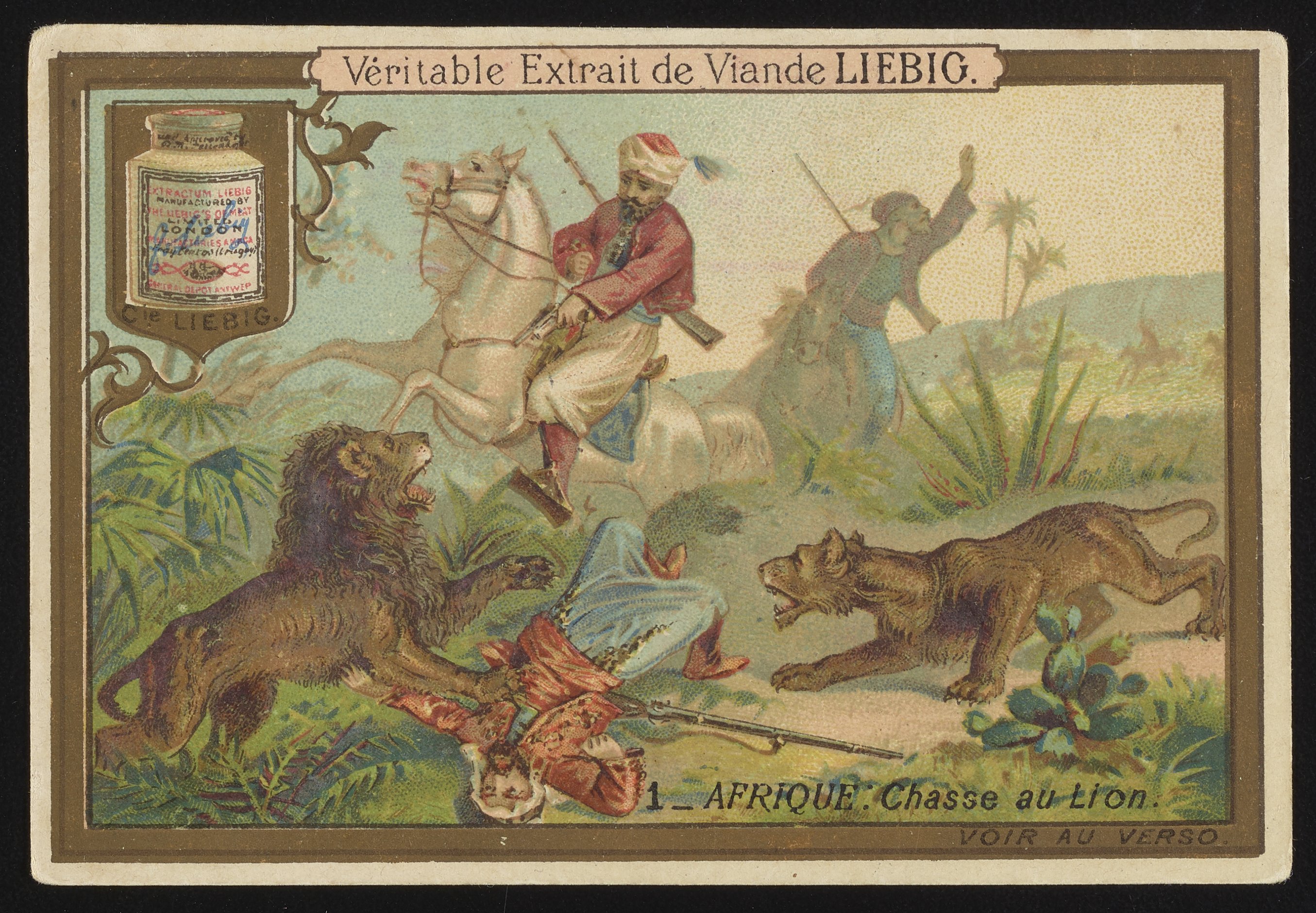Trade card for Véritable Extrait de Viande Liebig [Real Liebig Meat Extract] with lion chase in Africa