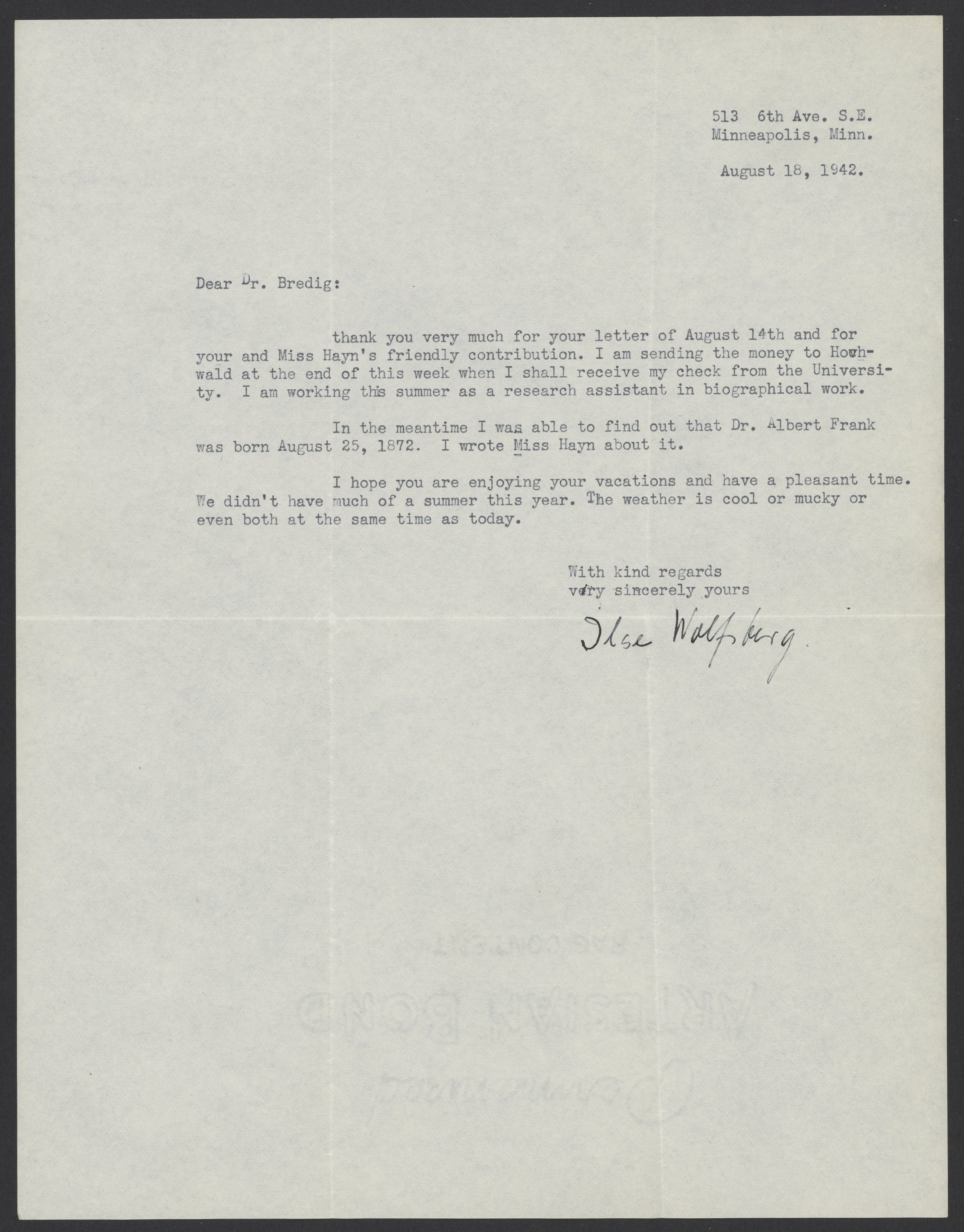 Letter from Ilse Wolfsberg to Max Bredig, August 18, 1942