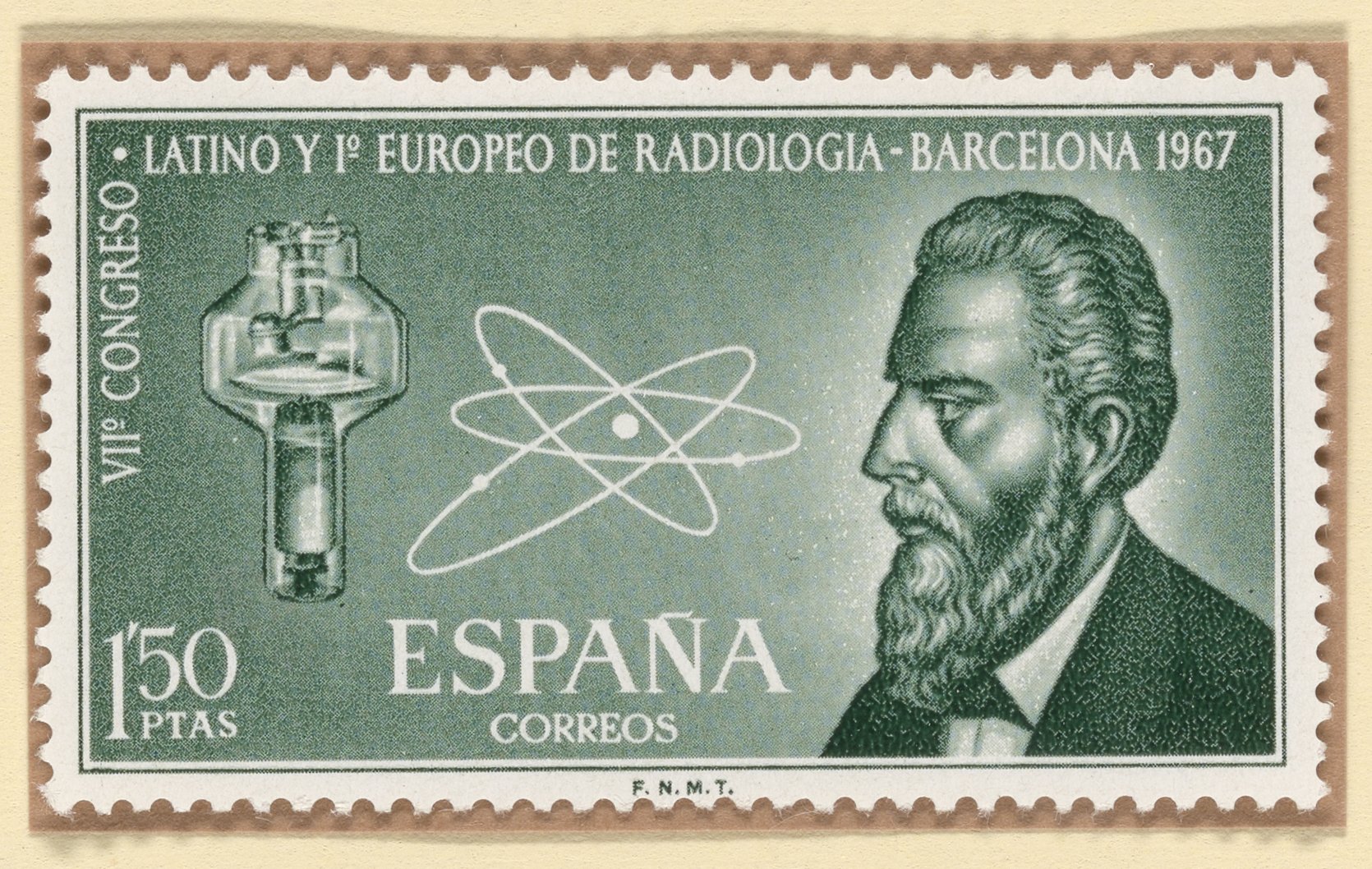 Spanish stamp commemorating the Seventh Latin and First European Congress of Radiology, held in Barcelona in 1967. The stamp features an atomic model, an X-ray tube, and Wilhelm Conrad Röntgen (1845-1923), the German physicist who discovered X-rays and the first recipient of the Nobel Prize in Physics.