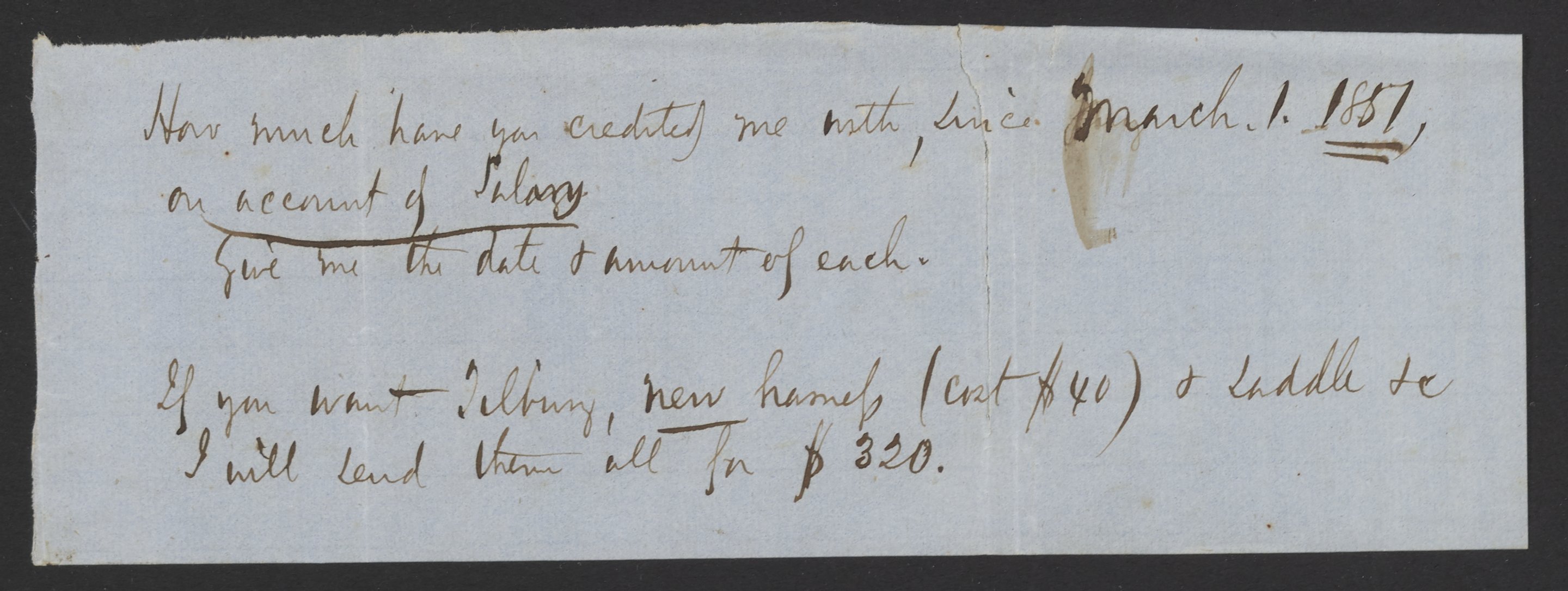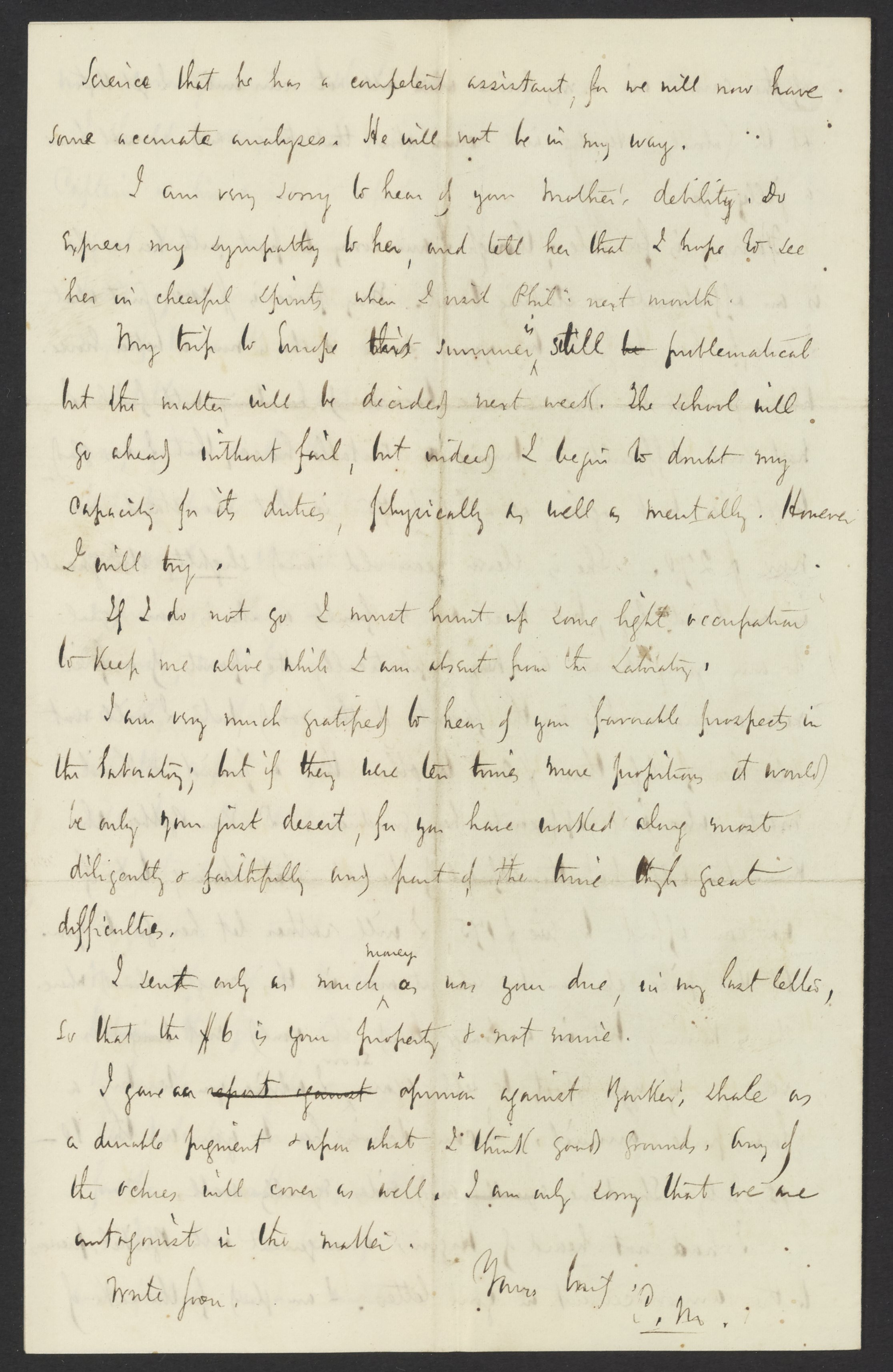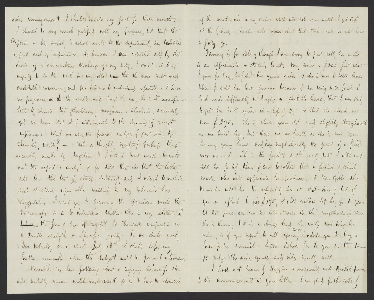 Small JPG1200 x 1850px — 267 KBFull-sized JPG2232 x 3441px — 708 KBOriginal fileTIFF — 2232 x 3441px — 22.0 MBCampbell Morfit (1820-1897), a distinguished chemist and co-editor with James Curtis Booth (1810-1888) of the Encyclopedia of Chemistry (1850), writes to Booth to discuss matters relating to his work and mentions the sale of his horse, Fanny.
