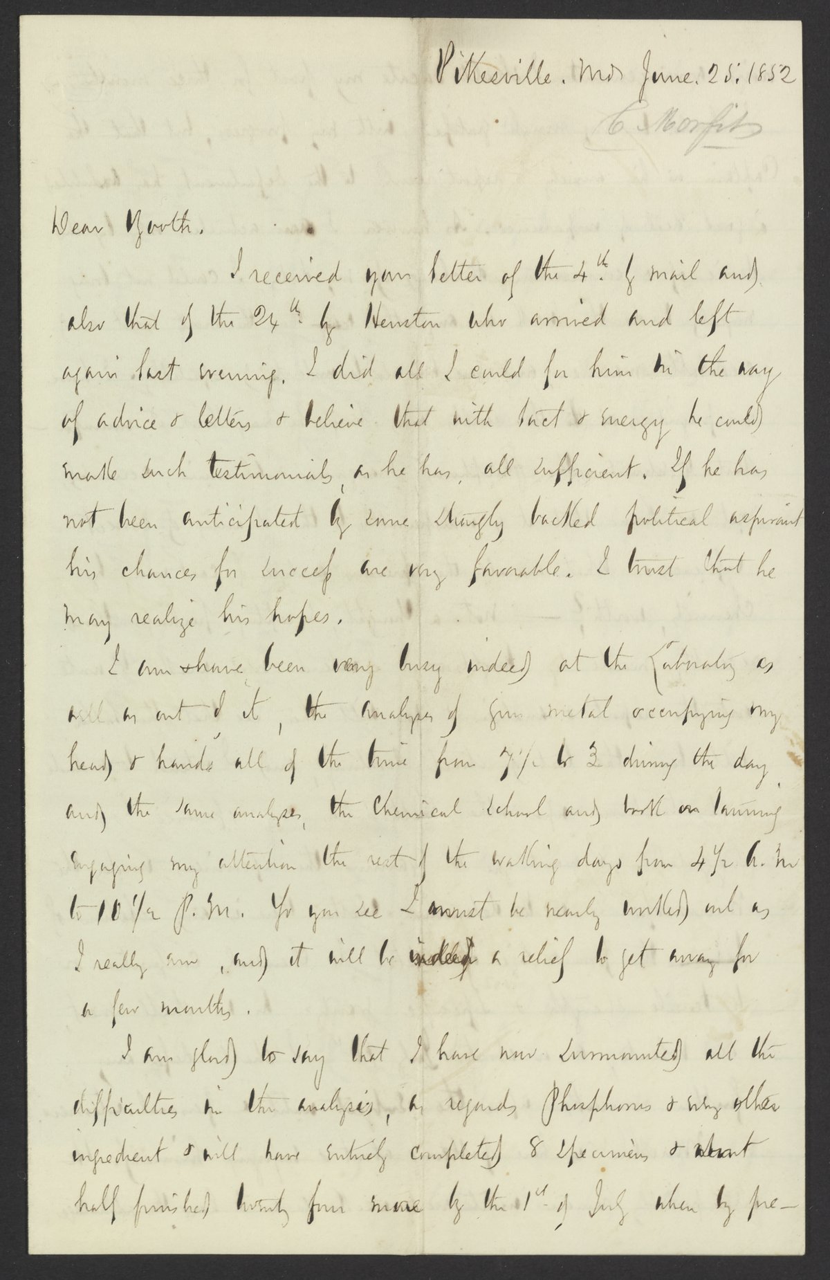 Morfit, Campbell. “Letter from Campbell Morfit to James Curtis Booth, June 24, 1852,” June 25, 1852. Papers of James Curtis Booth, Box 1, Folder 10. Science History Institute. Philadelphia. https://digital.sciencehistory.org/works/gjqk09r.