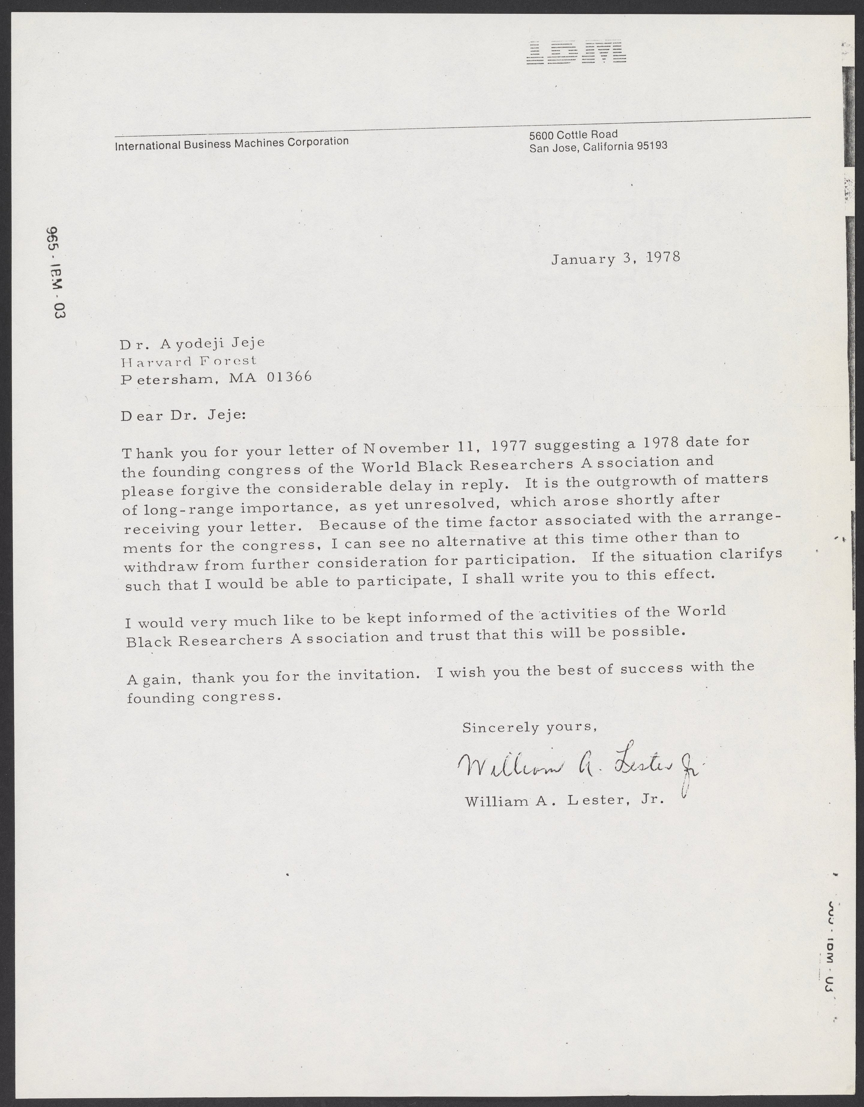 Letter from William A. Lester, Jr. to Ayodeji Jeje, January 3, 1978