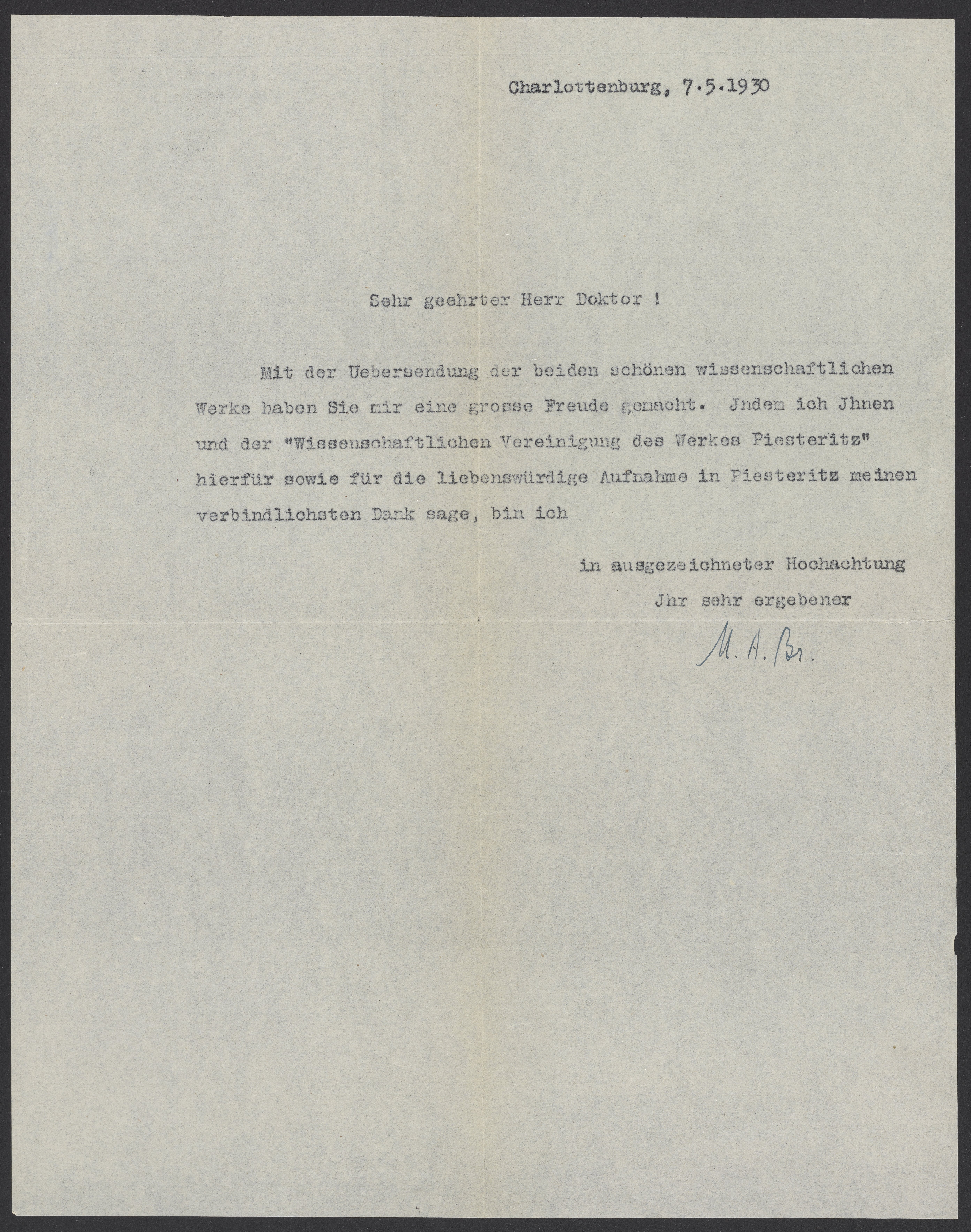 Letter from Max Bredig, May 1930