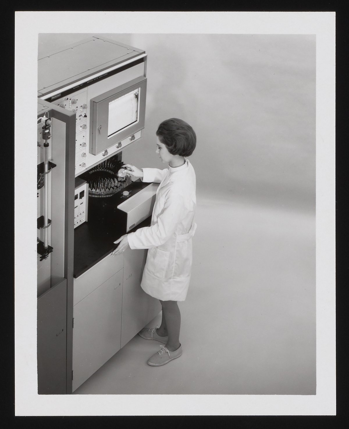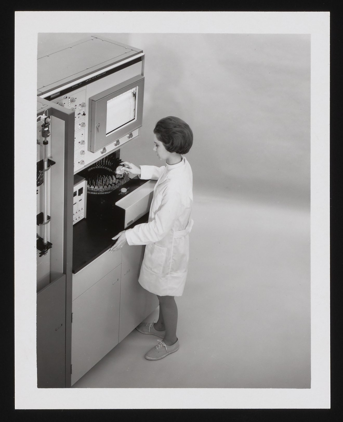 Unidentified woman using a Beckman Amino Acid Analyzer