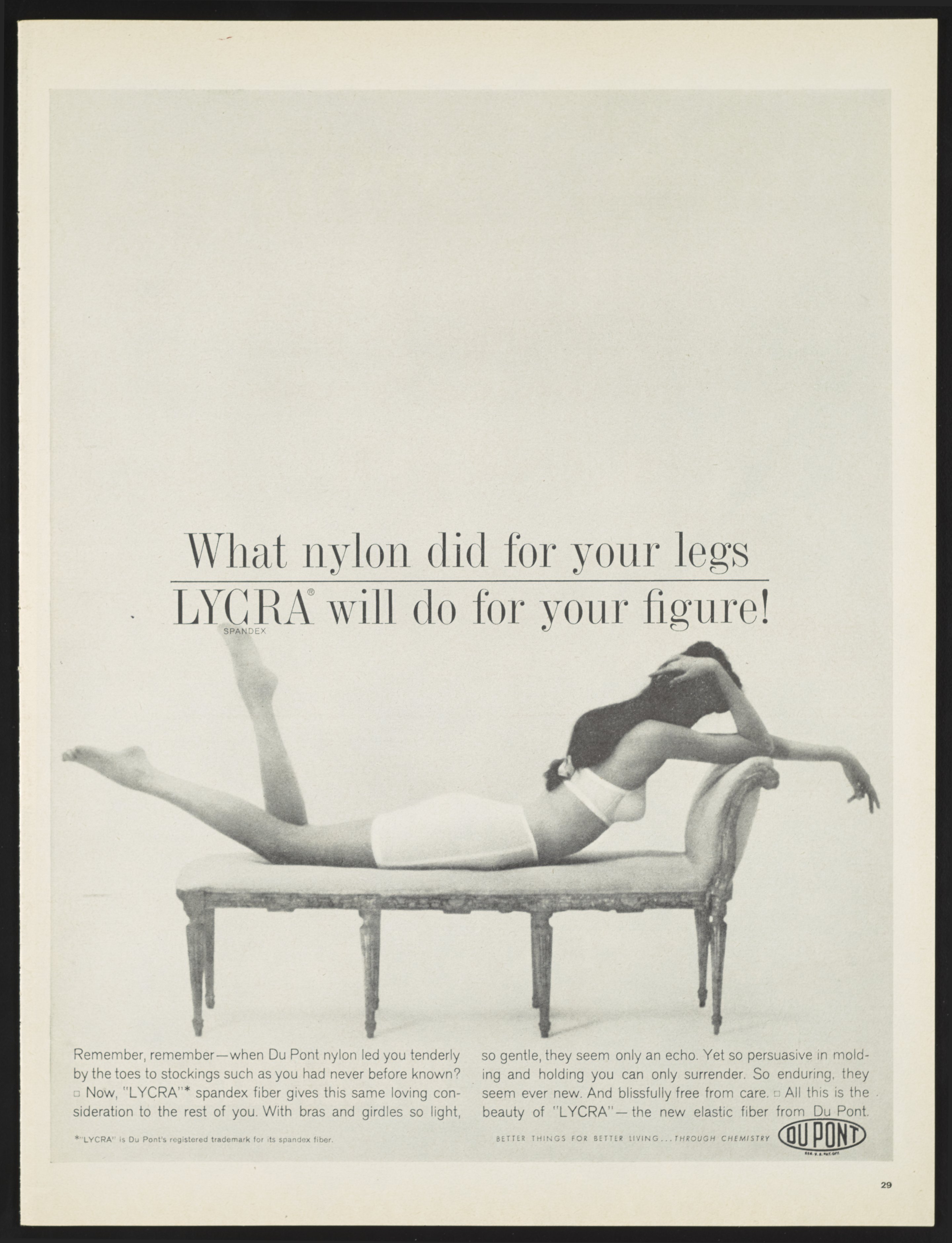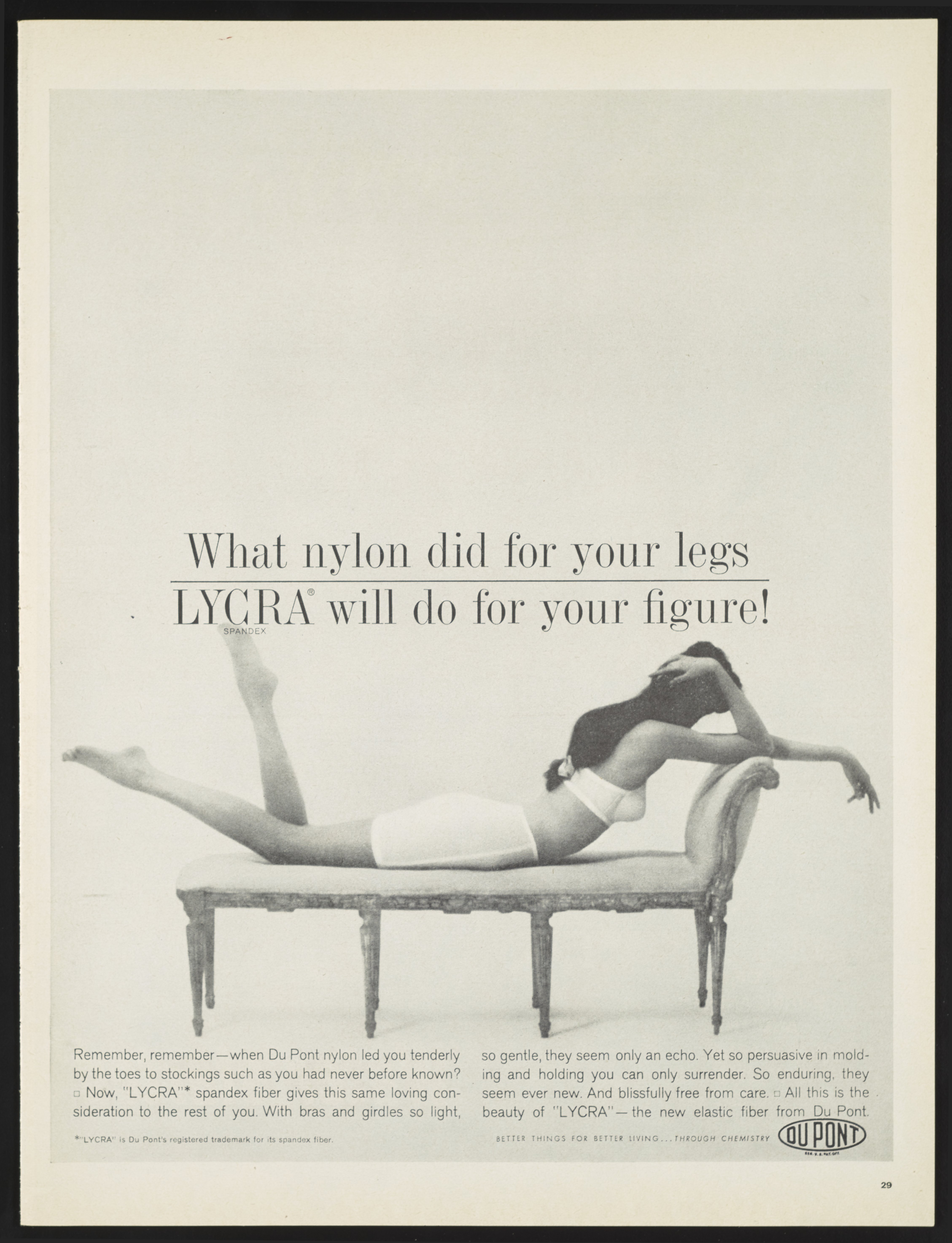 Magazine advertisement for DuPont Lycra, the brand name for the polyester-polyurethane copolymer invented by Joseph Shivers in 1958 at the DuPont laboratory in Waynesboro, Virginia. The advertisement was published in the September 22, 1961 edition of Life magazine. In the image, a dark-haired woman wearing a white bra and girdle is reclining on an ornate chaise lounge.