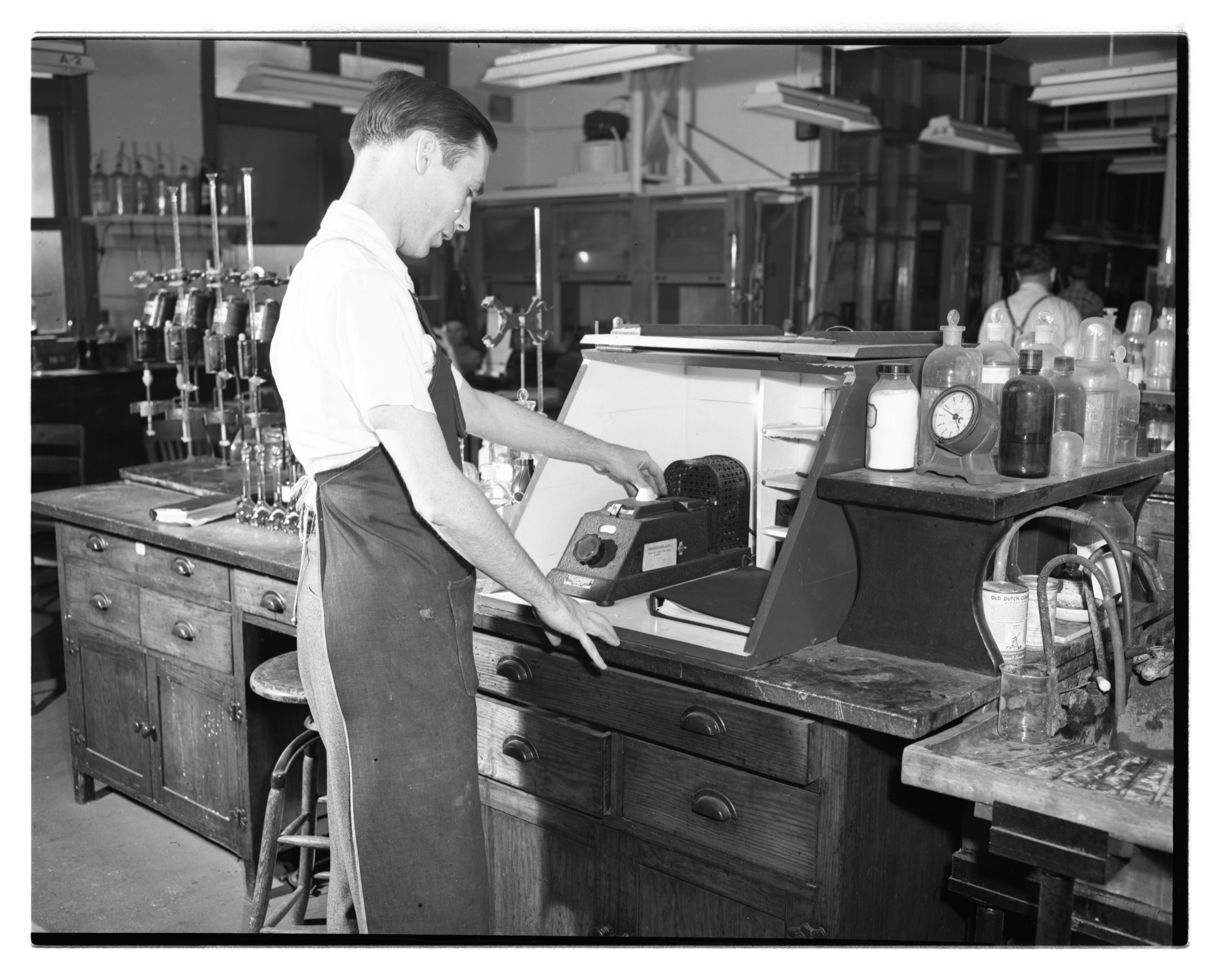 General view of technician James Geary using a Klett-Summerson Photoelectric Colorimeter to obtain a determination of iodine at a Dow Chemical Company laboratory. Designed in the 1930's by two Cornell University Medical College students, Arnoldus Goudsmit Jr. and William Henry Summerson, the Klett-Summerson Photoelectric Colorimeter was manufactured and sold by the Klett Manufacturing Co. of New York beginning in 1939.