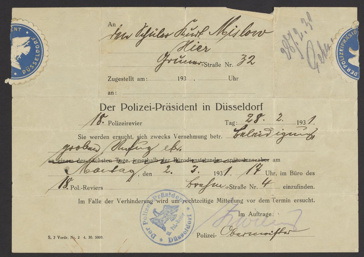 Small JPG1200 x 847px — 183 KBLarge JPG2880 x 2032px — 1.0 MBFull-sized JPG5371 x 3790px — 3.4 MBOriginal fileTIFF — 5371 x 3790px — 58.3 MBSummons from the Düsseldorf Police Headquarters for Max Mislow (1887-1963), Kurt M. Mislow's (1923-2017) father.