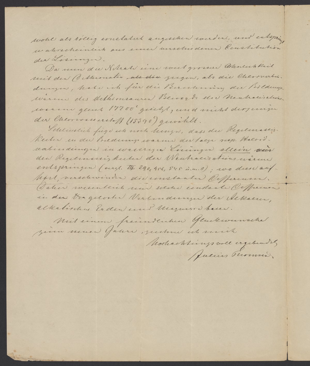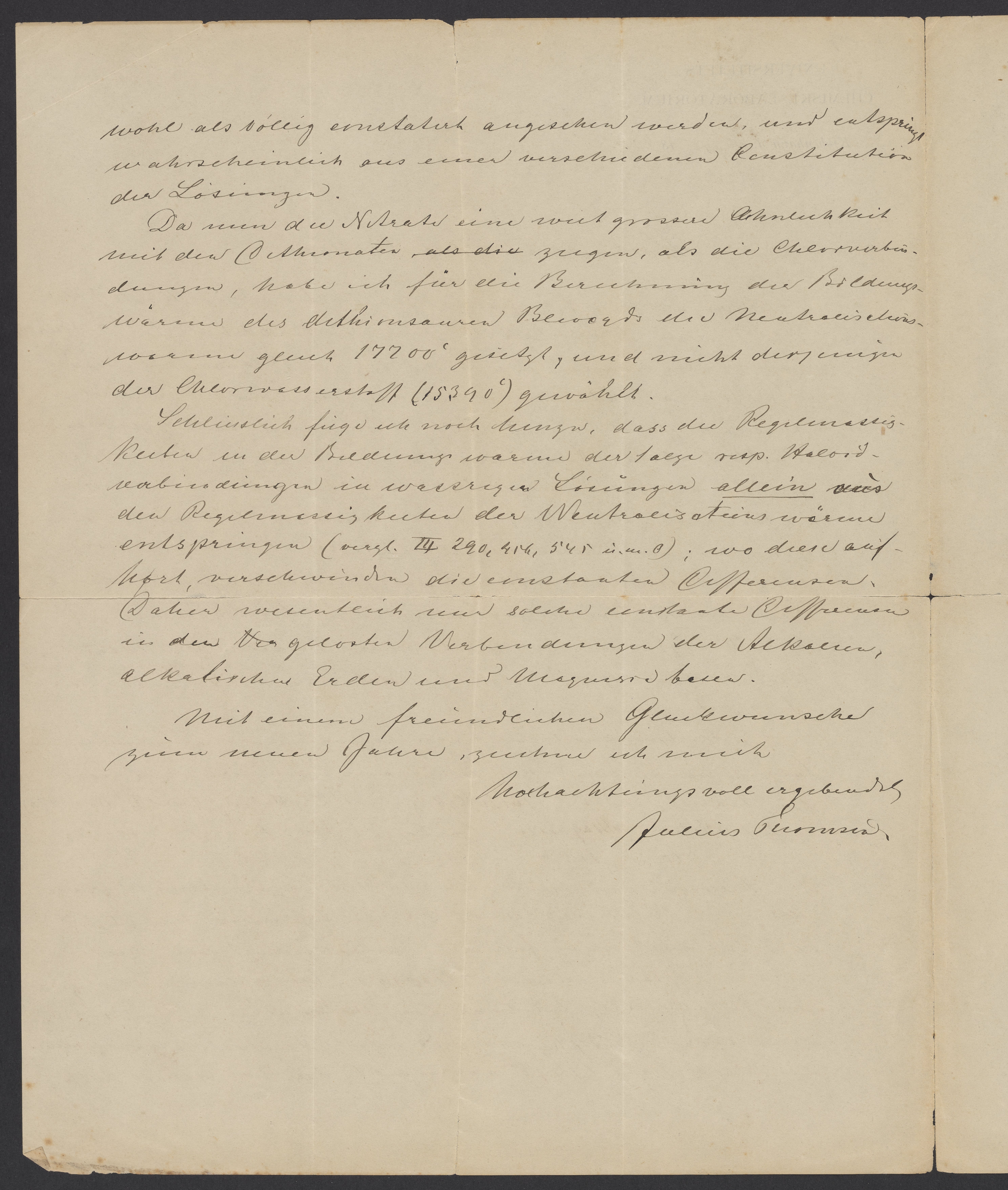Thomsen, Julius. “Letter from Julius Thomsen to Georg Bredig, December 1883,” May 2, 1917. Papers of Georg and Max Bredig, Box 2, Folder 27. Science History Institute. Philadelphia. https://digital.sciencehistory.org/works/gsawqq7.