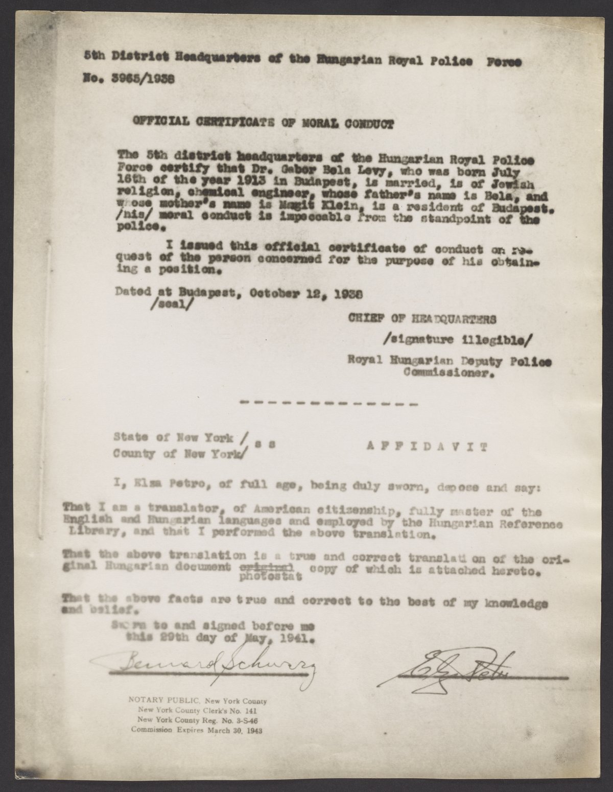 English translation of an Official Certificate of Moral Conduct issued to Gabor B. Levy, October 12, 1938