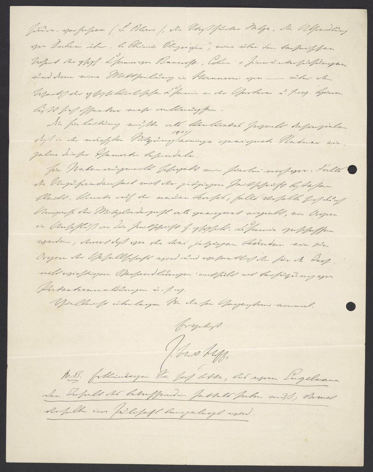 Besten Dank für Ihr Schreiben, das ich mich nunmehr eingehender überlegt habe. Ich muß gestehen daß Ihr Plan mir zu idealistisch erscheint zur gesamten Inangriffnahme, daß jedoch ein Schritt vielleicht erfolgreich sich machen läßt, indem wir für die Gesellschaft anderweitige Teile der physikalischen Chemie erschließen, die für die Technik wichtig sind oder werden voraussichtlich. Diesen Schritt würde ich mit Freude begrüßen und schlug [Ernst Heinz] Wagner vor ob nicht in der Zeitschrift für physikalische Chemie eine Mittheilung folgenden Inhalts auf rotem Zettel beigegeben werden könne: