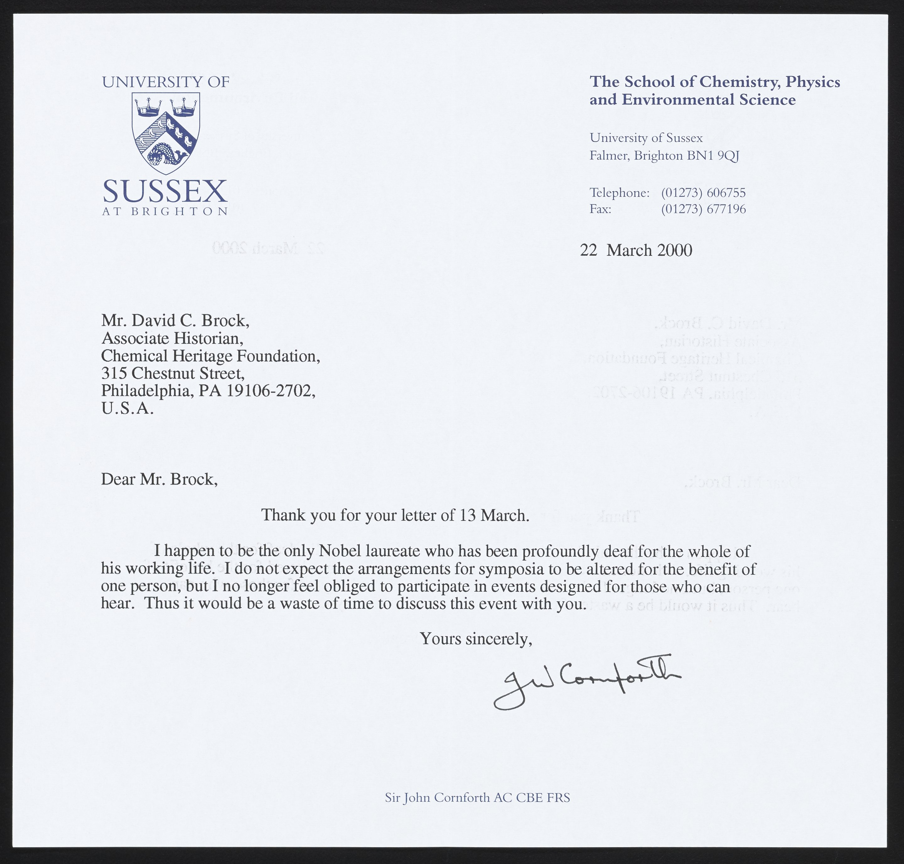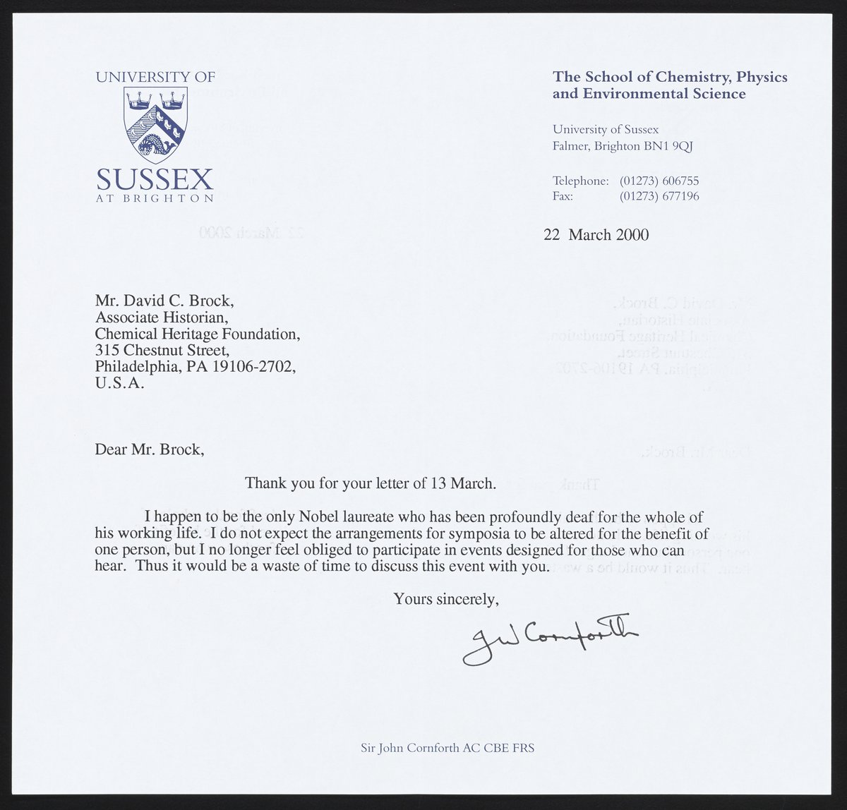 Cornforth, John. “Letter from John Cornforth to David Brock,” March 22, 2000. Science History Institute. Philadelphia. https://digital.sciencehistory.org/works/gt54kn01b.