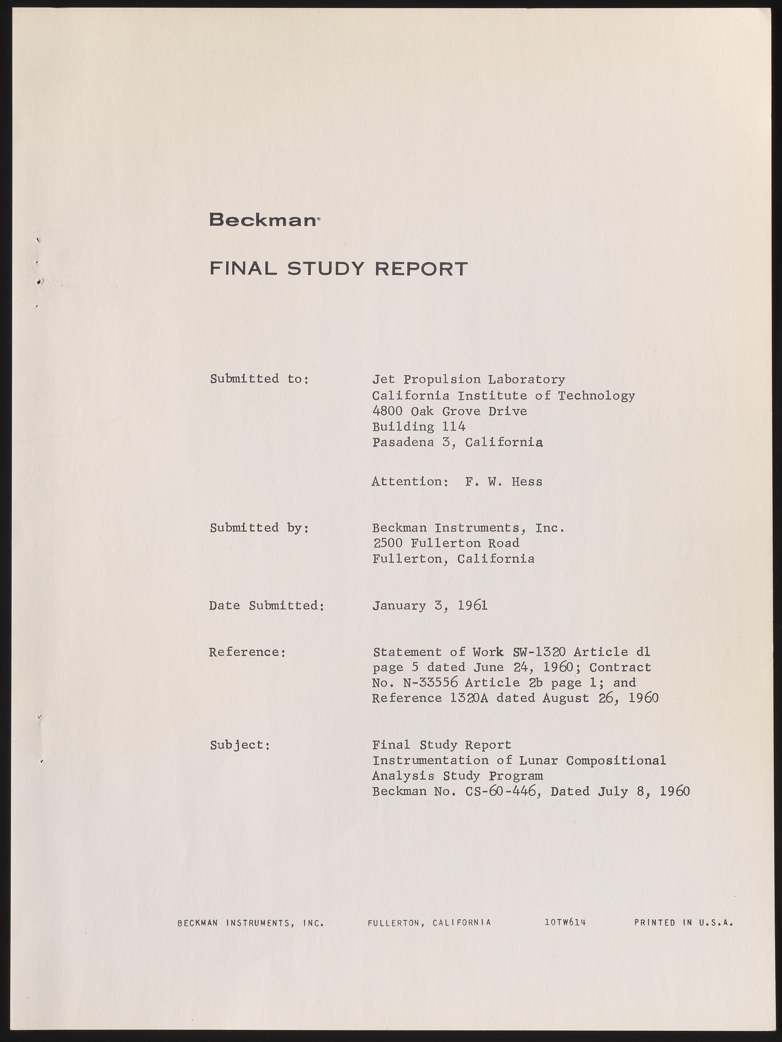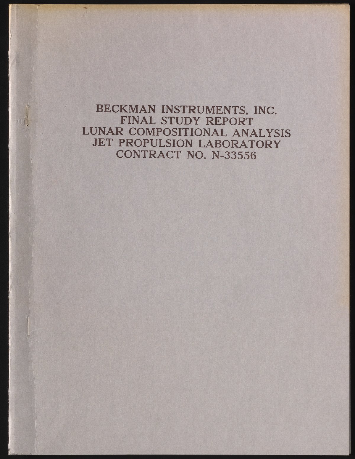 Beckman Instruments, Inc. “Final Study Report - Lunar Compositional Analysis,” July 8, 1961. Beckman Historical Collection, Box 18, Folder 17. Science History Institute. Philadelphia. https://digital.sciencehistory.org/works/gt54kn070.