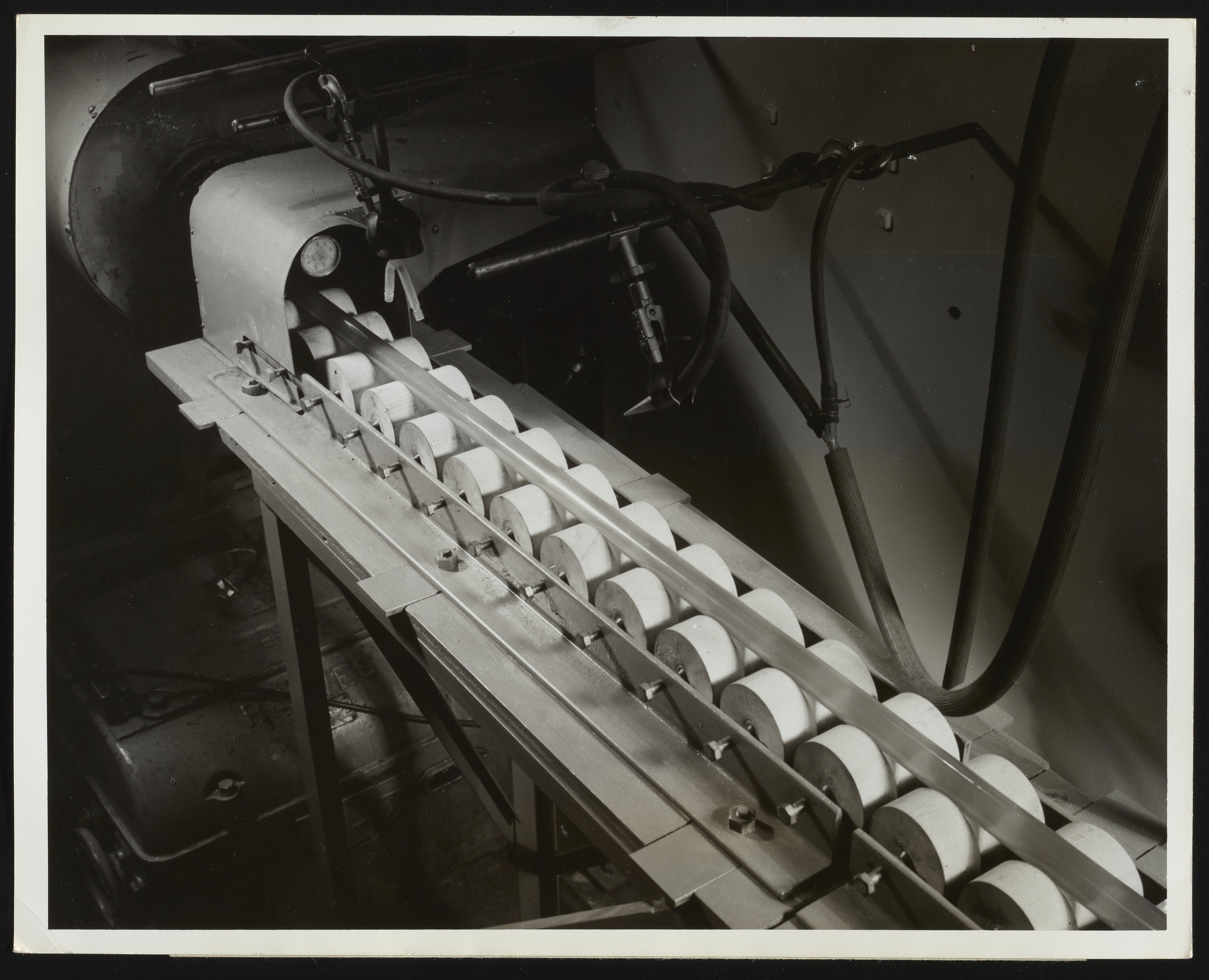 Close-up view of the take-off jig used to control extruded shapes on a National Rubber 2-inch extruder in the Plastics Laboratory at the Hercules Powder Company plant in Parlin, New Jersey. The employee visible in the photograph is identified as J.G. Fuller. Per notations accompanying the photograph, the material being extruded is a new formulation of ethyl cellulose being evaluated as tool handle stock. The Parlin plant commonly produced ethyl cellulose, nitrocellulose, and cellulose acetate, which were purchased by a variety of public and private industries as a raw material for use in plastics, films, lacquers, and other materials.