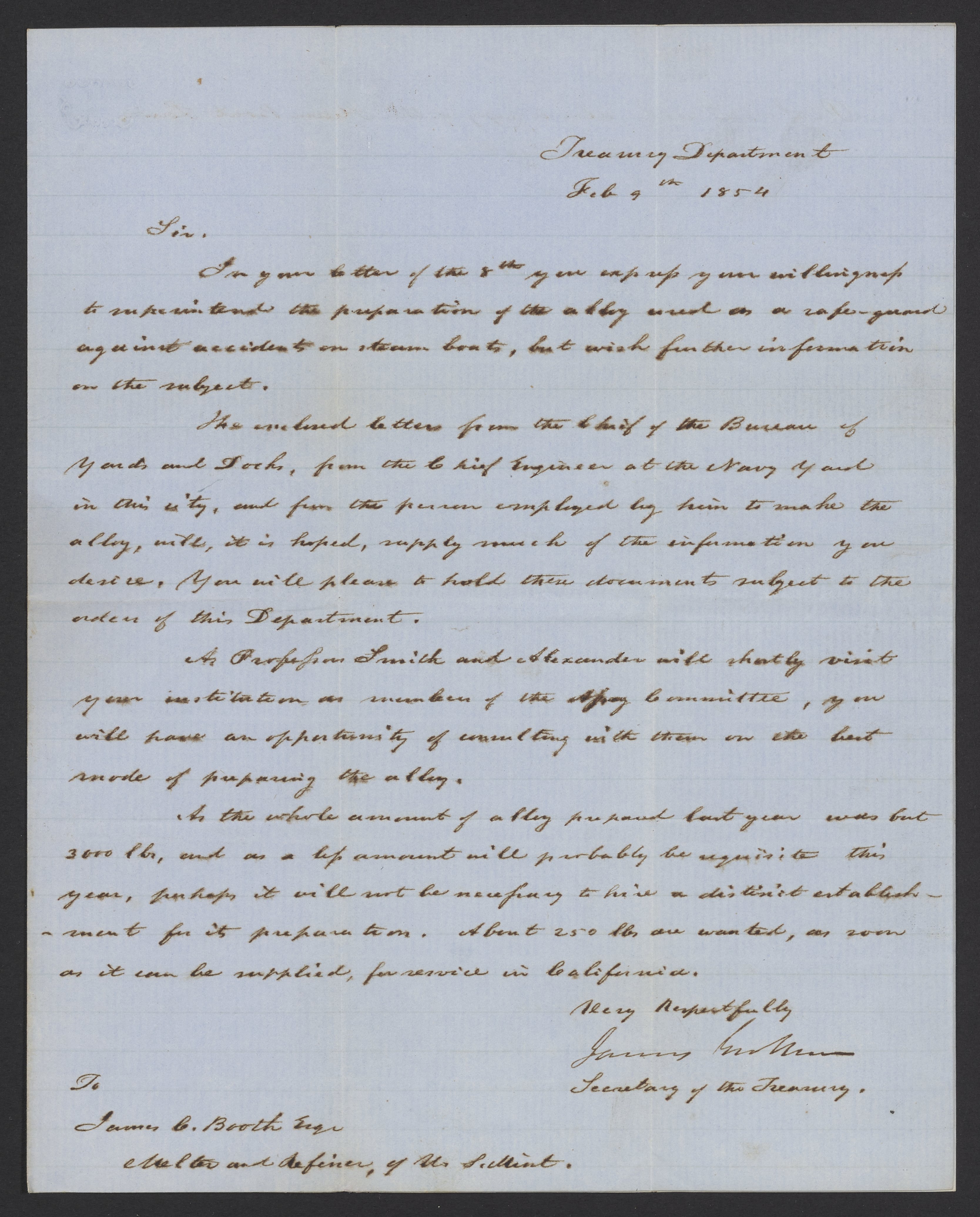 Small JPG1200 x 1490px — 255 KBLarge JPG2880 x 3576px — 1.3 MBFull-sized JPG3335 x 4141px — 1.7 MBOriginal fileTIFF — 3335 x 4141px — 39.6 MBJames B. Guthrie (1792 - 1869), United States Secretary of the Treasury from 1853-1857, writes to James Curtis Booth (1810-1888) concerning fusible alloys for use in steamboat safety tests.