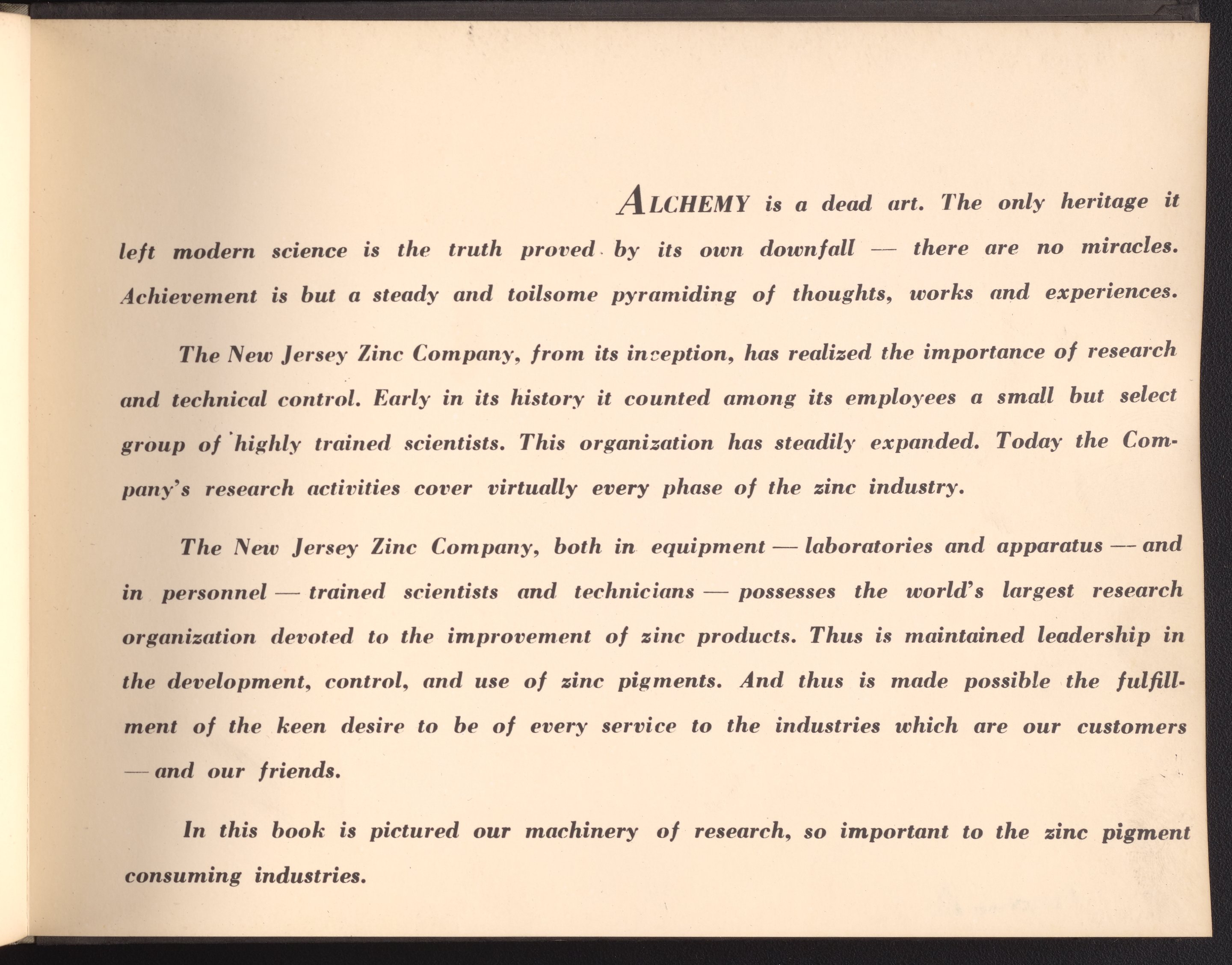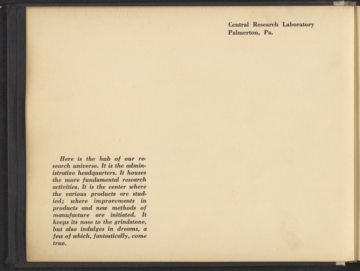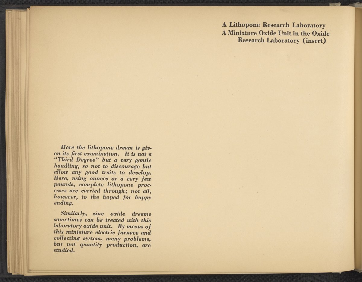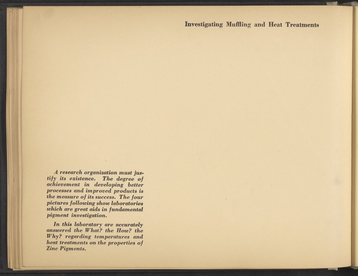 Small JPG1200 x 898px — 148 KBLarge JPG2880 x 2155px — 976 KBFull-sized JPG4228 x 3164px — 2.0 MBOriginal fileTIFF — 4228 x 3164px — 38.3 MBA publication showcasing the laboratories, apparatus, machinery, and personnel of the New Jersey Zinc Company. Intended to present the company's research facilities in Palmerton, Pennsylvania used for zinc pigment production. Includes twenty-two black and white photographs. The New Jersey Zinc Company (now the Horsehead Holding Corporation) was the largest producer of Zinc in the United States from 1897 to 1966. The work is digitized in its entirety.
