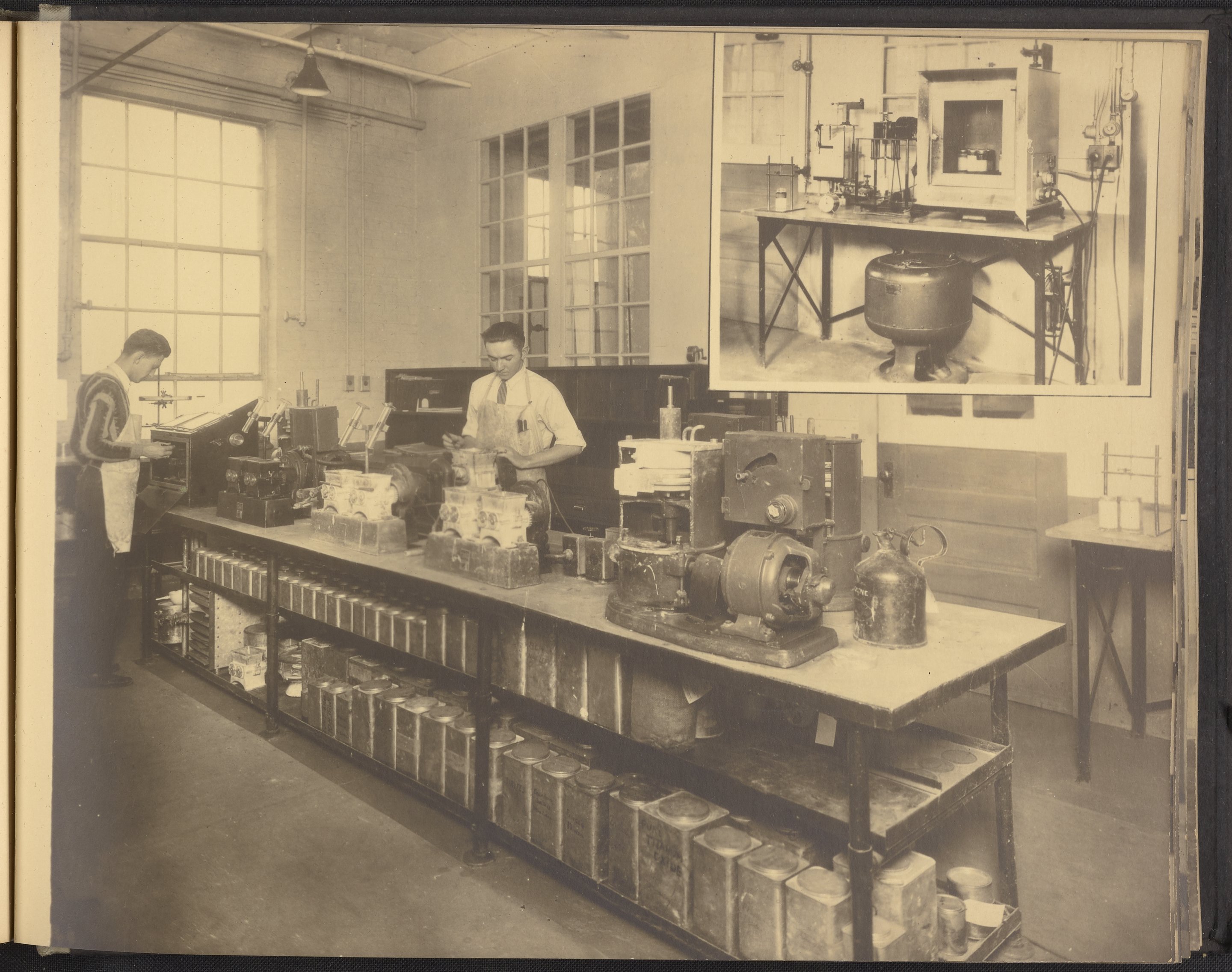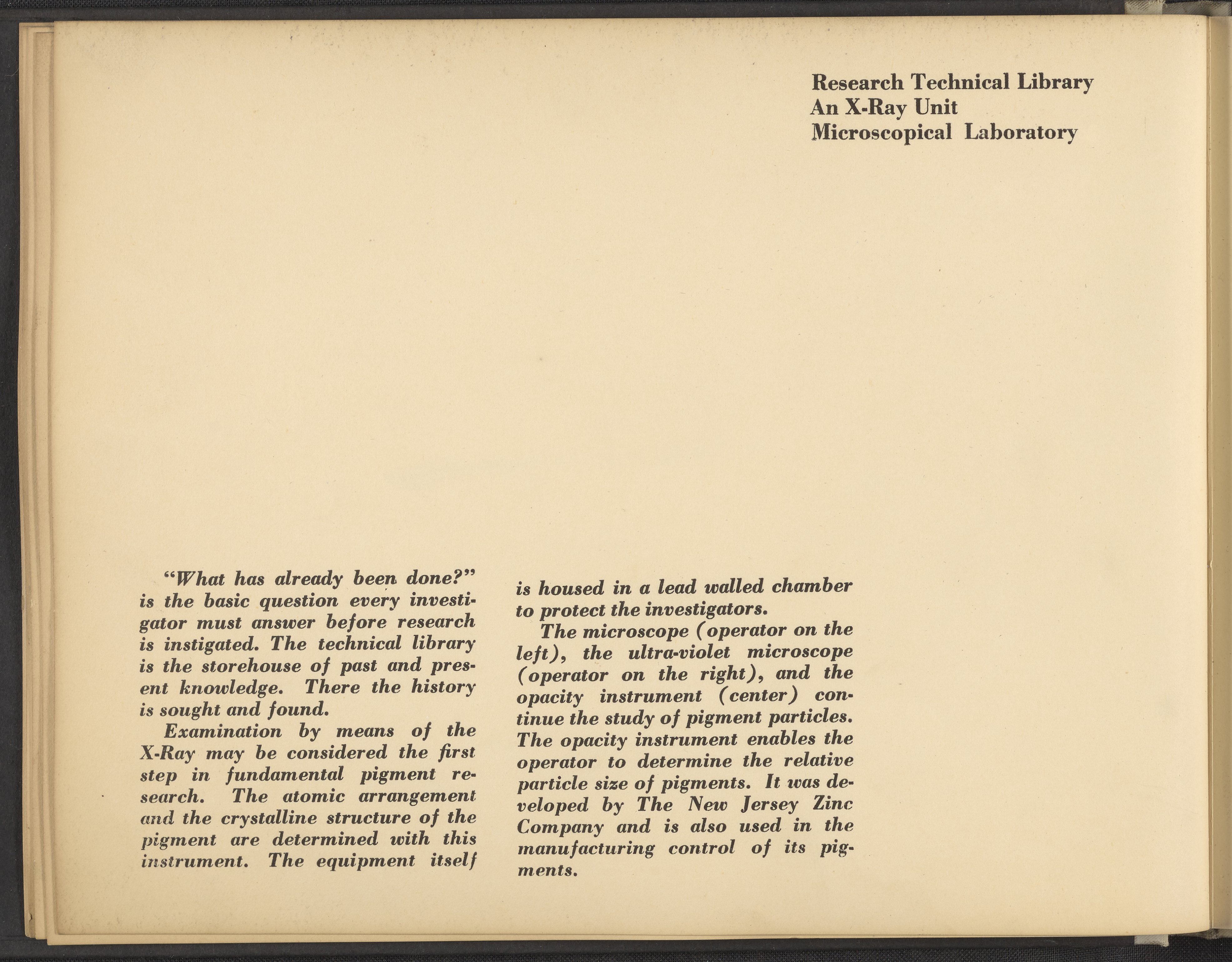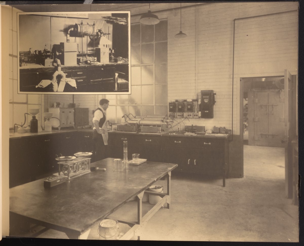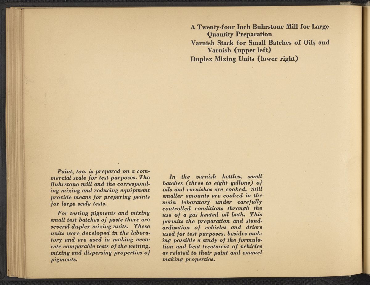 Small JPG1200 x 898px — 148 KBLarge JPG2880 x 2155px — 976 KBFull-sized JPG4228 x 3164px — 2.0 MBOriginal fileTIFF — 4228 x 3164px — 38.3 MBA publication showcasing the laboratories, apparatus, machinery, and personnel of the New Jersey Zinc Company. Intended to present the company's research facilities in Palmerton, Pennsylvania used for zinc pigment production. Includes twenty-two black and white photographs. The New Jersey Zinc Company (now the Horsehead Holding Corporation) was the largest producer of Zinc in the United States from 1897 to 1966. The work is digitized in its entirety.