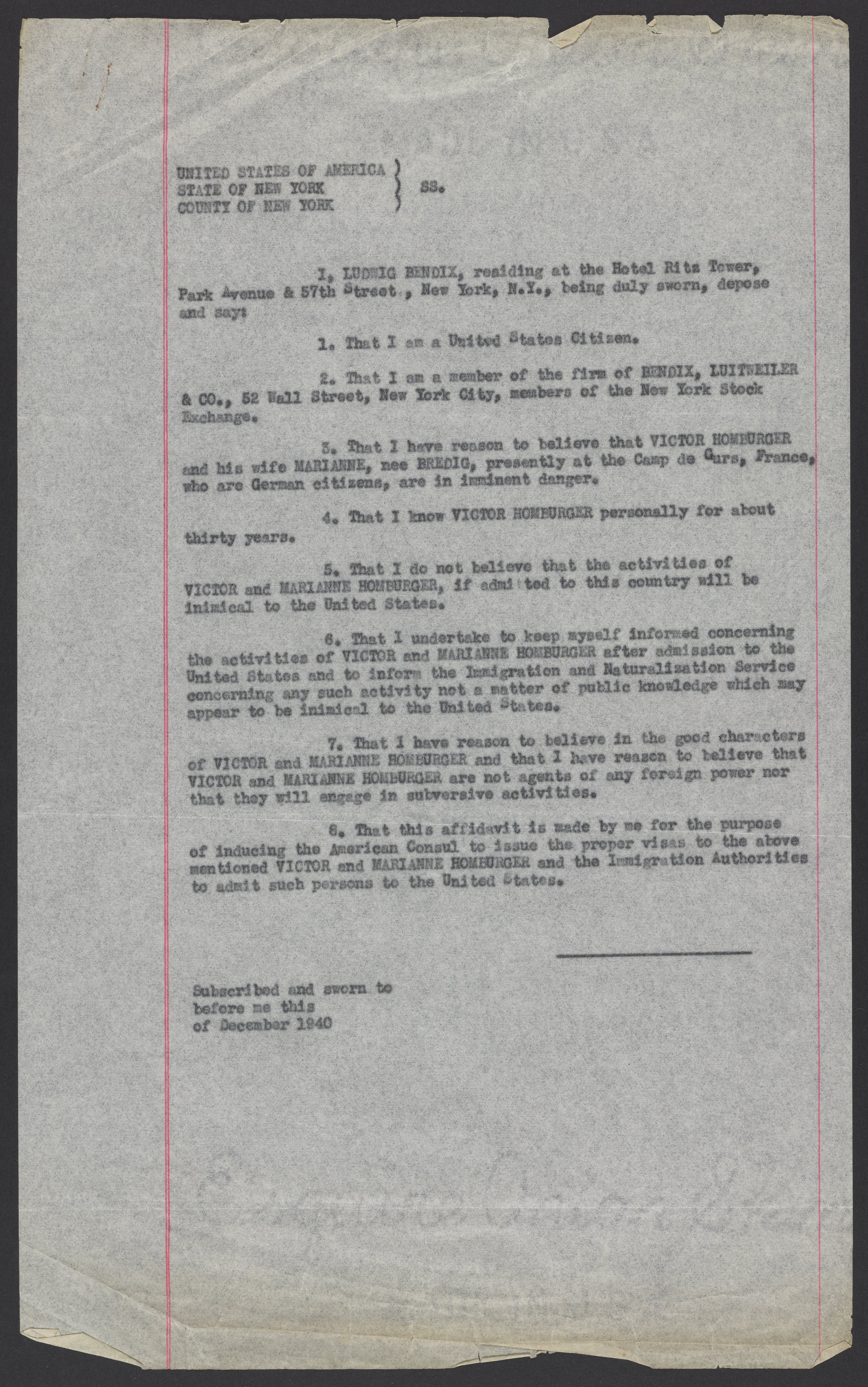 Affidavit for Viktor and Marianne Homburger by Ludwig Bendix