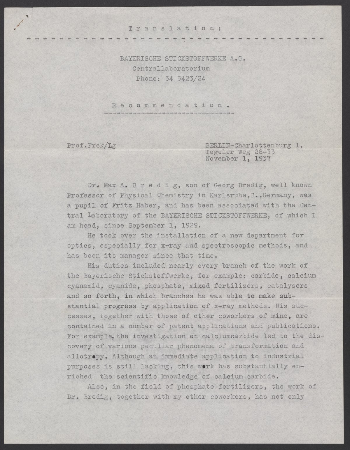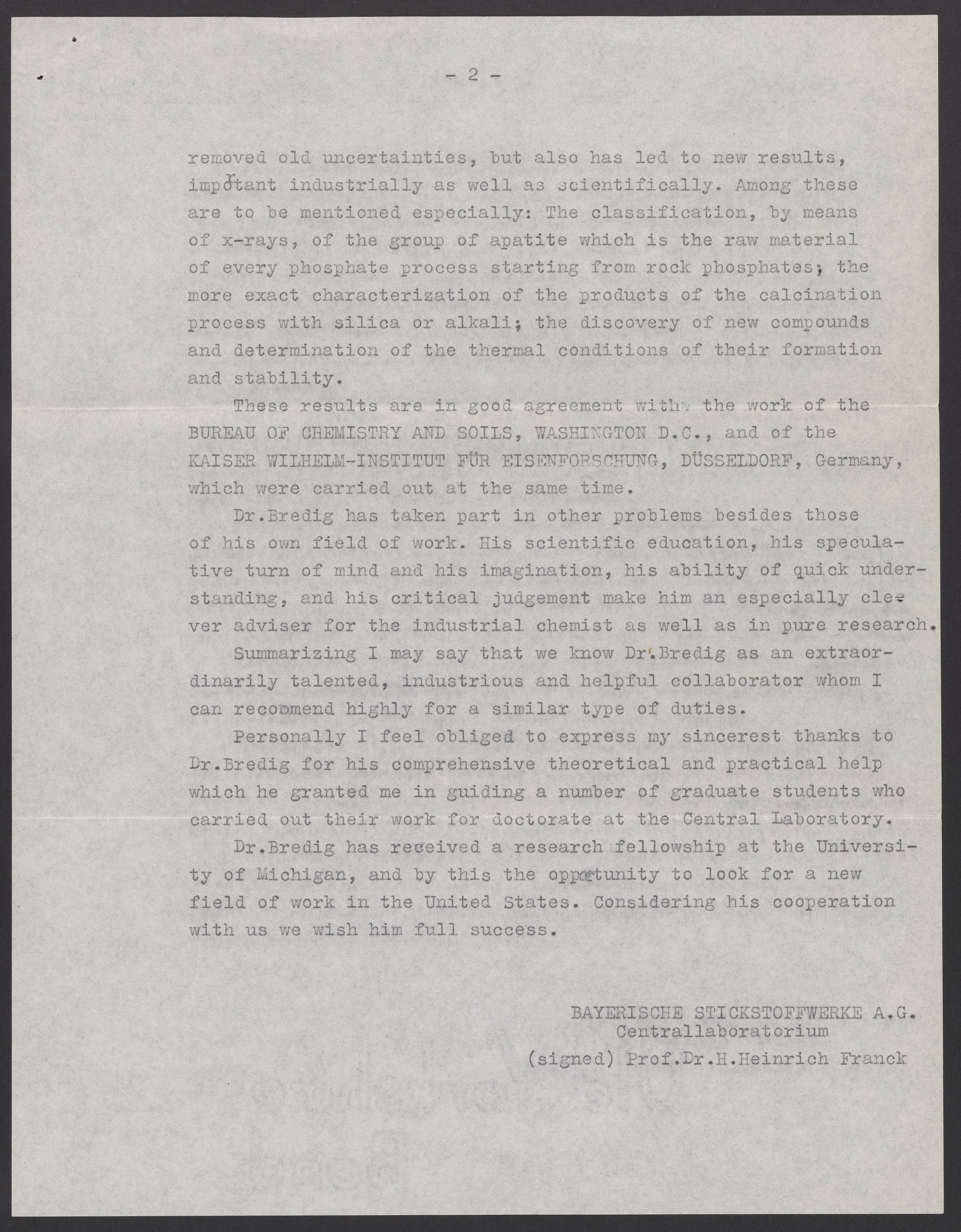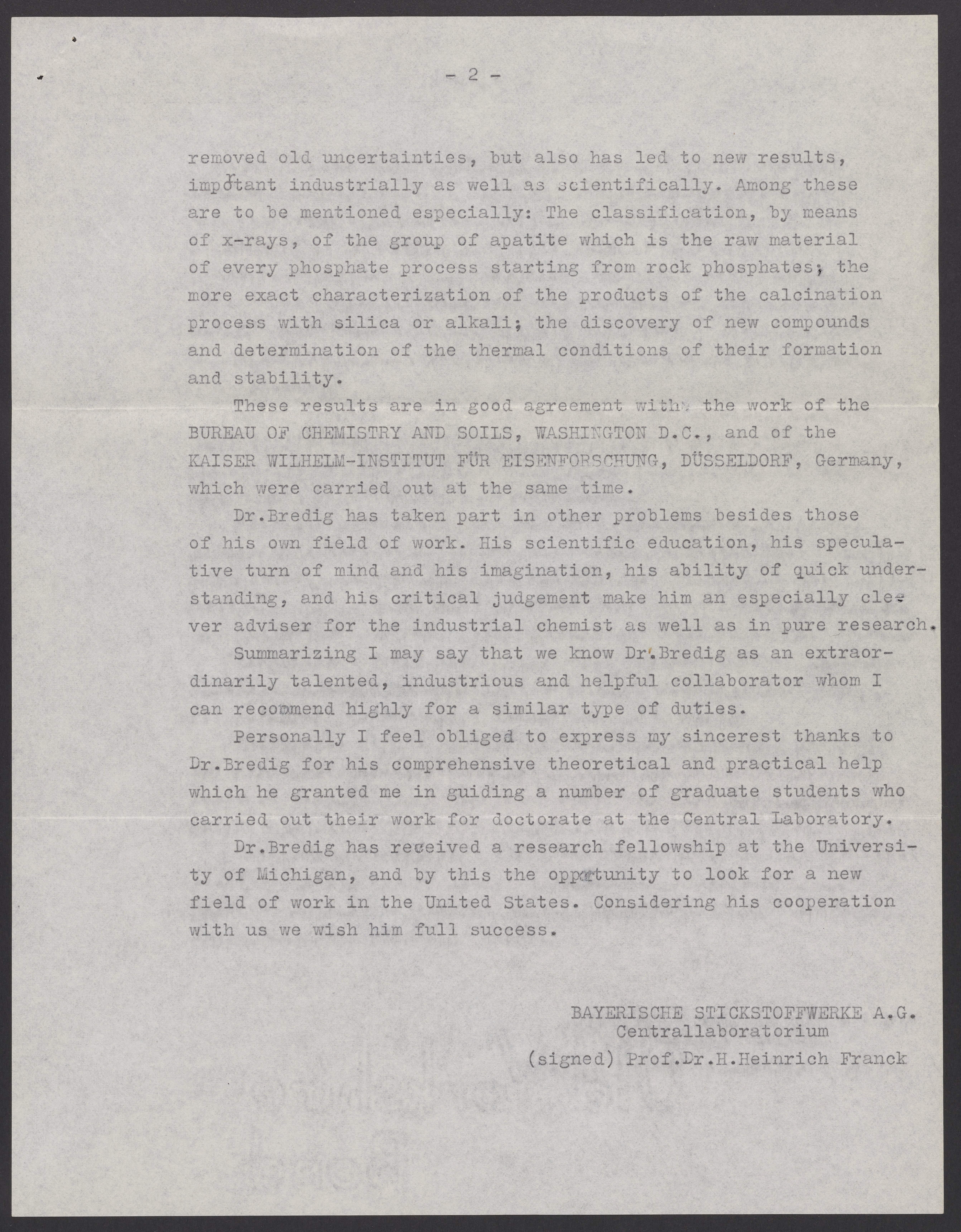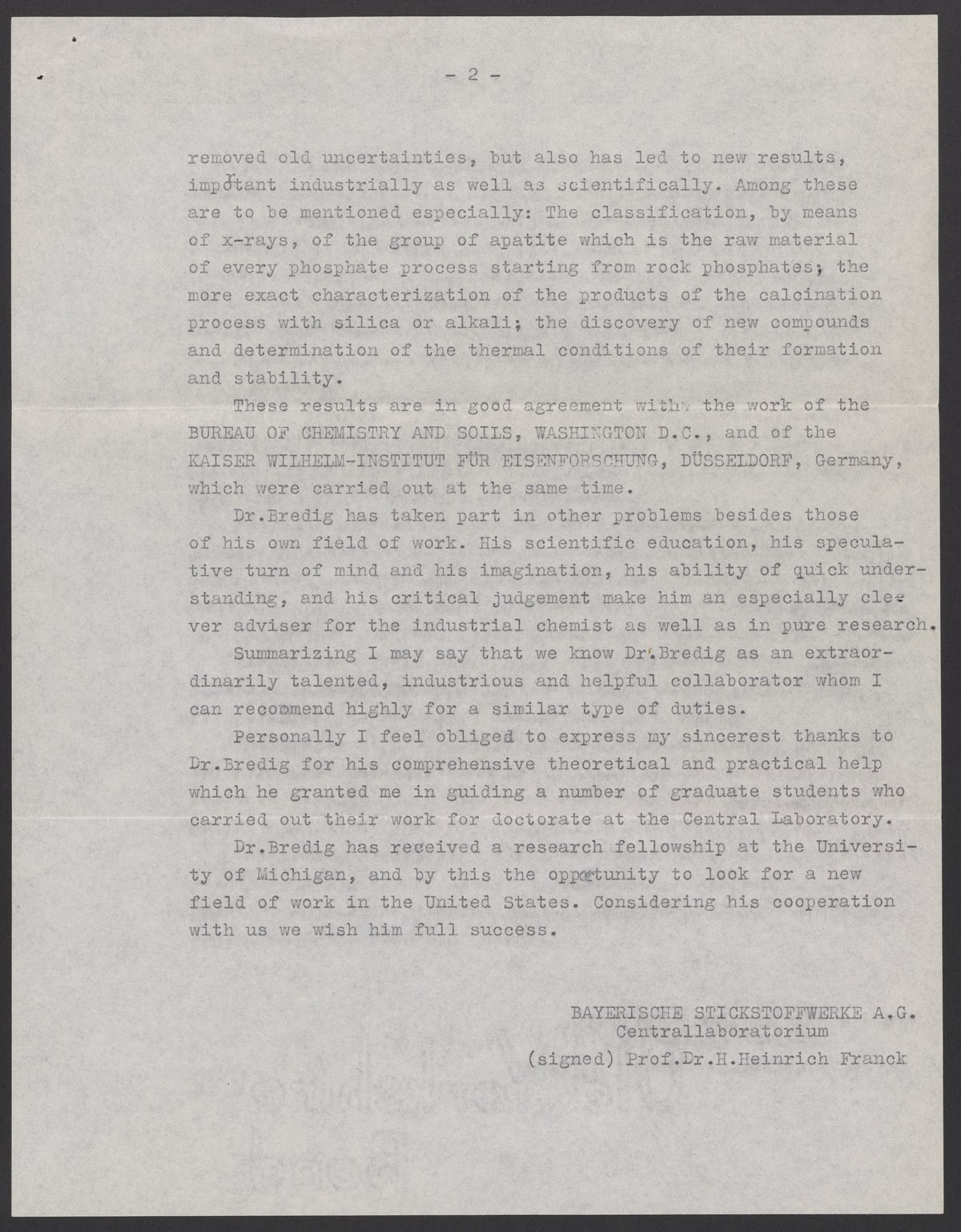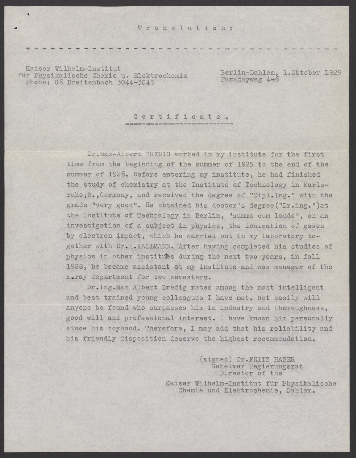 Letter of recommendation and certificate for Max Bredig