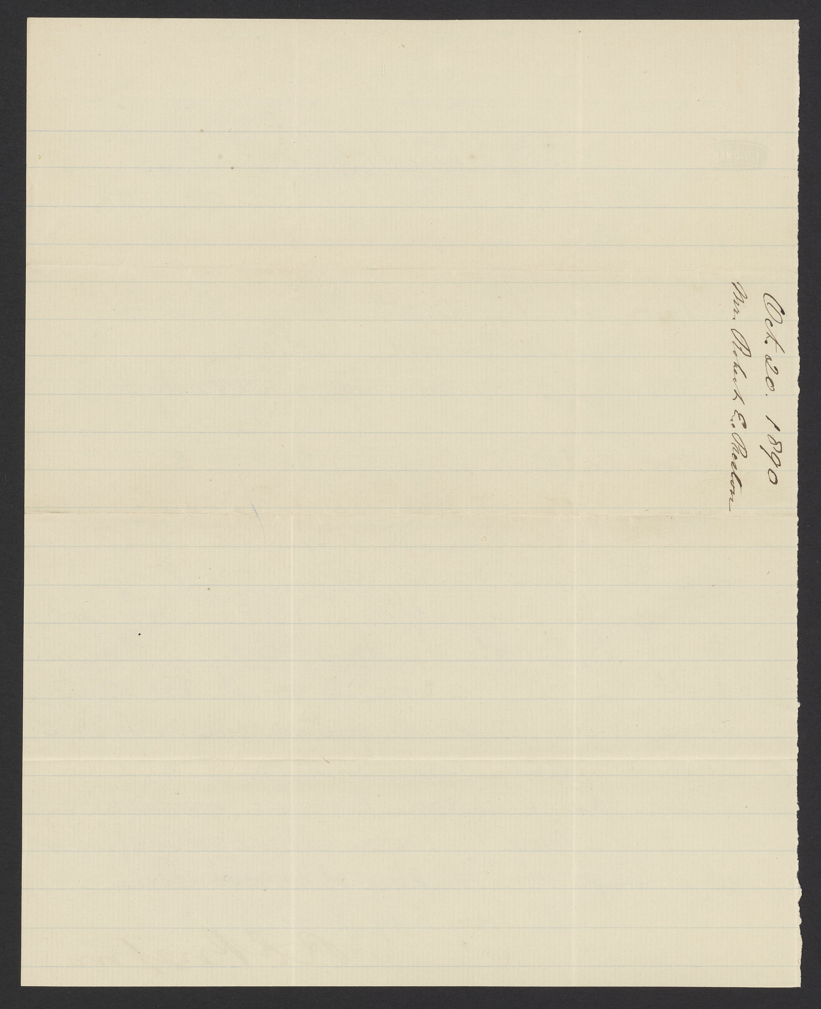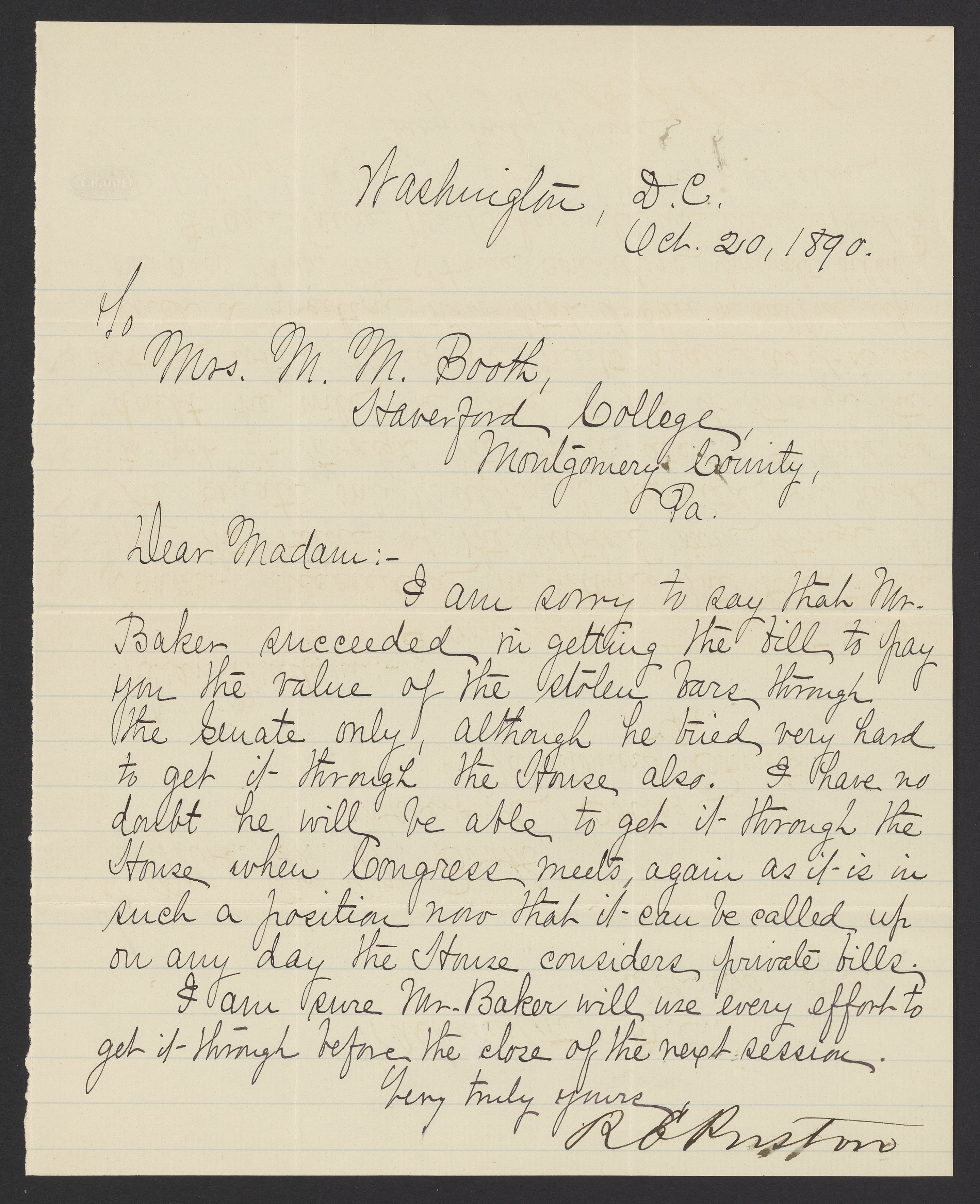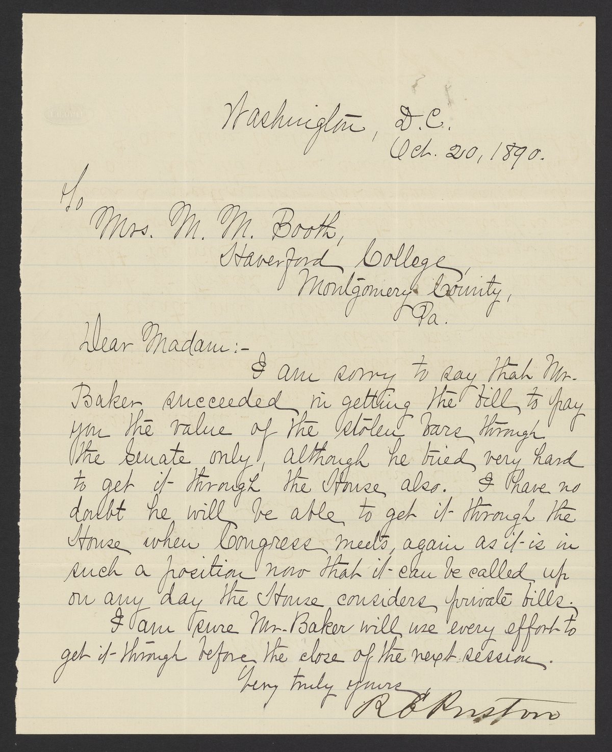 Letter from R.E. Preston to Margaret M. Booth, October 20, 1890