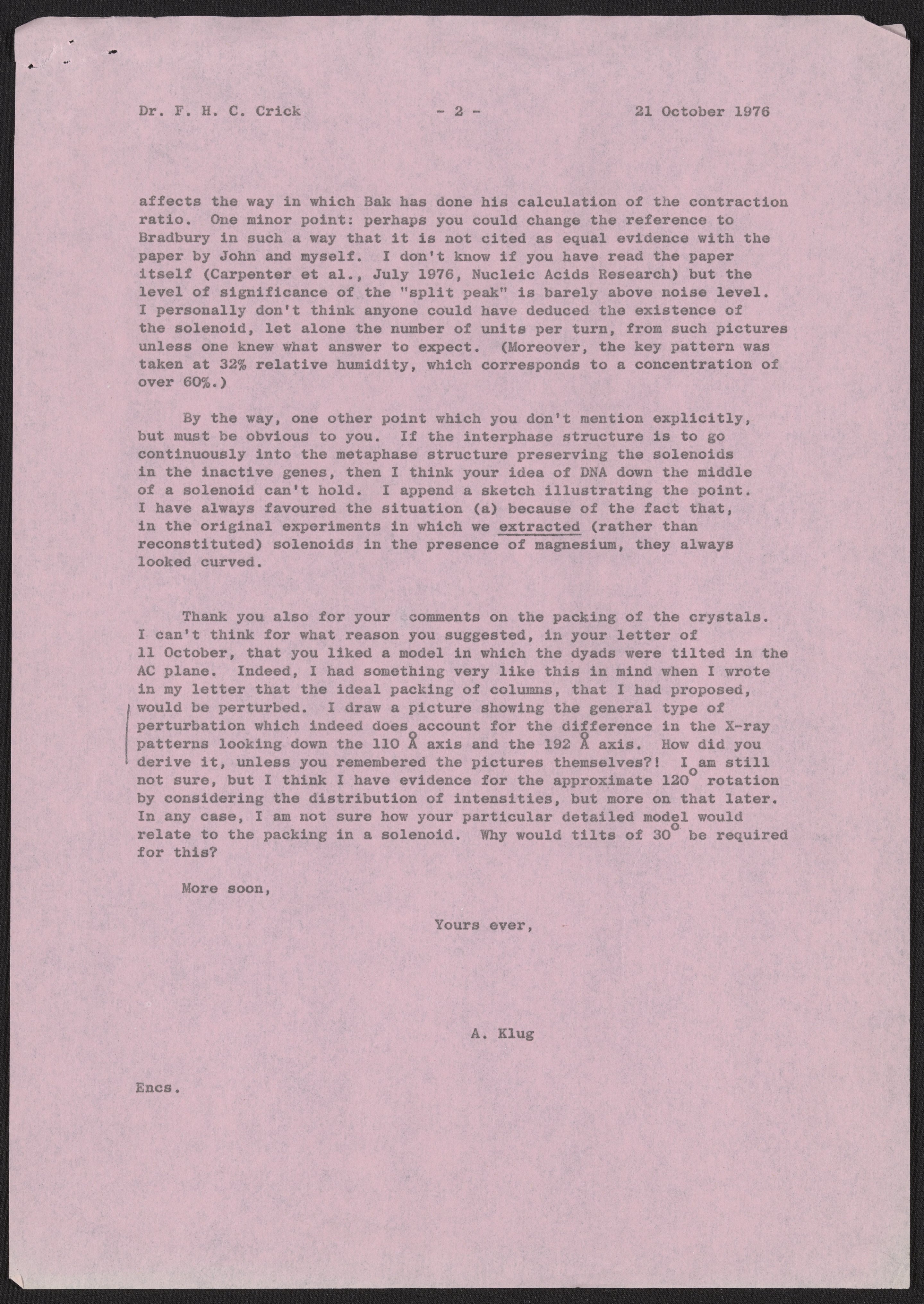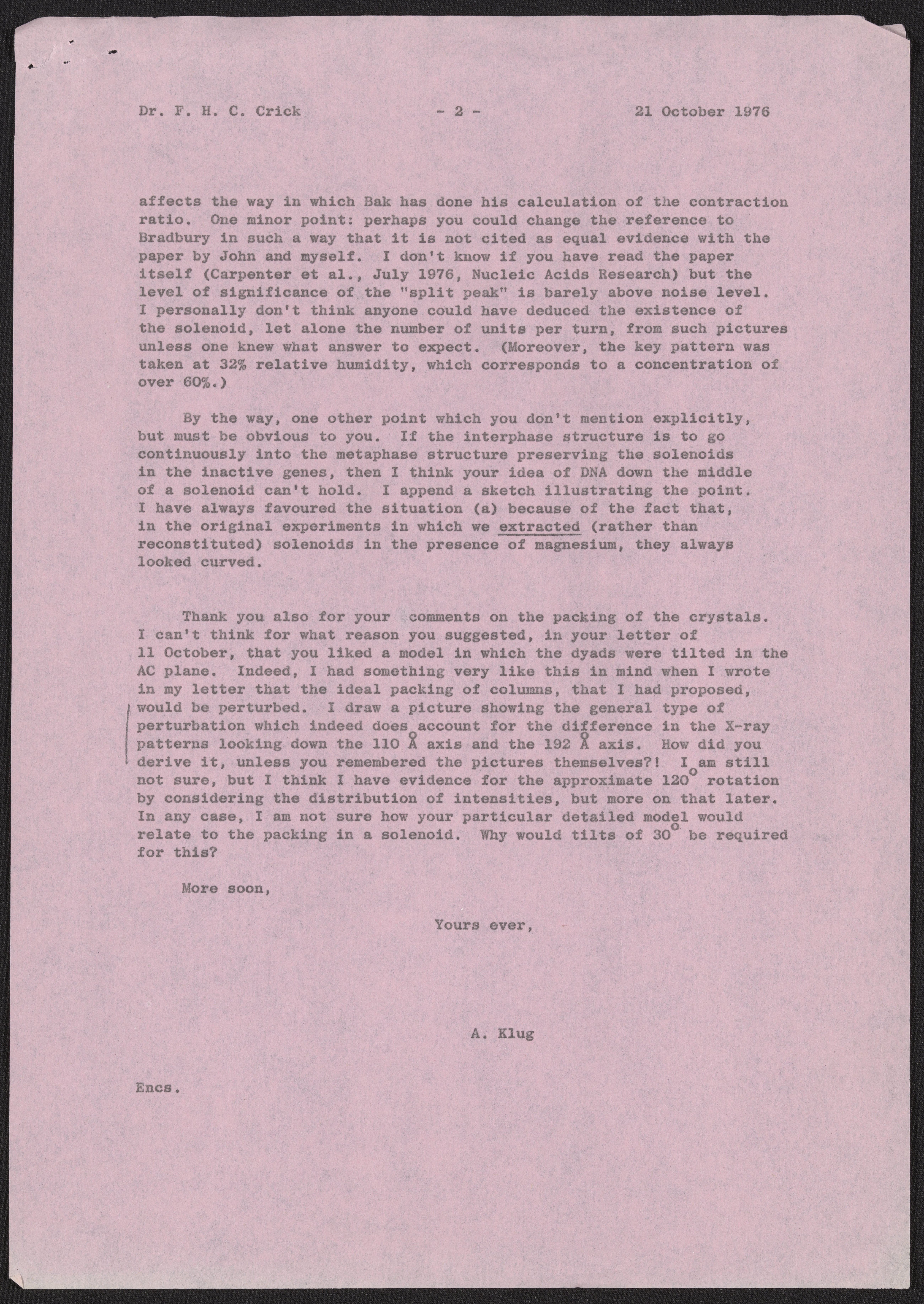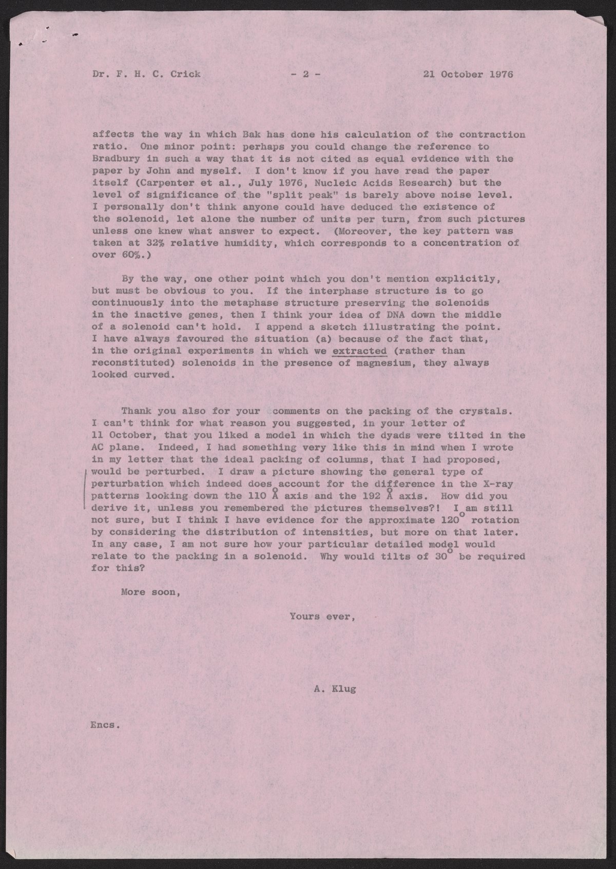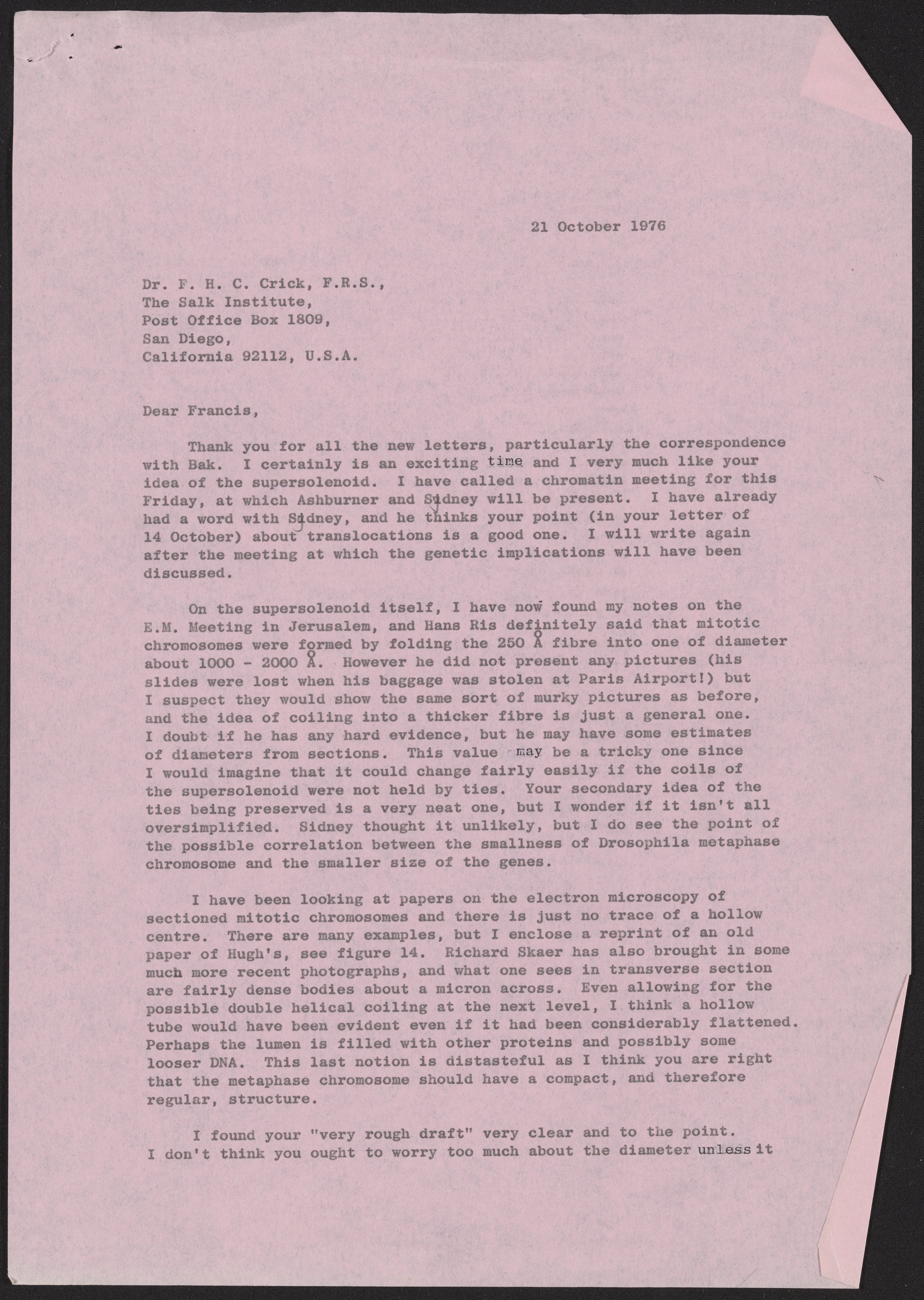 Klug, A. (Aaron), Sir. “Letter from Francis Crick to Aaron Klug, October 21, 1976,” October 21, 1976. History of Molecular Biology Collection, Box 10, Folder 25. Science History Institute. Philadelphia. https://digital.sciencehistory.org/works/gxggqd1.