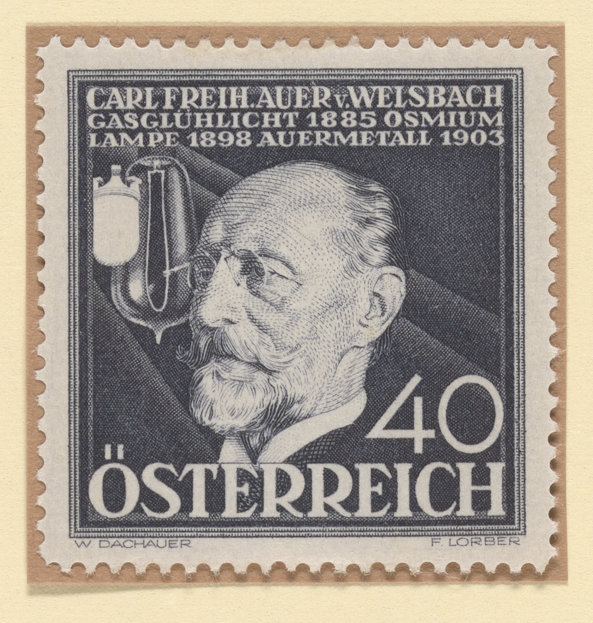 Dachauer, Wilhelm, and Ferdinand Lorber Lorber. “Austrian Stamp Commemorating Carl Auer Von Welsbach,” 1936. Witco Stamp Collection, Box 7. Science History Institute. Philadelphia. https://digital.sciencehistory.org/works/gyl171o.