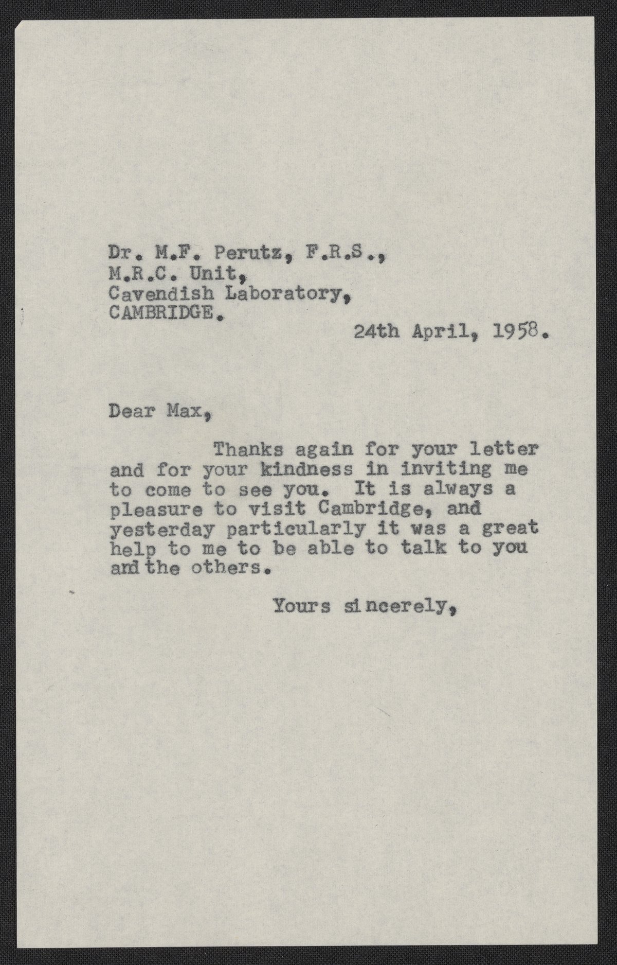 Letter from Aaron Klug to Max Perutz, April 24, 1958