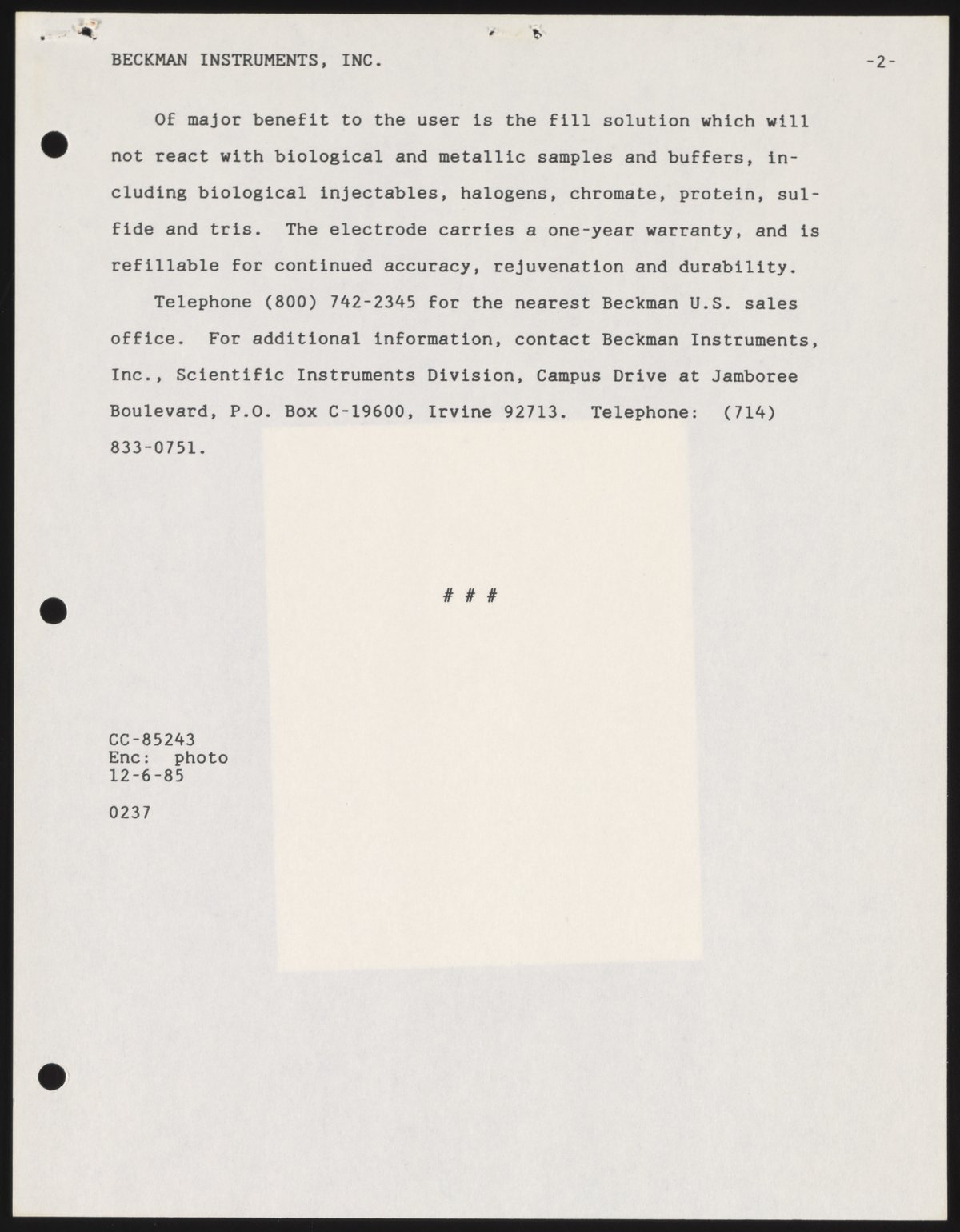 Eastman, Elke. “Beckman Introduces New Test-Tube Size Electrodes,” December 6, 1985. Beckman Historical Collection, Box 58, Folder 70. Science History Institute. Philadelphia. https://digital.sciencehistory.org/works/h128nf07s.