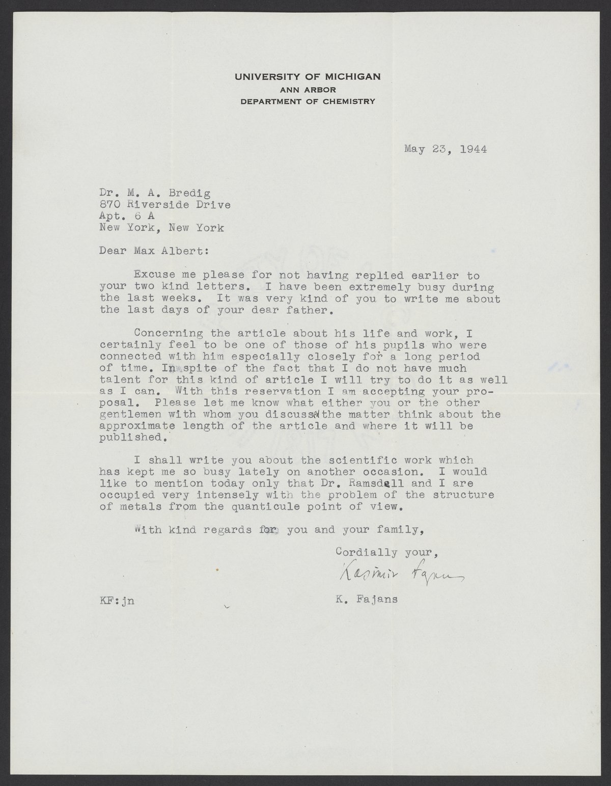 Letter from Kasimir Fajans to Max Bredig, May 23, 1944