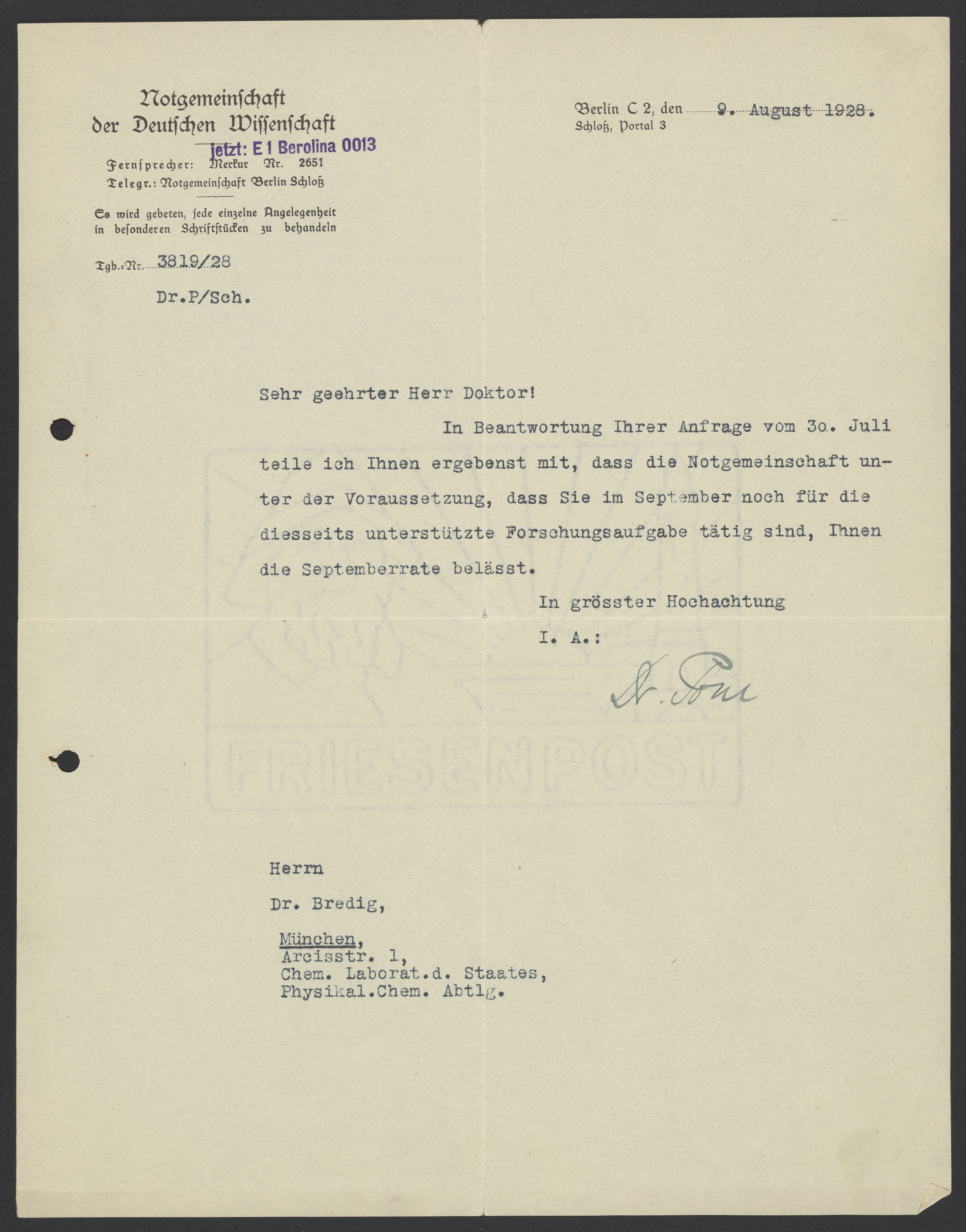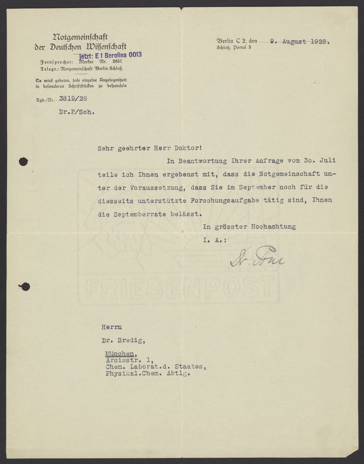 Letter from Robert Wichard Pohl to Max Bredig, August 9, 1928