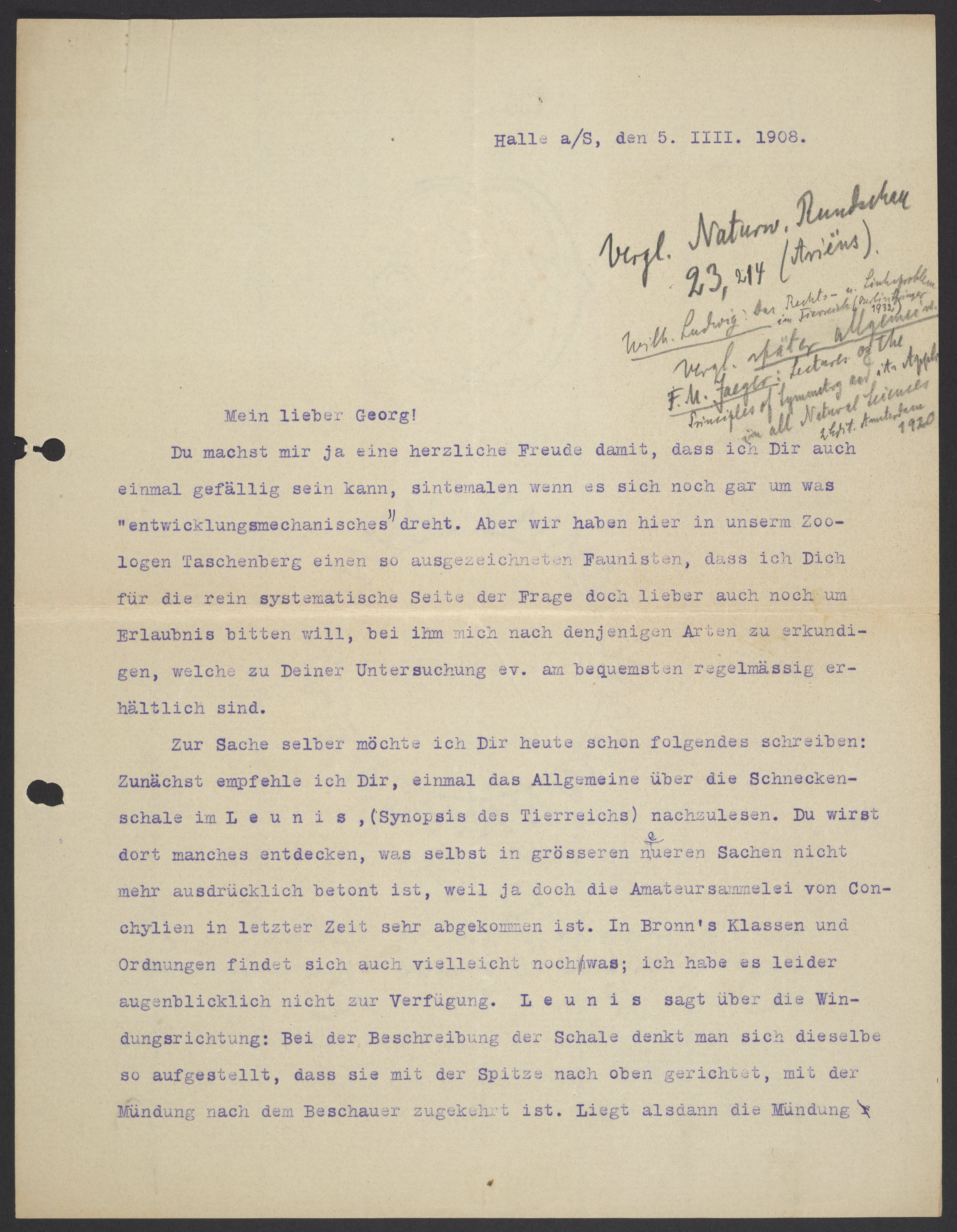 Du machst mir ja eine herzliche Freude damit, dass ich Dir auch einmal gefällig sein kann, sintemalen wenn es sich noch gar um was „entwicklungsmechanisches“ dreht. Aber wir haben hier in unserem Zoologen Taschenberg einen so ausgezeichneten Faunisten, dass ich Dich für die rein systematische Seite der Frage doch lieber auch noch um Erlaubnis bitten will, bei ihm mich nach denjenigen Arten zu erkundigen, welche zu Deiner Untersuchung ev. am bequemsten regelmässig erhältlich sind.