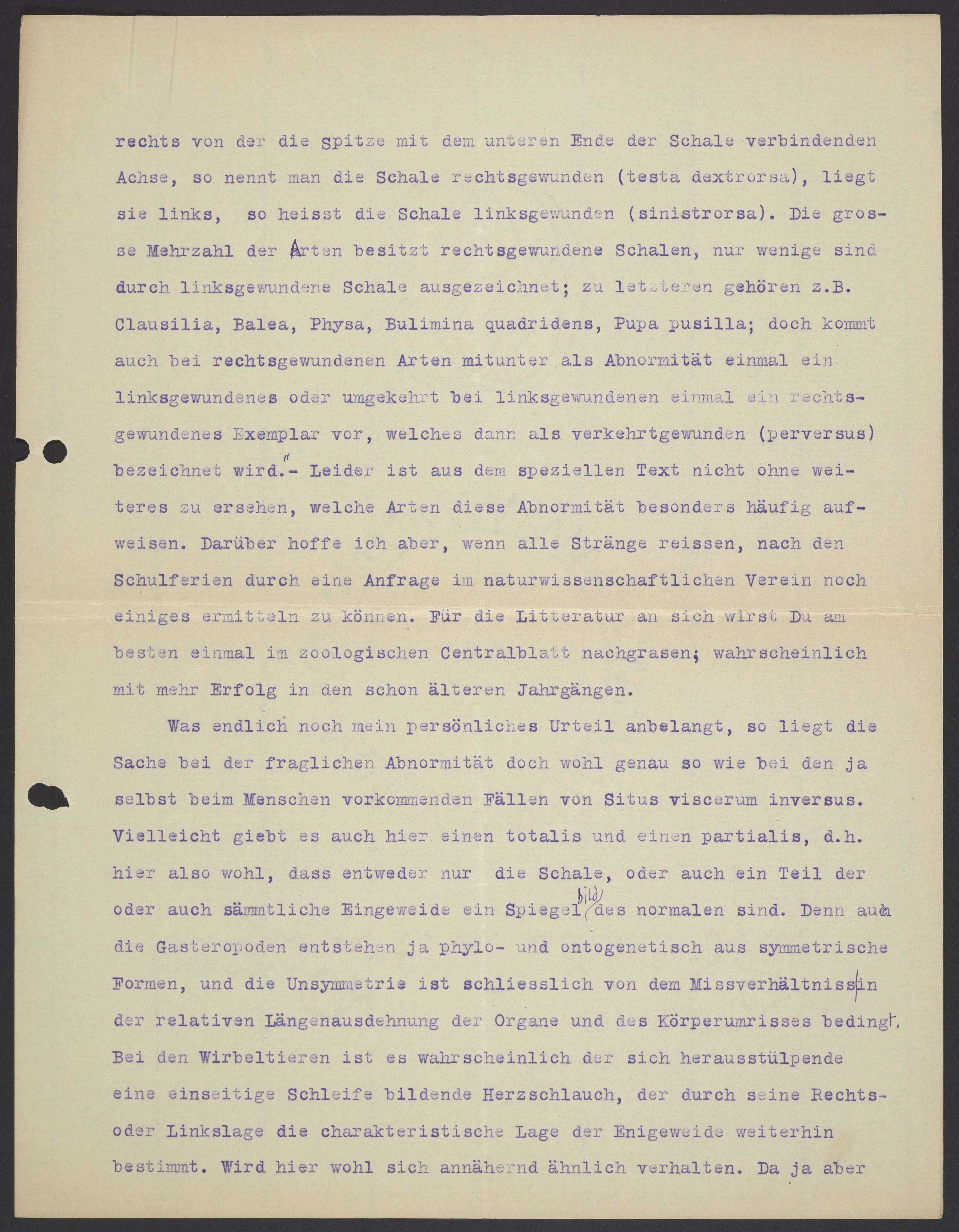 rechts von der Spitze mit dem unteren Ende der Schale verbindenden Achse, so nennt man die Schale rechtsgewunden (testa dextrorsa), liegt sie links, so heisst die Schale linksgewunden (sinistrorsa). Die grosse Mehrzahl der Arten besitzt rechtsgewundene Schalen, nur wenige sind durch linksgewundene Schale ausgezeichnet; zu letzteren gehören z.B. Clausilla, Balea, Physa, Bulimina quadriens, Pupa pusilla; doch kommt auch bei rechtsgewundenen Arten mitunter als Abnormität einmal ein linksgewundene oder umgekehrt bei linksgewundenen einmal ein rechtsgewundenes Exemplar vor, welches dann als verkehrtgewunden (perversus) bezeichnet wird. – Leider ist aus dem speziellen Text nicht ohne weiteres zu ersehen, welche Arten diese Abnormitaet besonders häufig aufweisen. Darüber hoffe ich aber, wenn alle Stränge reissen, nach den Schulferien durch eine Anfrage im naturwissenschaftlichen Verein noch einiges ermitteln zu können. Für die Litteratur an sich wirst Du am besten einmal im zoologischen Centralblatt nachgrasen; wahrscheinlich mit mehr Erfolg in den schon älteren Jahrgängen.