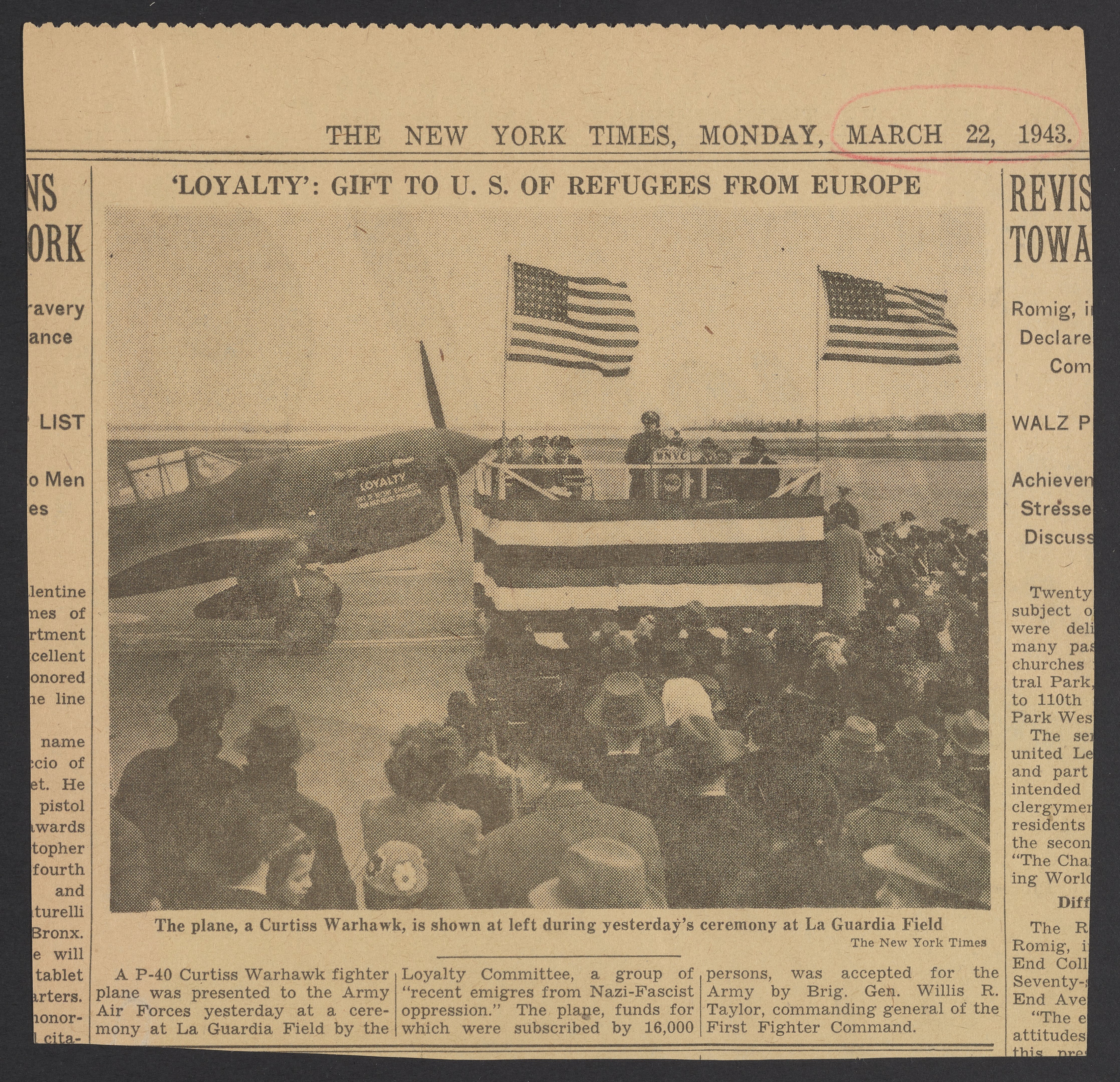 In 1942, a check of 48,000 was presented to Robert M. Lovett, the Secretary of War of the United States, to purchase a fighter plane named Loyalty. In 1943 the fighter plan was presented at La Guardia Field.