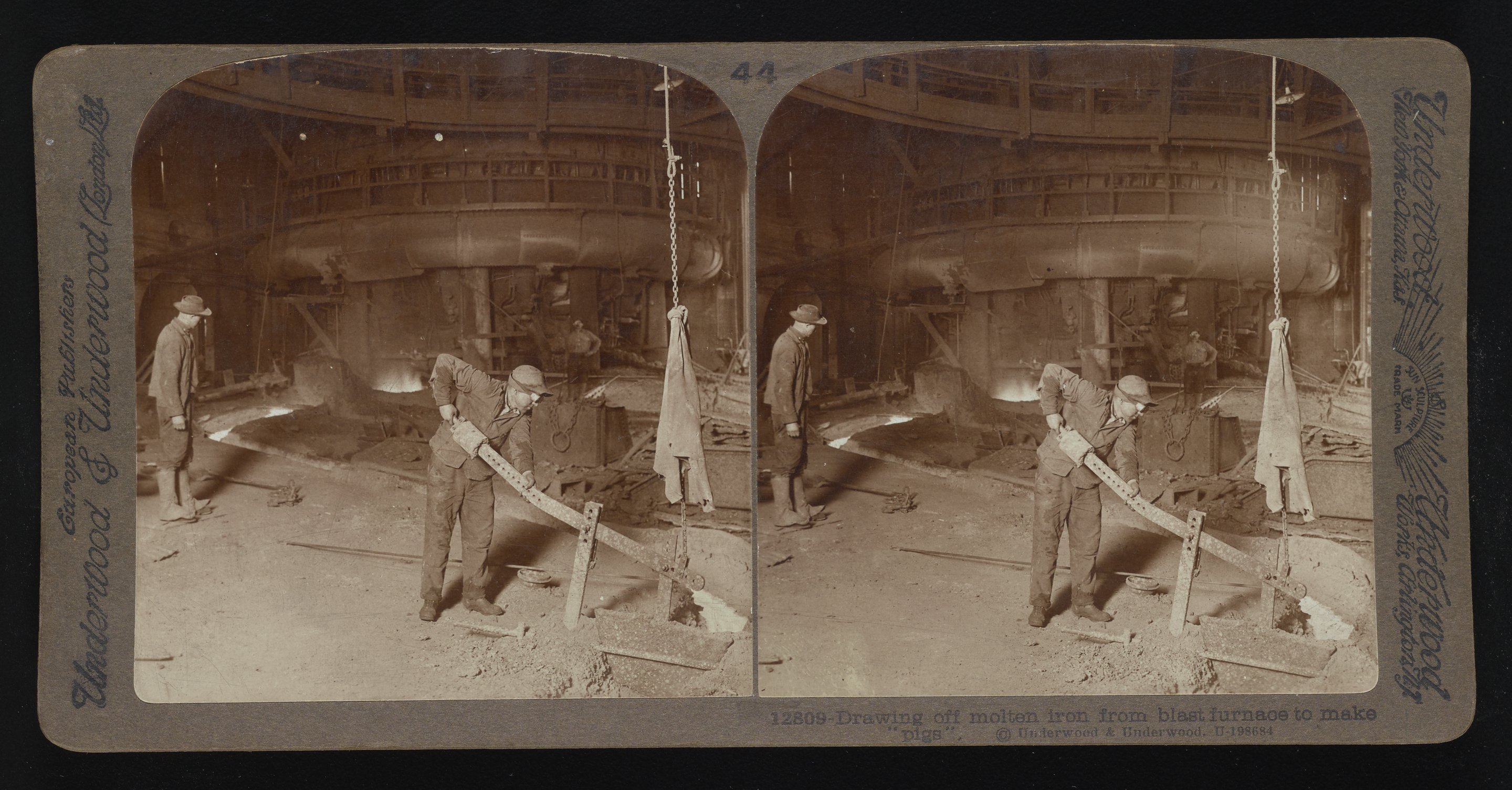 “Drawing off Molten Iron from Blast Furnace to Make ‘Pigs.’” Underwood & Underwood, n.d. Underwood & Underwood Stereographs of Manufacturing Industries. Science History Institute. Philadelphia. https://digital.sciencehistory.org/works/h415p9546.