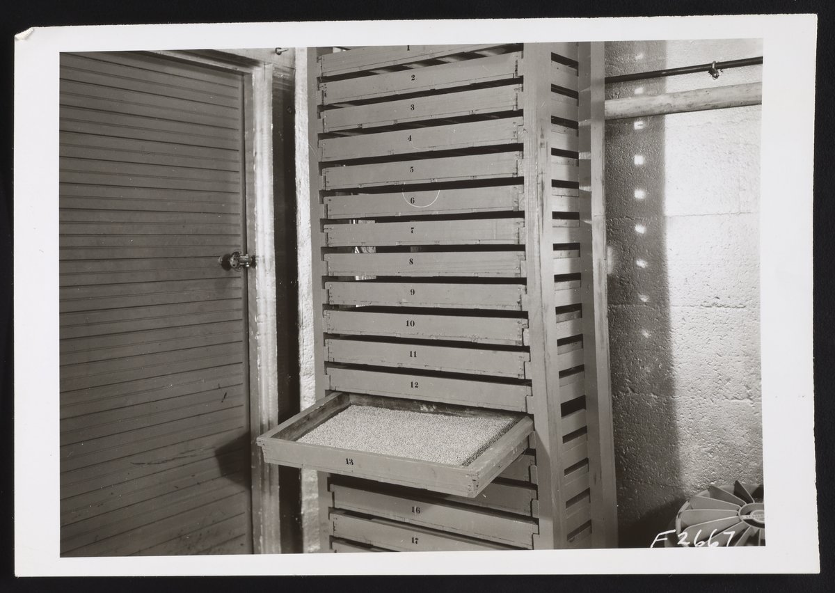 General view of the trays used to expose fertilizer to humidity in the Air Control Room at the U.S. Department of Agriculture's Agricultural Engineering Laboratory.