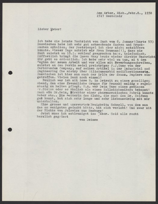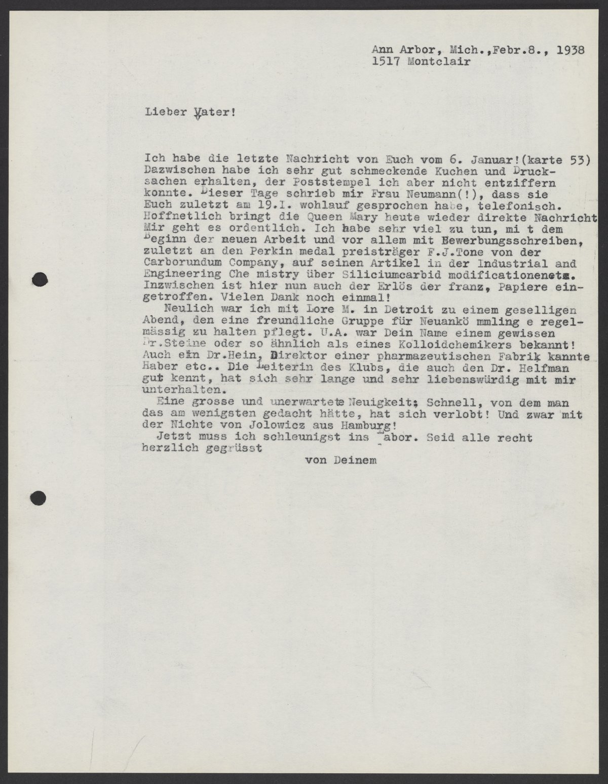 Ich habe die letzte Nachricht von Euch vom 6. Januar! (karte 53) Dazwischen habe ich sehr gut schmeckende Kuchen und Drucksachen erhalten, der Poststempel ich aber nicht entziffern konnte. Dieser Tage schrieb mir Frau Neumann (!), dass sie Euch zuletzt am 19.1. wohlauf gesprochen habe, telefonisch. Hoffentlich bringt die Queen Mary heute wieder direkte Nachricht. Mir geht es ordentlich. Ich habe sehr viel zu tun, mit dem Beginn der neuen Arbeit und vor allem mit Bewerbungsschreiben, zuletzt an den Perkin Medal Preisträger F.J. Tone von der Carborundum Company, auf seinen Artikel in der Industrial and Engineering Chemistry über Silicumcarbid Modificationenetz. Inzwischen ist hier nun auch der Erlös der franz, Papieren eingetroffen. Vielen Dank noch einmal!