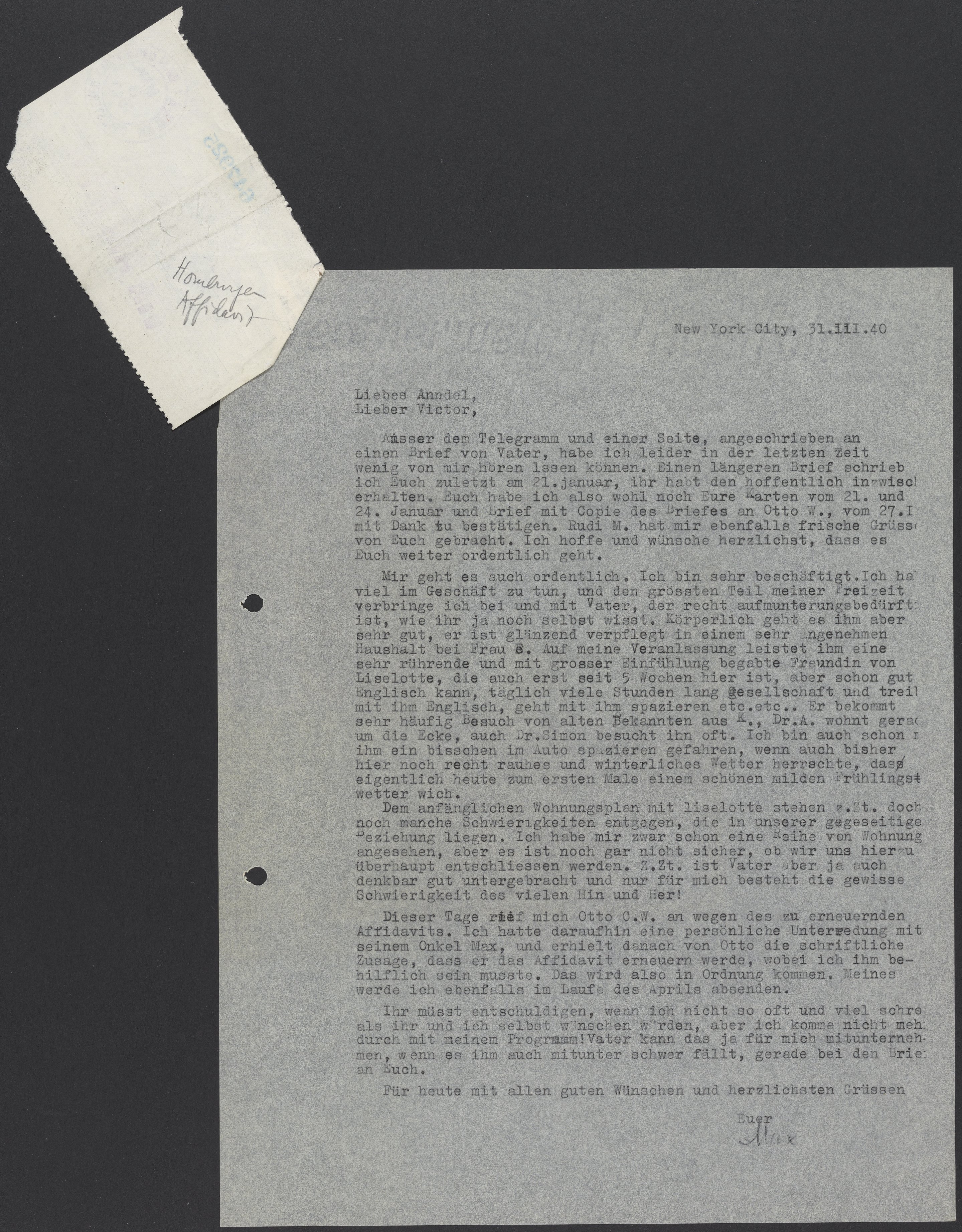 Dieser Tage rief mich Otto C.W. an wegen des zu erneuernden Affidavits. Ich hatte daraufhin eine persönliche Unterredung mit seinem Onkel Max, und erhielt danach von Otto die schriftliche Zusage, dass er das Affidavit erneuern werde, wobei ich ihm behilflich sein musste. Das wird also in Ordnung kommen. Meines werde ich ebenfalls in Laufe des Aprils absenden .